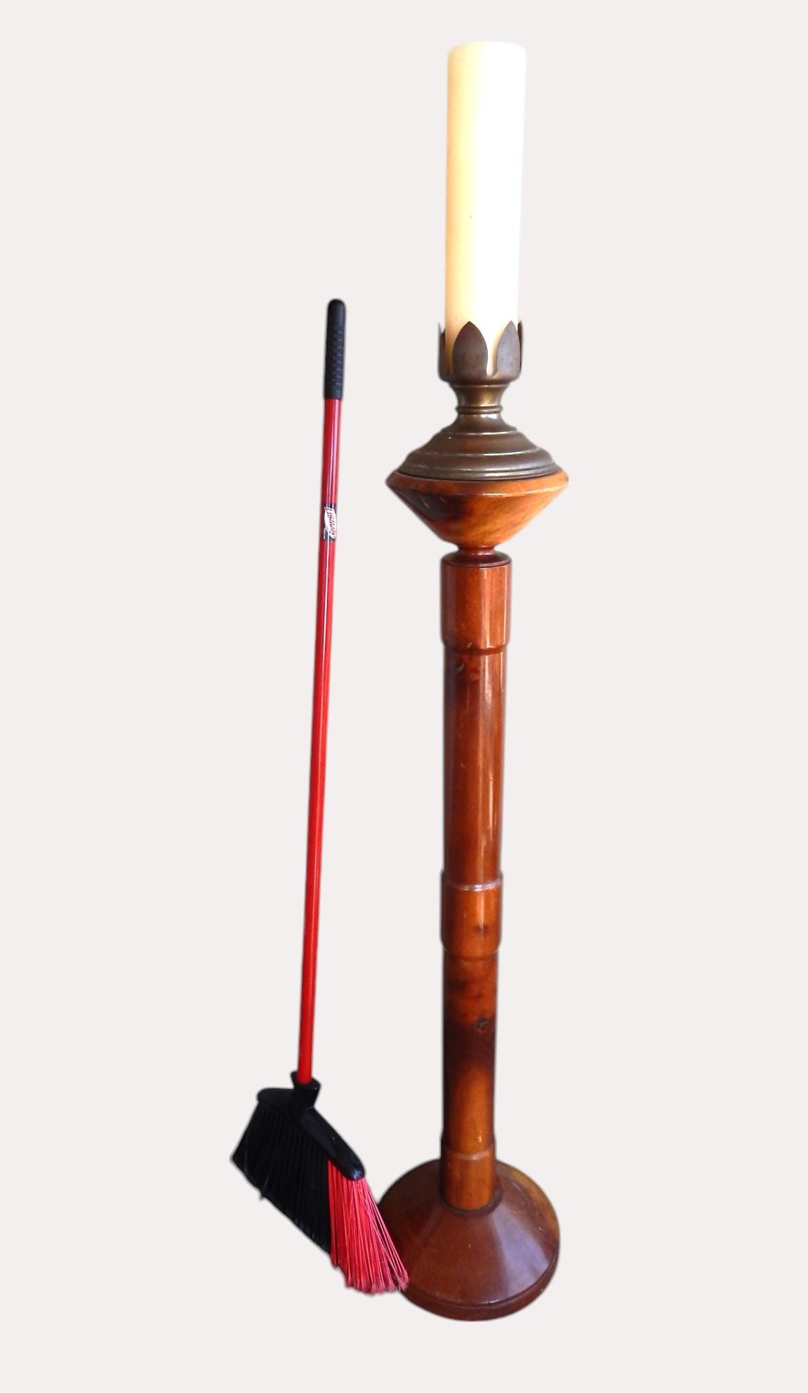 Rare wood type, rare large size, not quite like any candle floor stand we've ever come across. Broom in photo is to show scale. Stands 52" high. Original felt and promotional label on underside of base. No splits or cracks. Expected finish wear as shown. No wobbles. Base is 11" in diameter. Brass capped with holder that will accommodate a 3" diameter candle. No dents or dings. A very striking object and we doubt we'll ever come across another one!