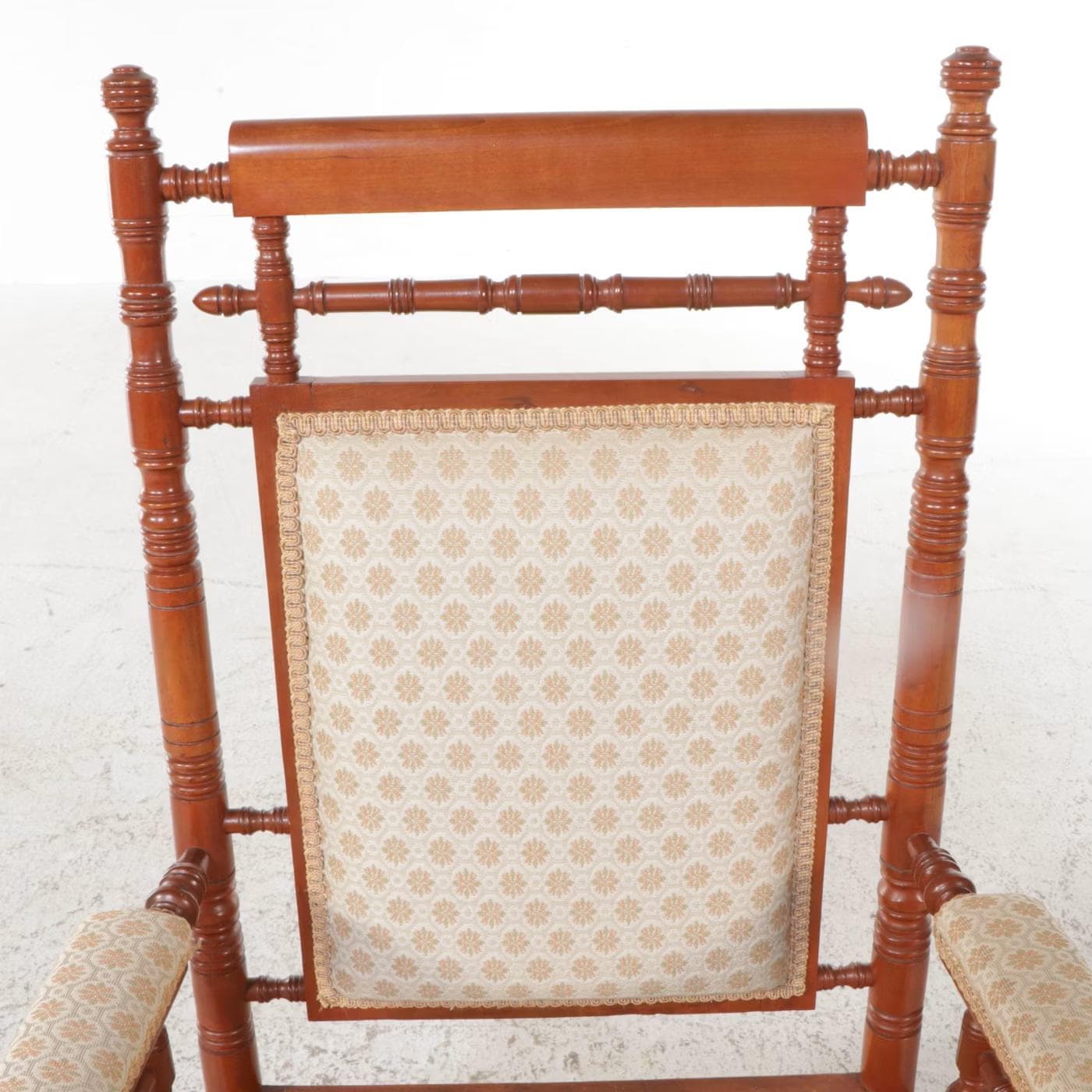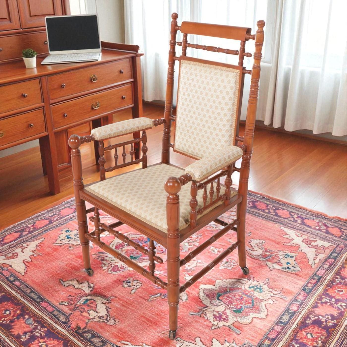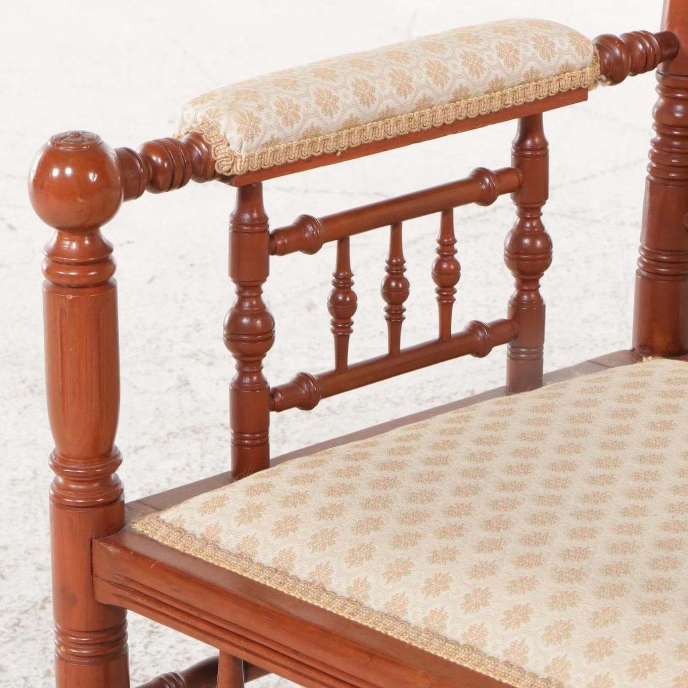 Overall excellent condition antique turned wood Brewster armchair. Style first appearing in New England in the mid 17th century. Minor nicks. Structurally very good. Newer upholstery free of stains or smells. Measures 43.5" H x 24.5 W x 21.5" D