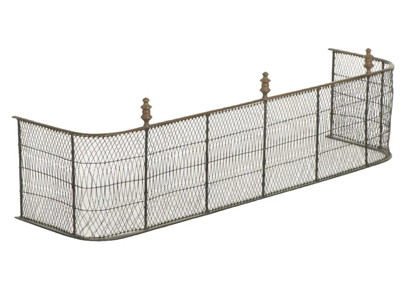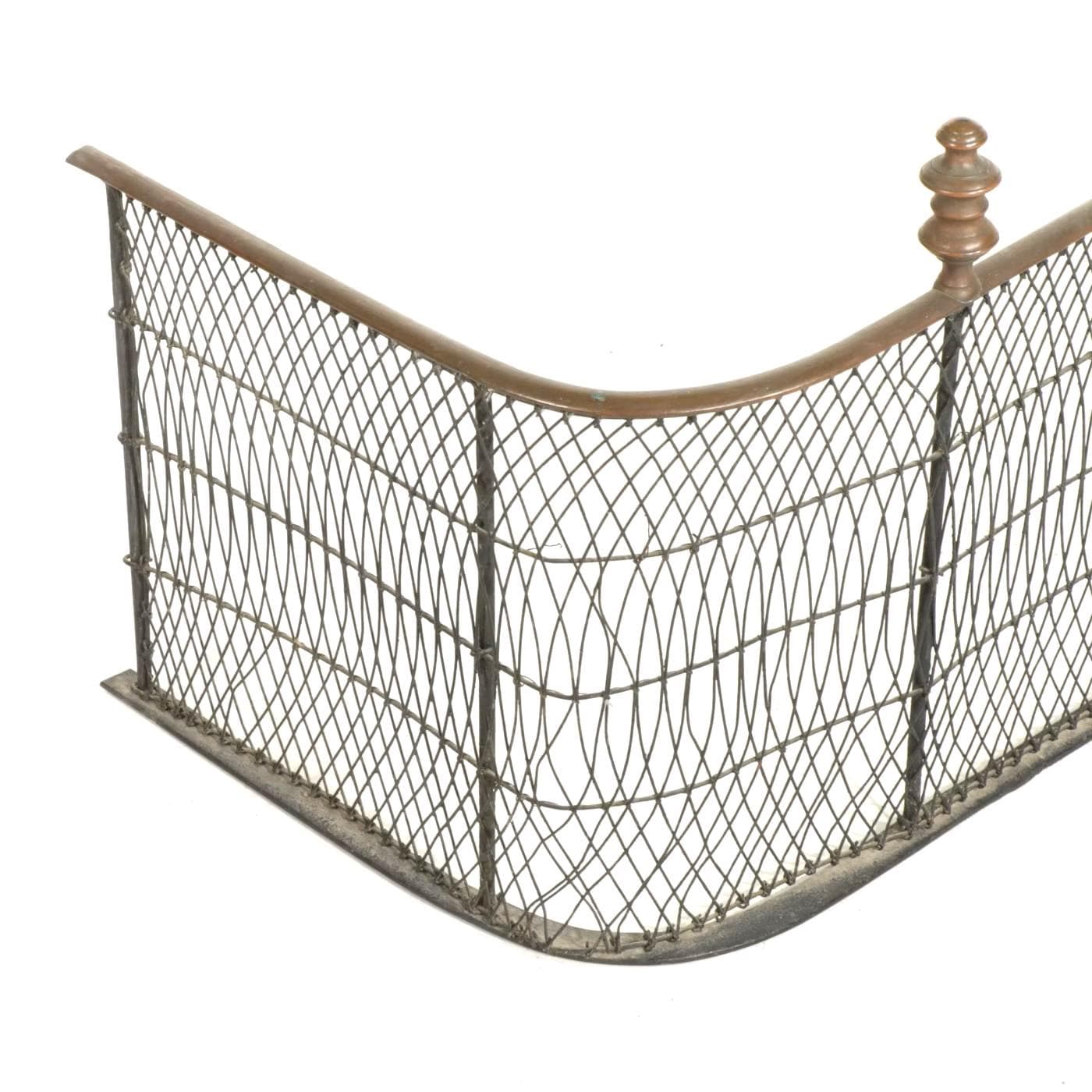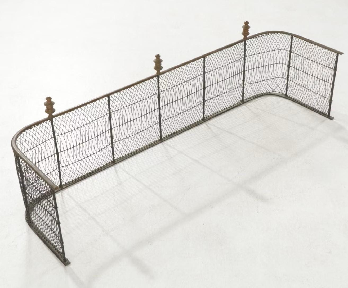 'Federal period' brass, iron, and steel wire fireplace fender, hearth surround dating to the late 1800's. Sold brass top and bottom railing, iron spindles topped by brass finials. In overall very good condition. - some bending to the metal wires on one side as shown in photo; tarnish; minor scratches. Dimensions