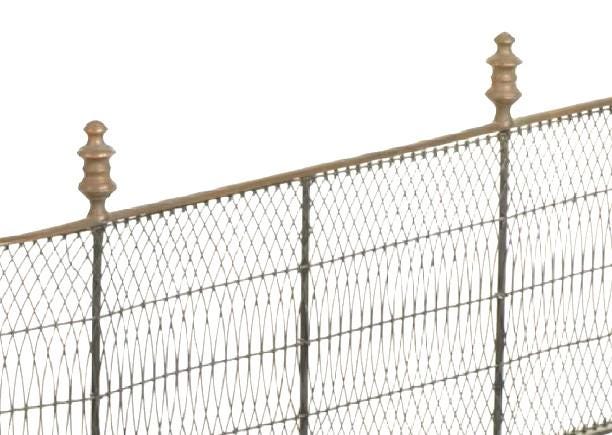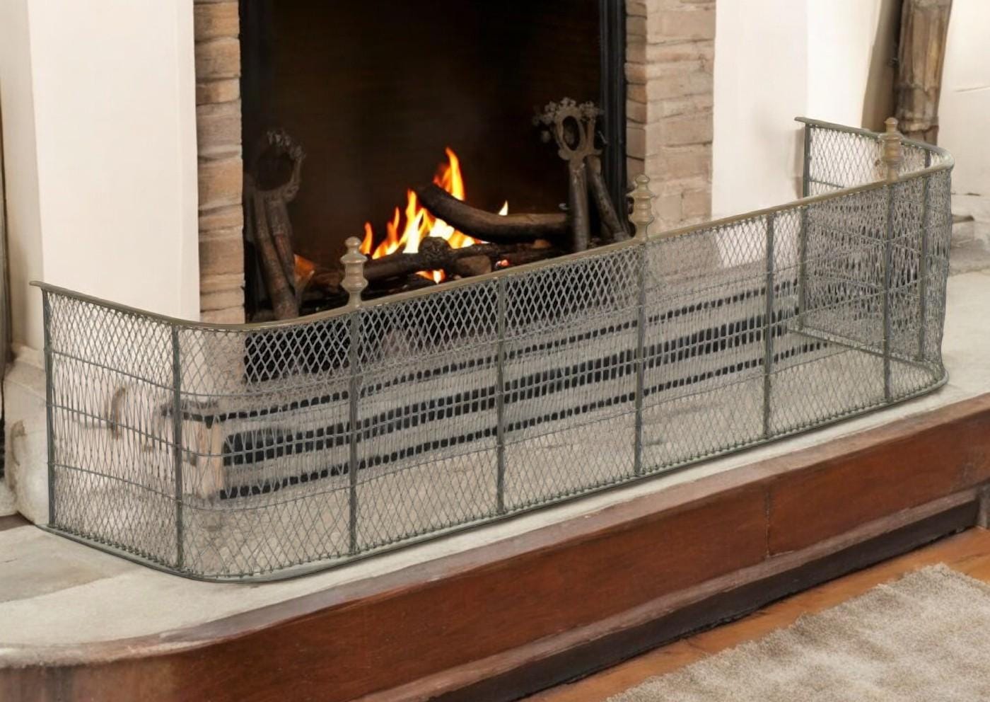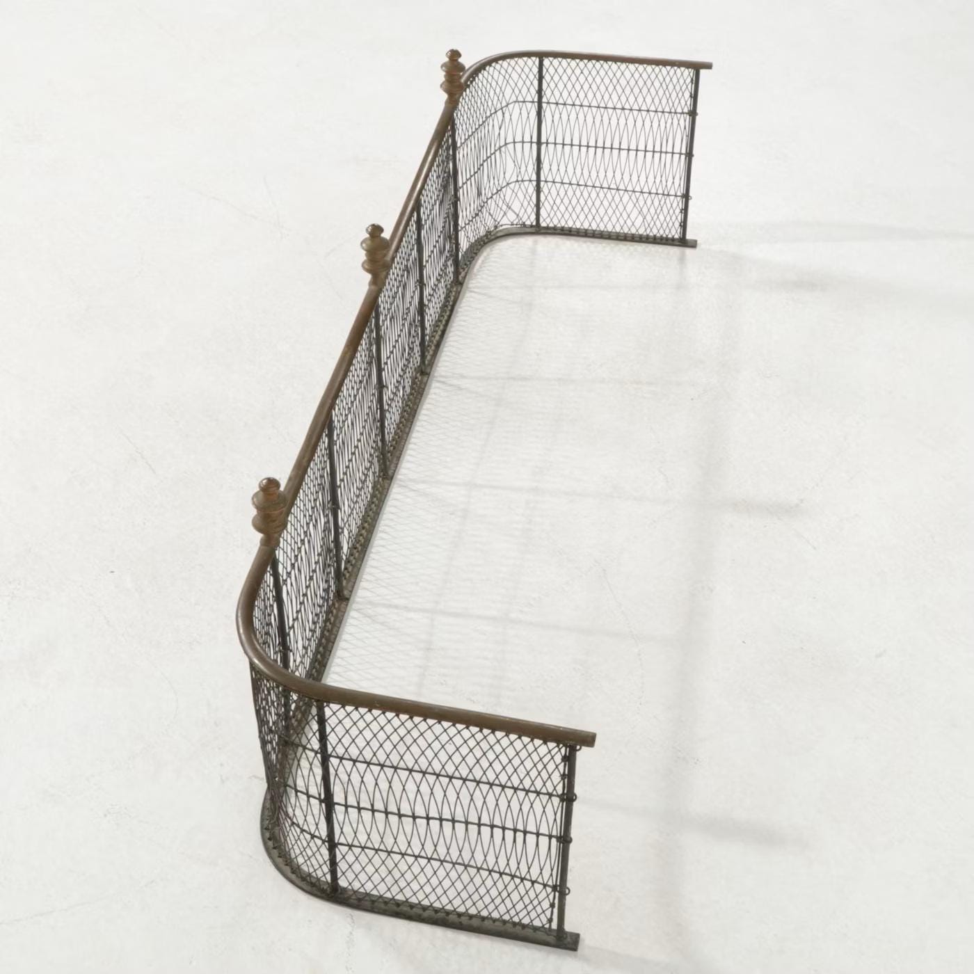 'Federal period' brass, iron, and steel wire fireplace fender, hearth surround dating to the late 1800's. Sold brass top and bottom railing, iron spindles topped by brass finials. In overall very good condition. - some bending to the metal wires on one side as shown in photo; tarnish; minor scratches. Dimensions