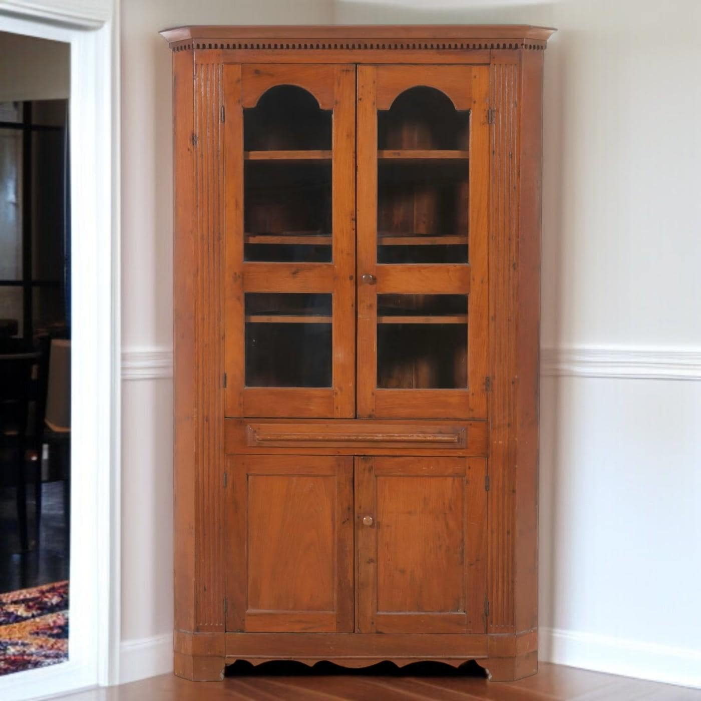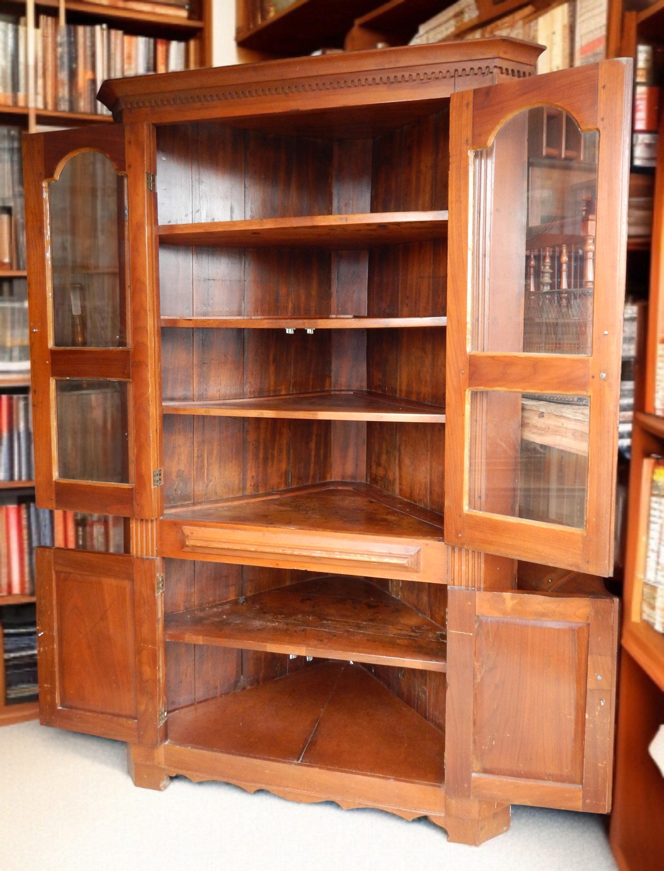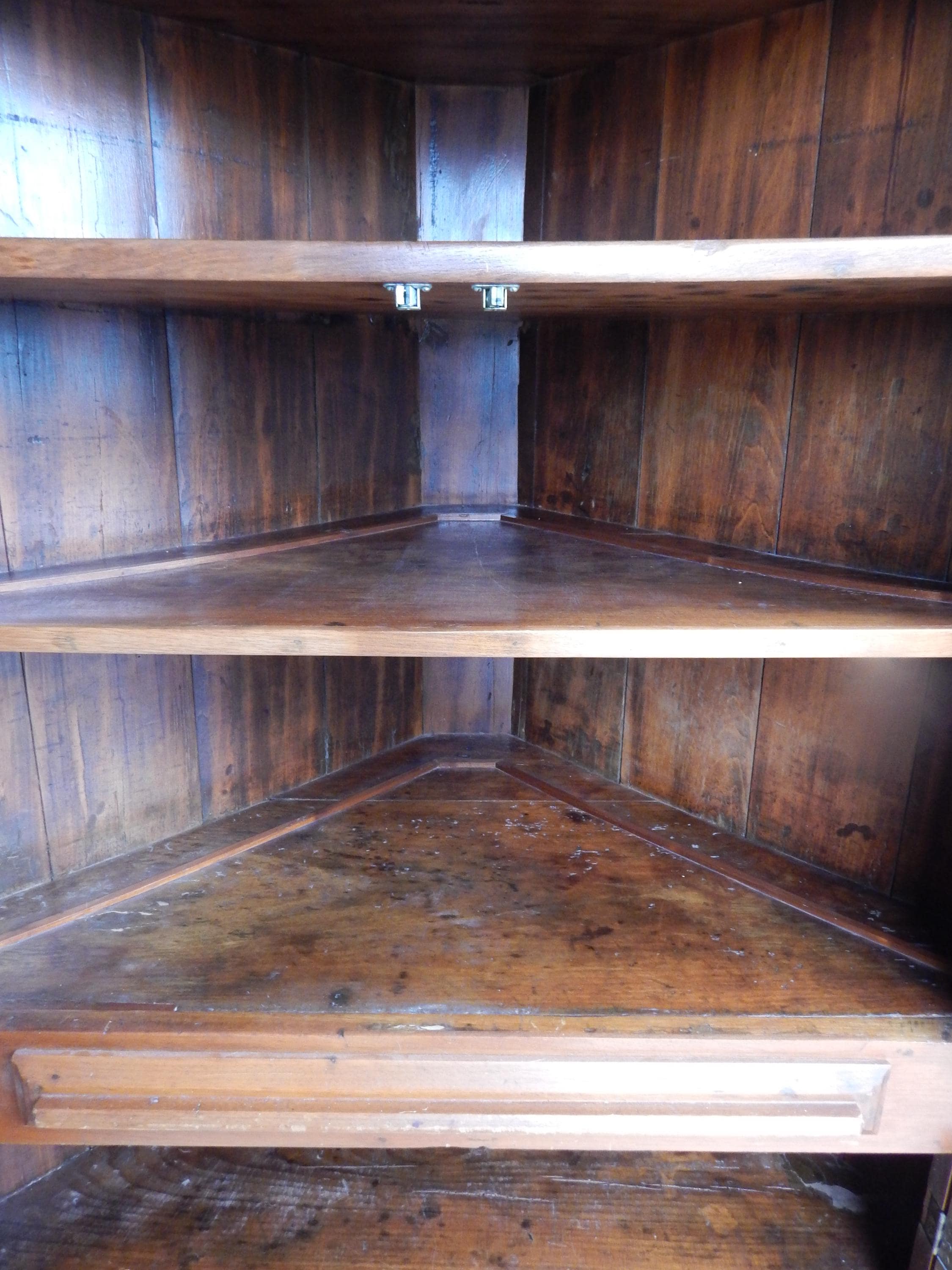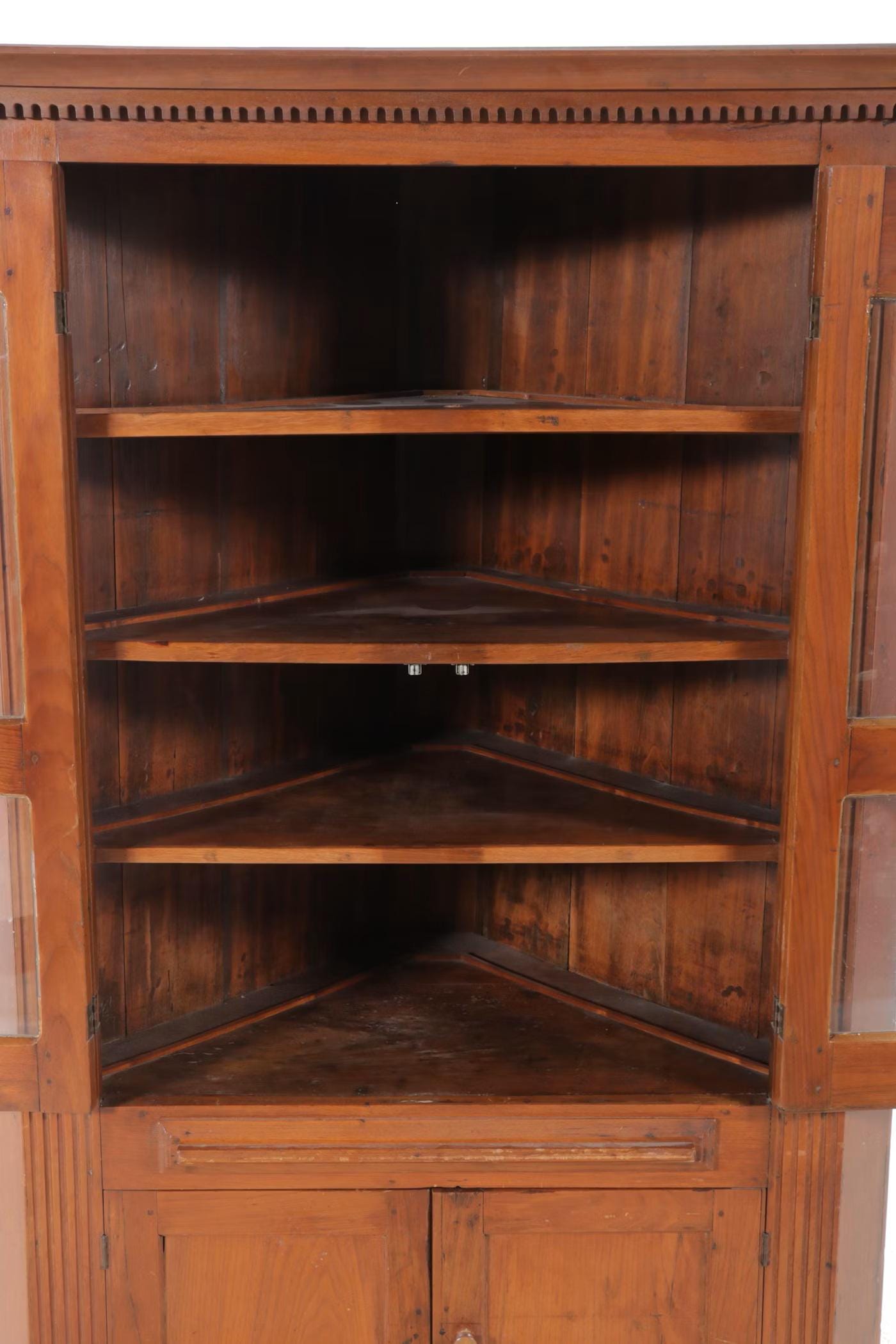 Late 19c. solid walnut corner cabinet. Overall excellent condition free of cracks or splits. Finish in very good condition showing some shelf wear, etc. Doors operate and latch as they should. Simple elegant lines and top rate construction. Measures 51.0" W x 84.0" H x 26.0" D.