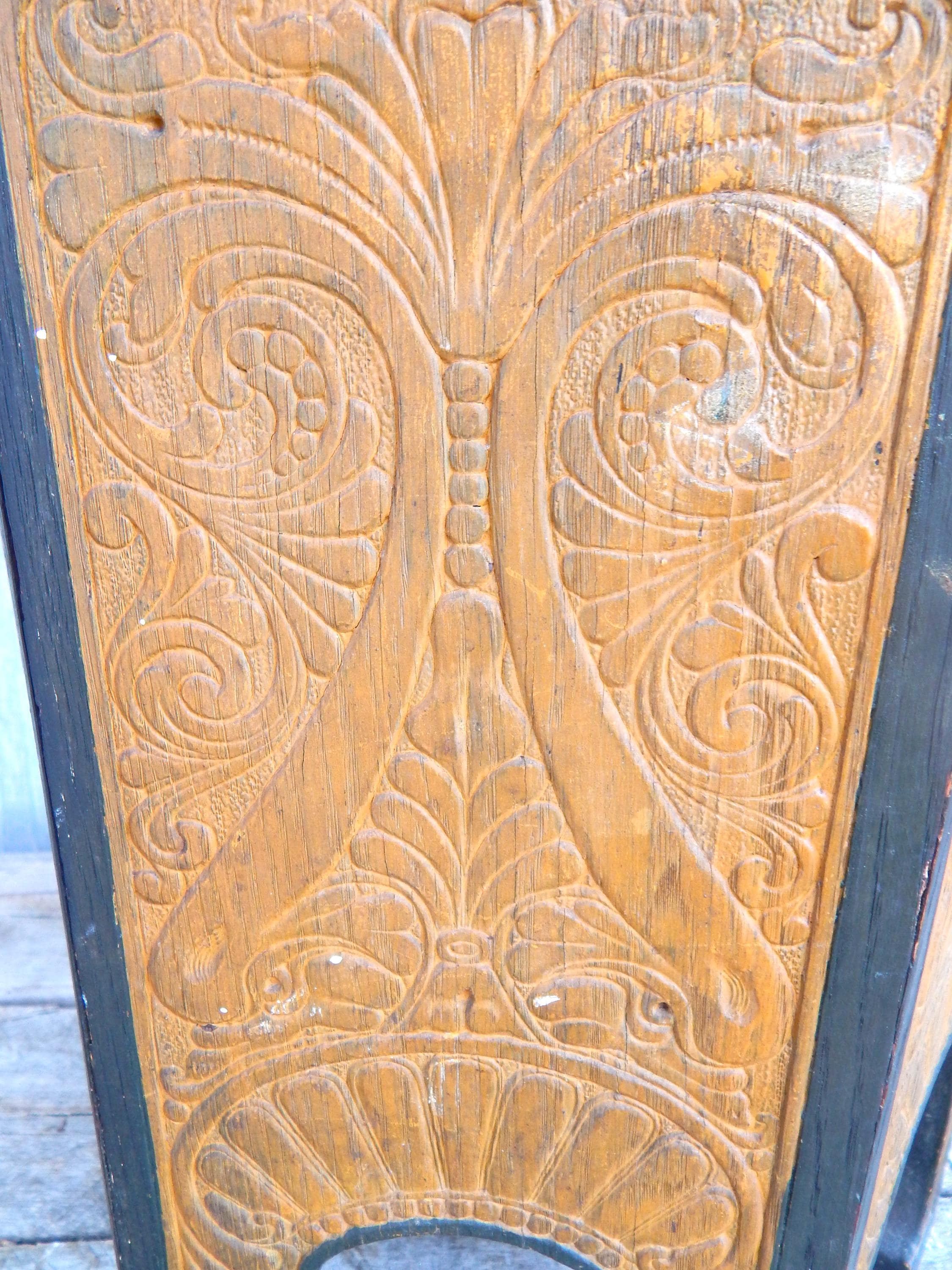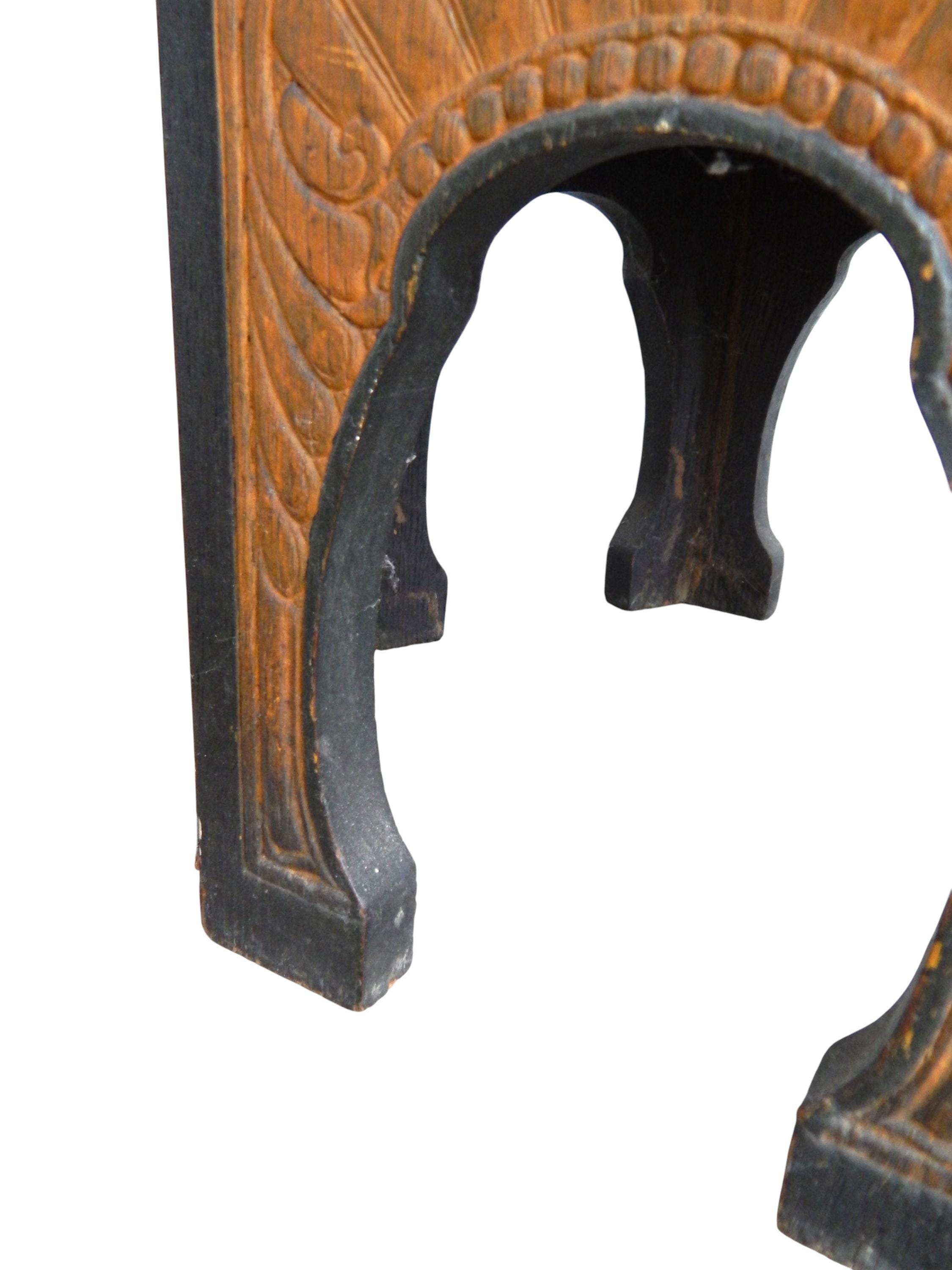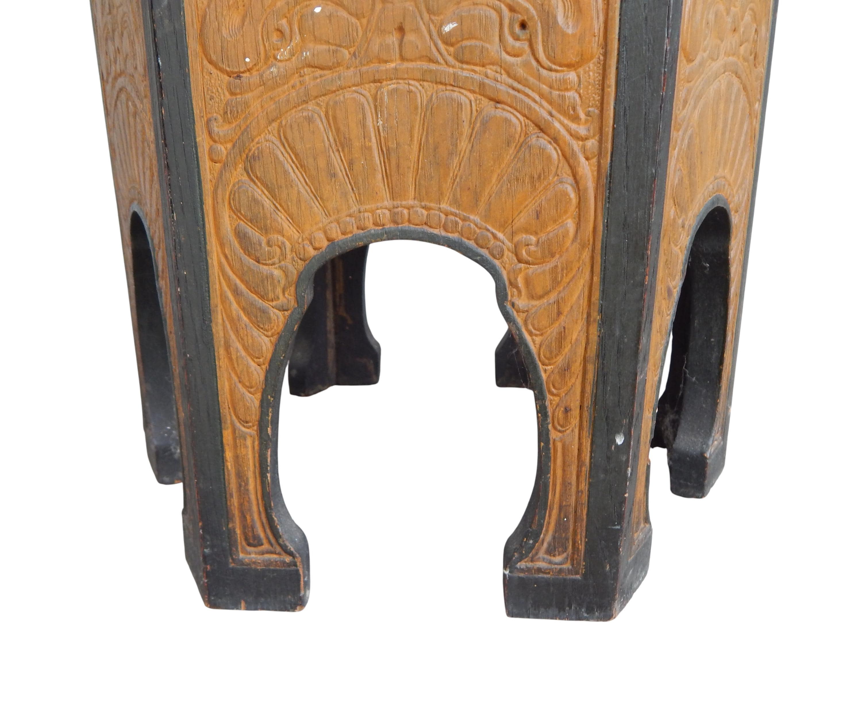 Dates to the early 1900's Showing North African influences though country of origin is unknown. Intricately carved oak panels. Free of splits, cracks, etc. Some age related wear as shown. Very solid and stable. Measures 19" high x 14.5" in diameter. Display your hookah, tropical plant, or set your favorite mug of Turkish coffee on it.