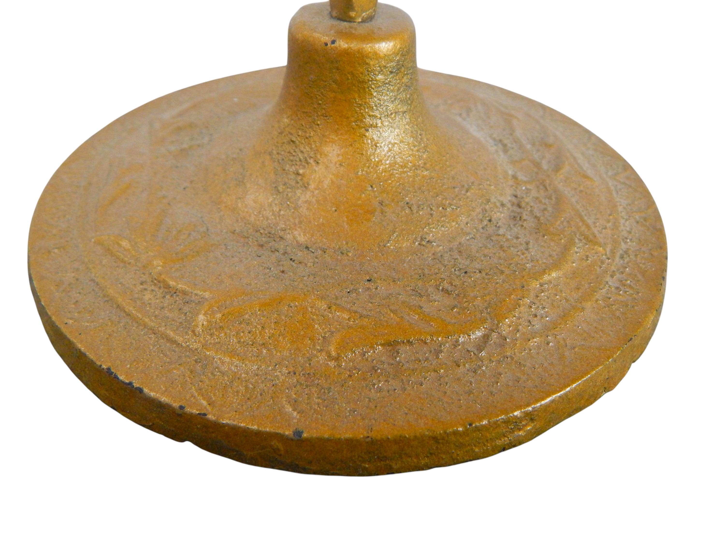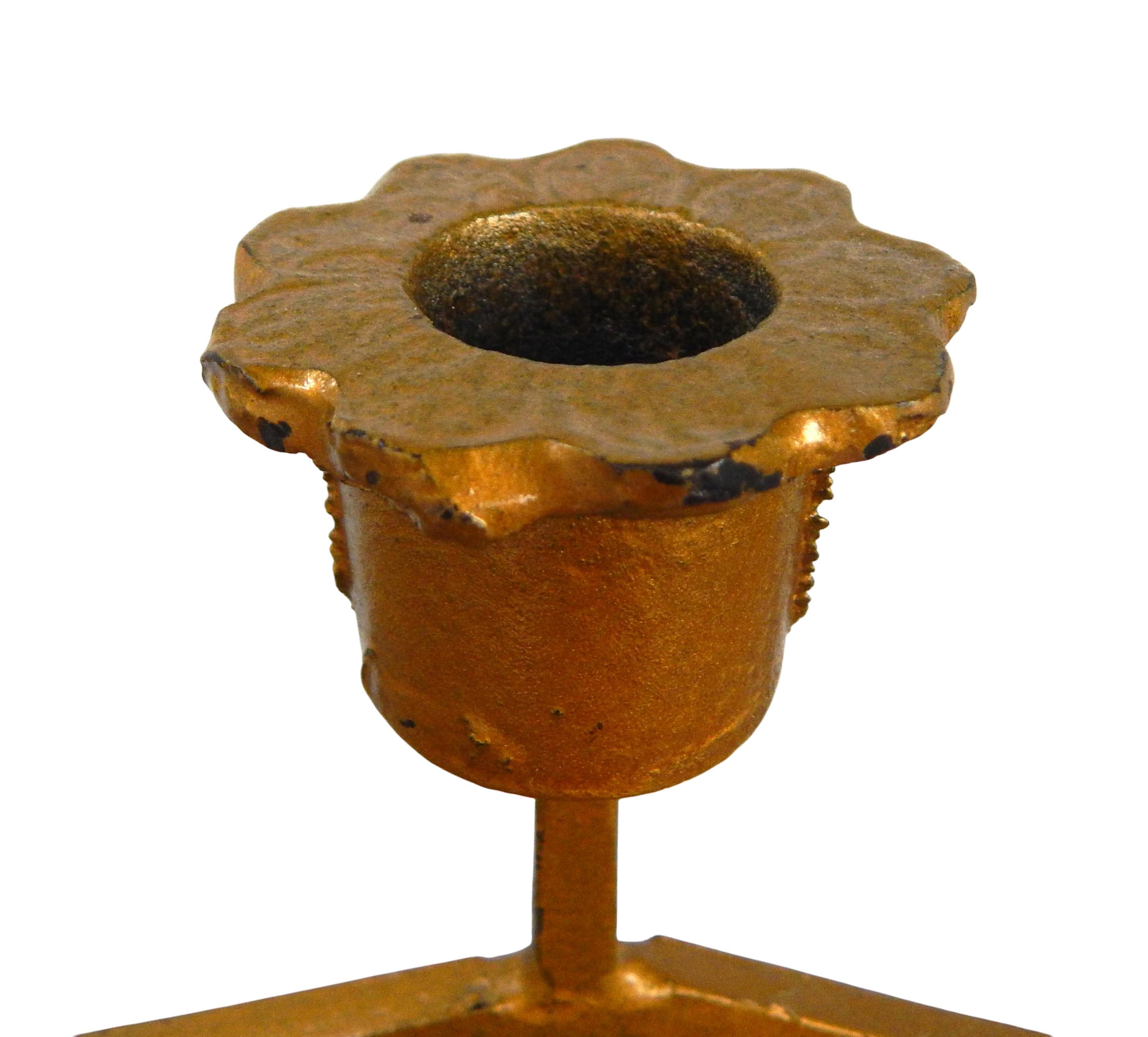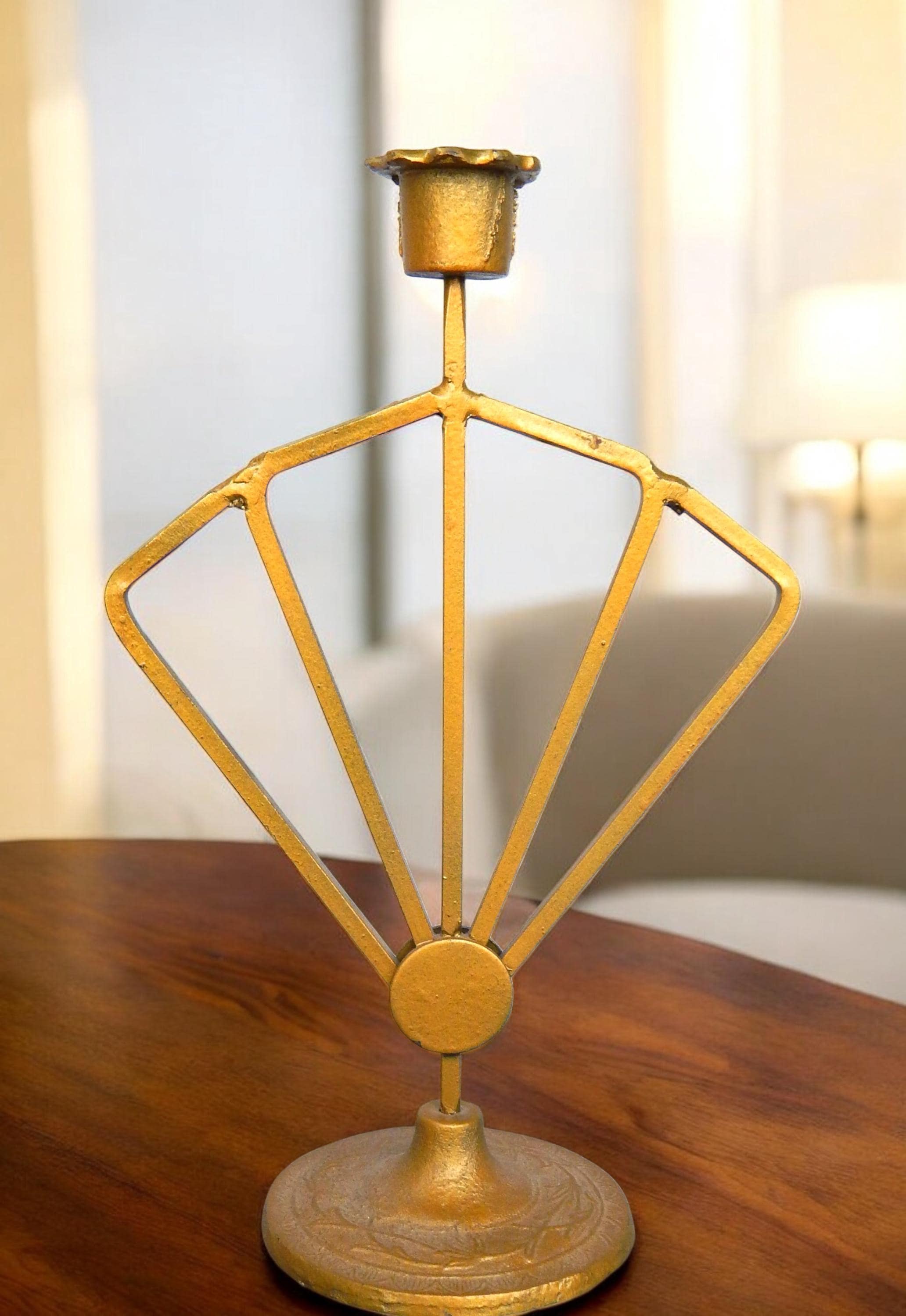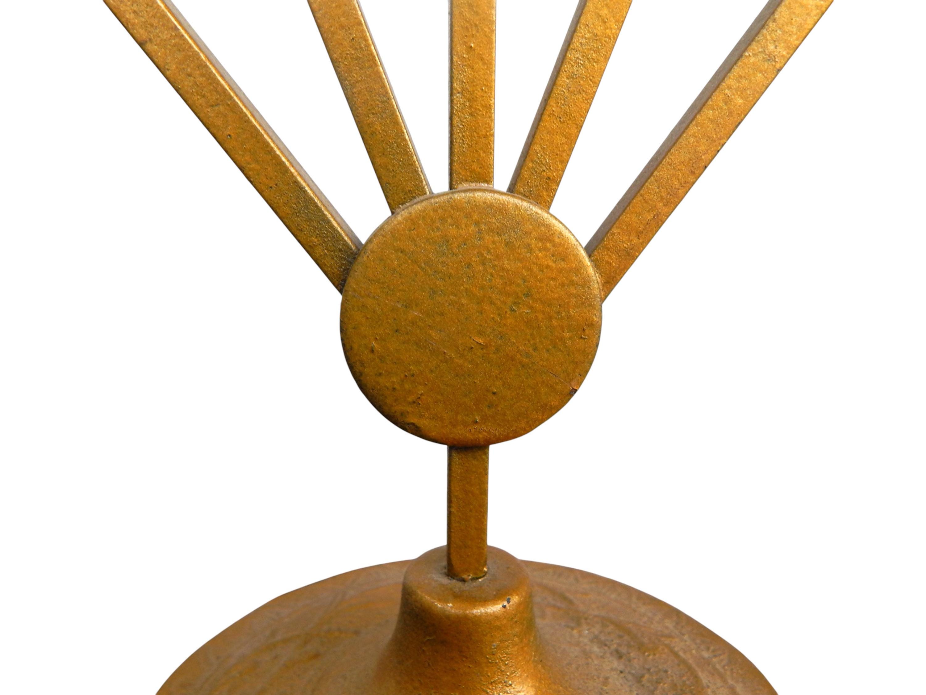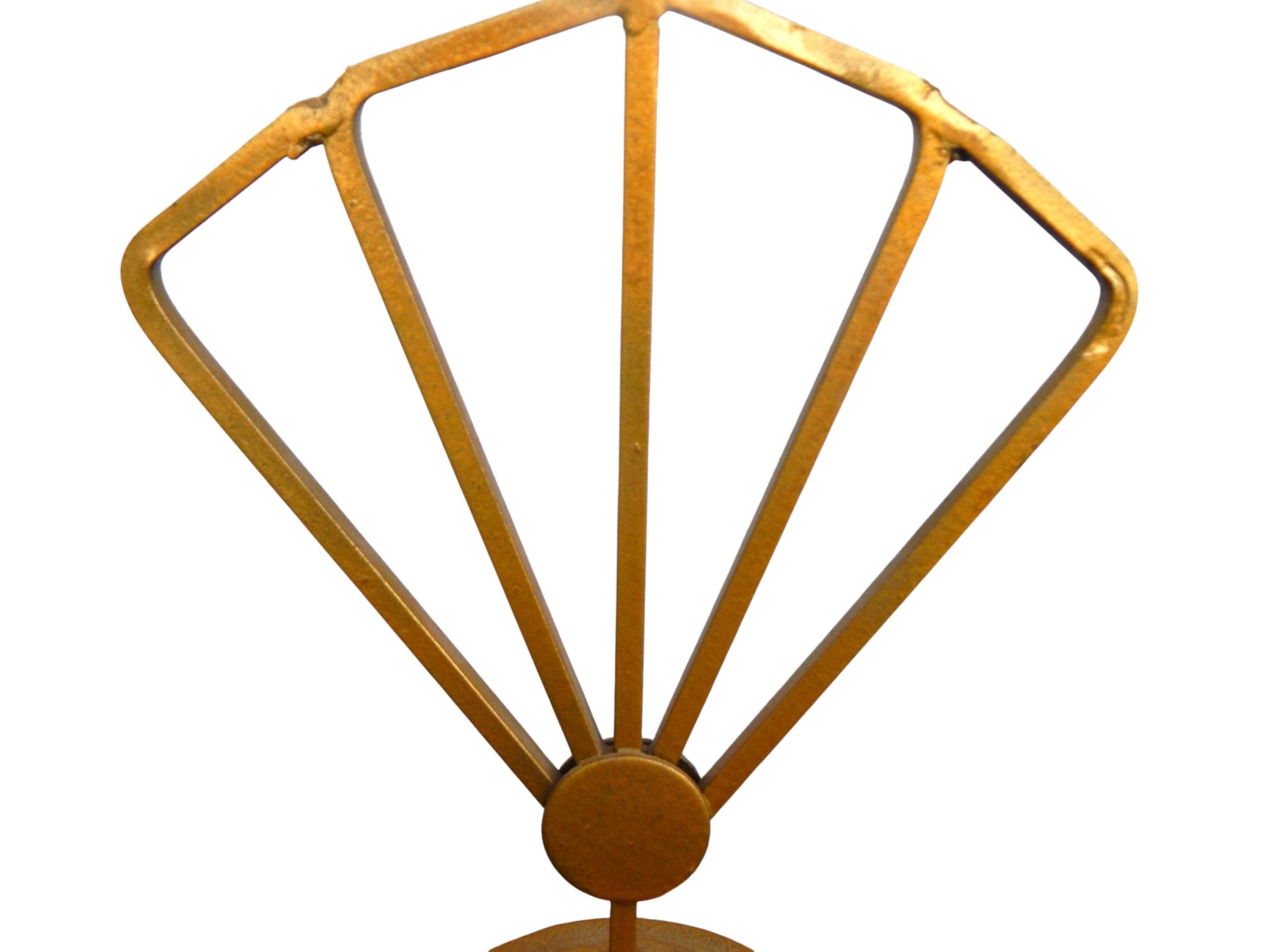 Has the feeling of being made in 'a little shop', not mass produced. Wrought iron, and gold painted art deco candle stick. Nice patterning on base. No cracks or missing pieces. Stands 13" high. Fan is 8" across. Free local pick up or nationwide shipping.