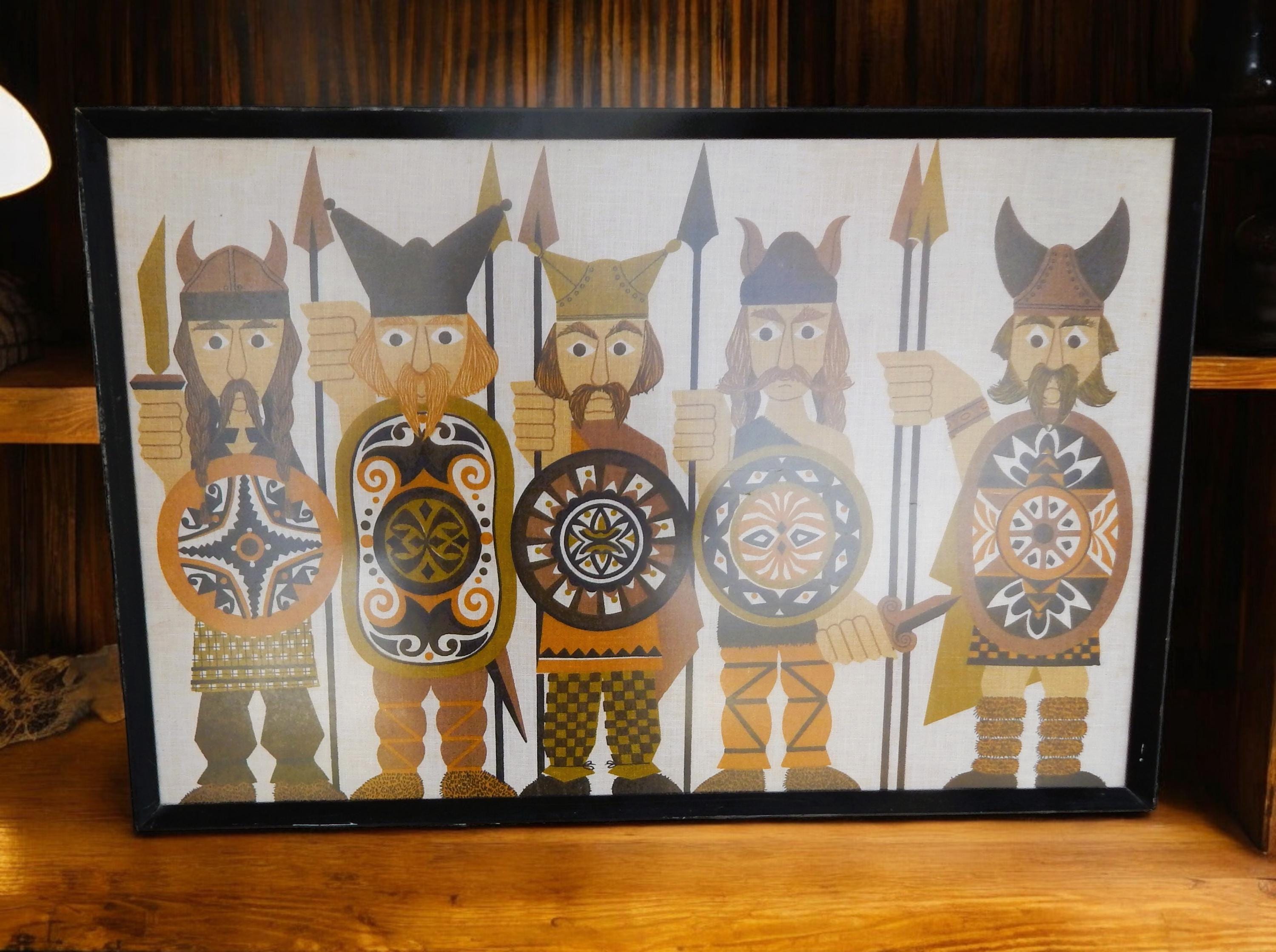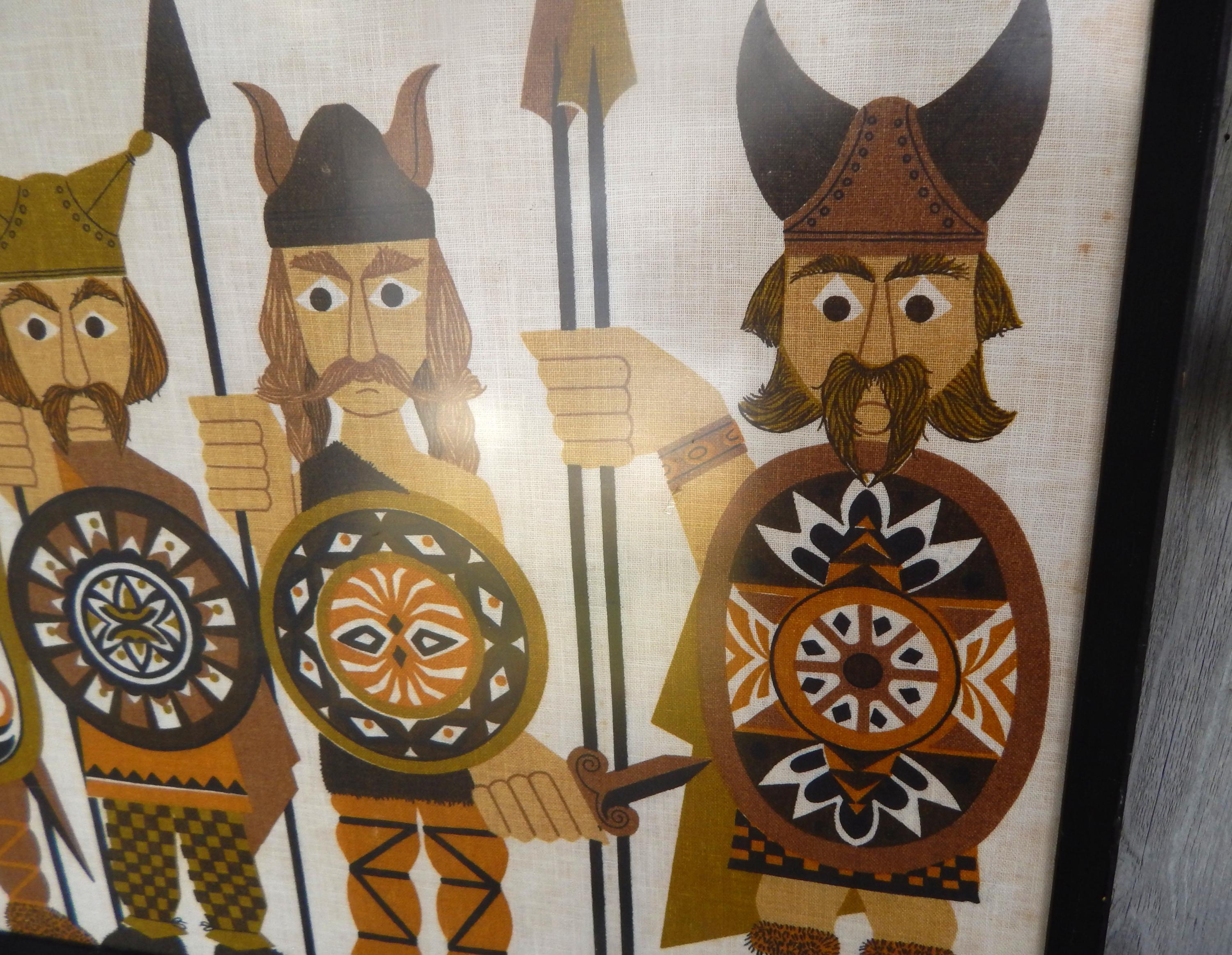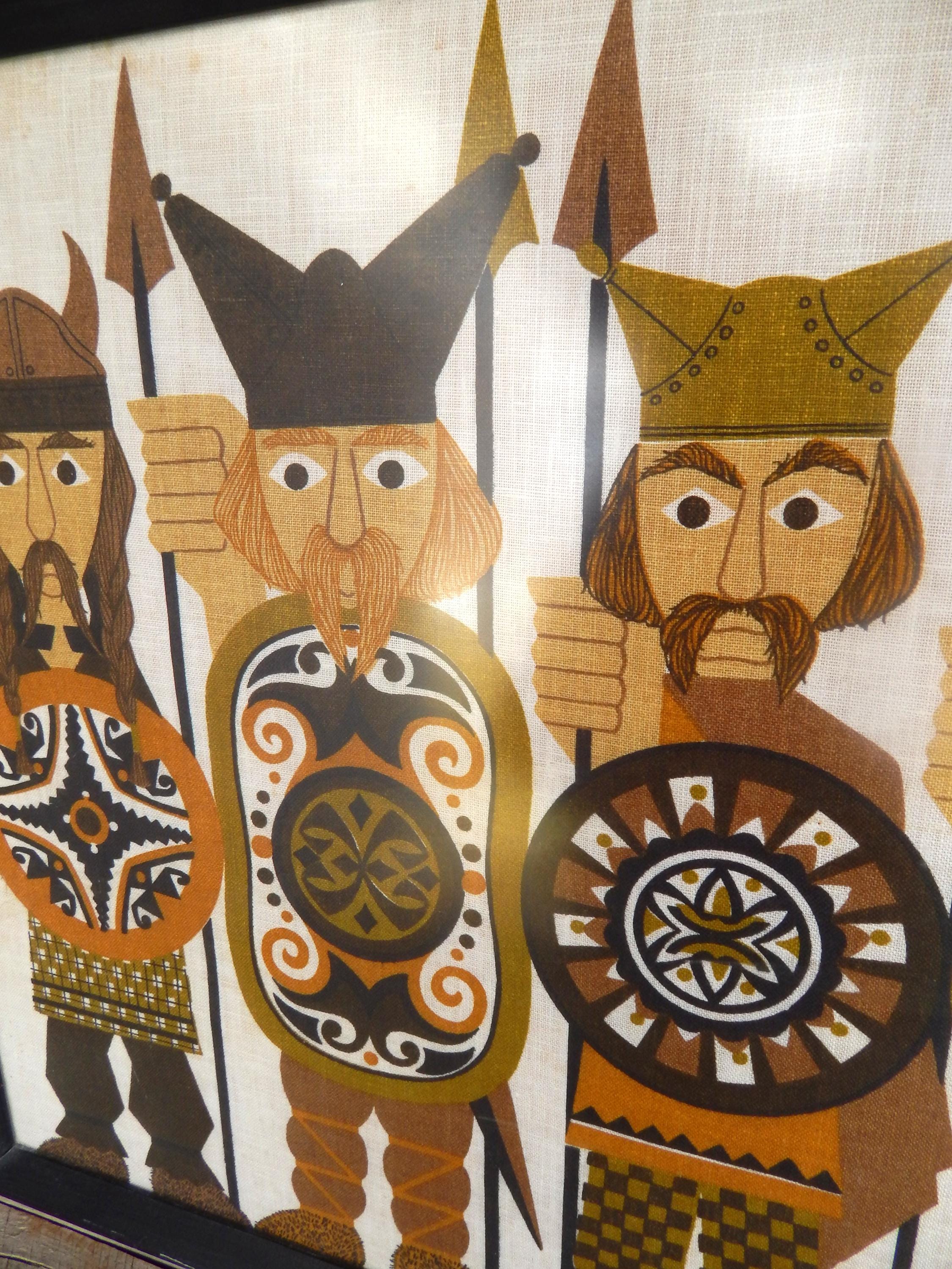 Serious 1970's styling to the graphics of 'Early Britons' (Vikings) silk screened onto Irish linen. Overall good condition with some scattered spotting as shown. Measures 31 x 20. Free local pick up. Nationwide shipping.