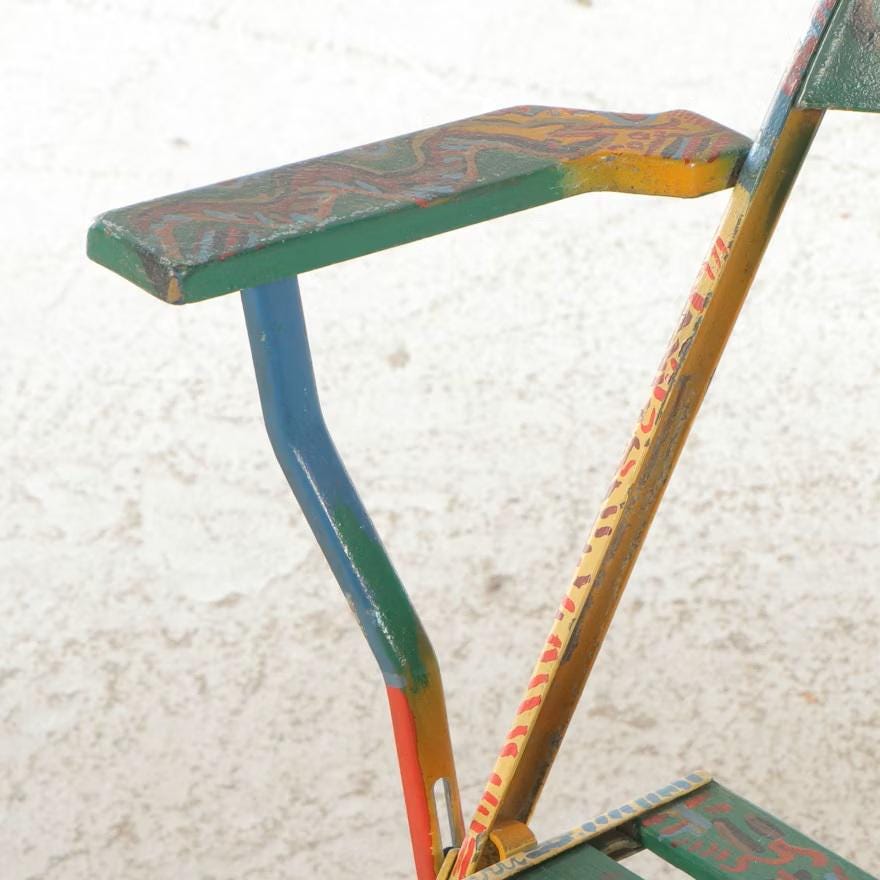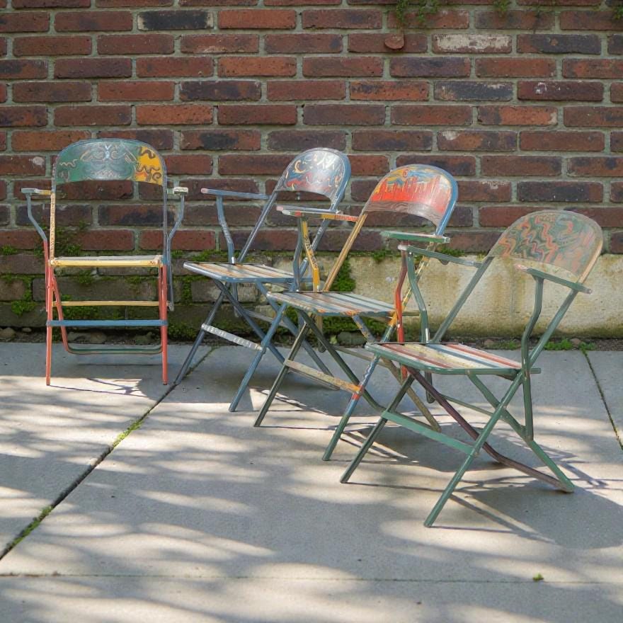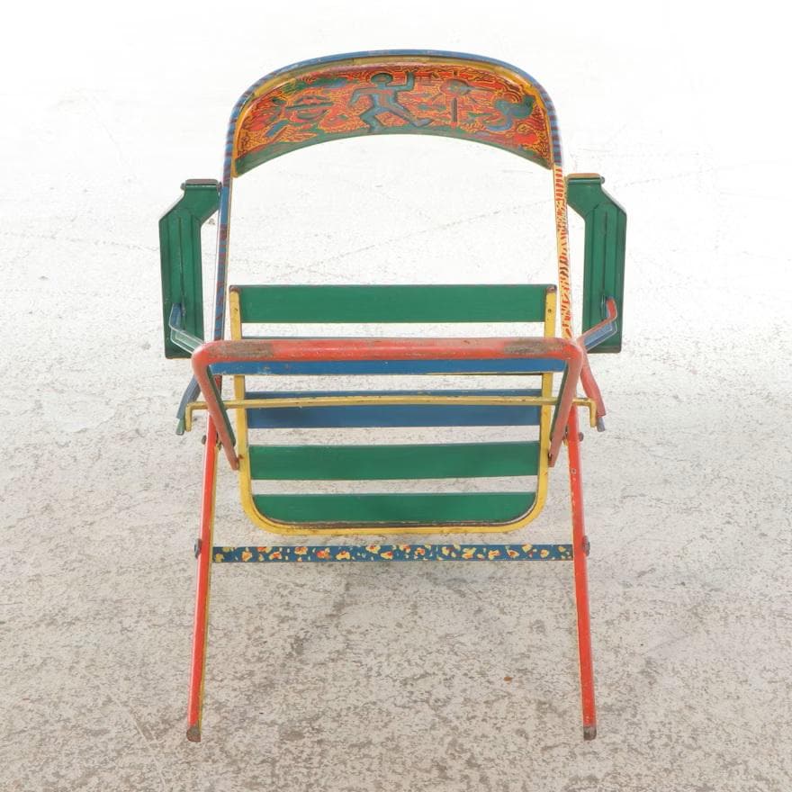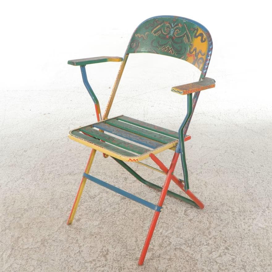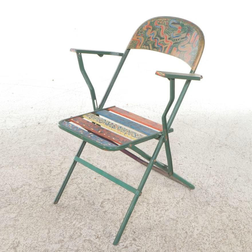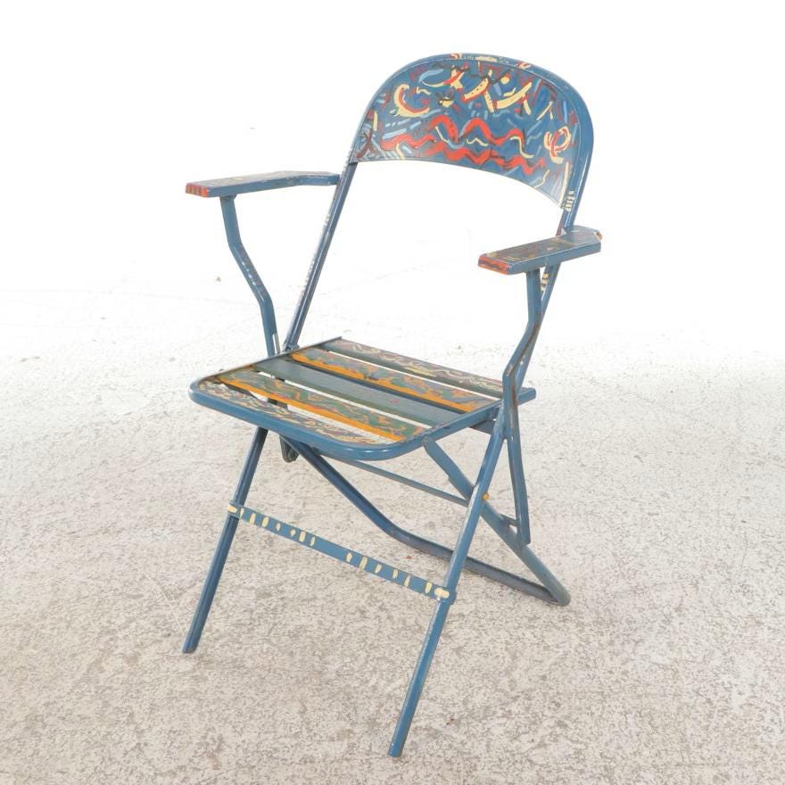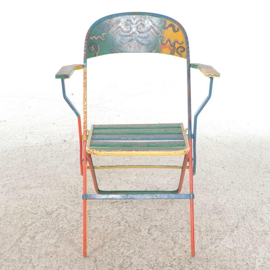 A set of four metal folding armchairs, each individually hand-painted with a variety of colorful and stylized folk art motifs, including abstract geometric patterns, cityscape scenes, and figural representations of a human form. Each chair has armrests and a slatted seat. The metal folding armchairs are estimated to be Mid-20th Century; the paint decoration is estimated to be Late 20th (1980's). Dimensions 16.0" W x 34.0" H x 18.0" D. Each shows the expected wear and finish rub. Some oxidation to metal frames.