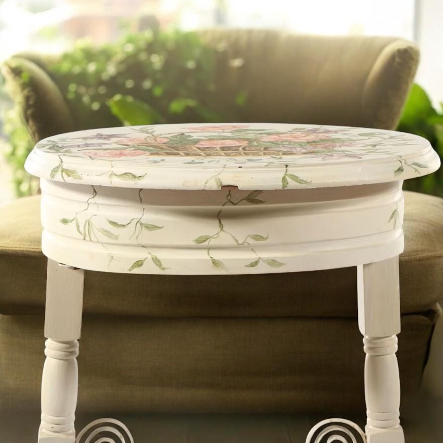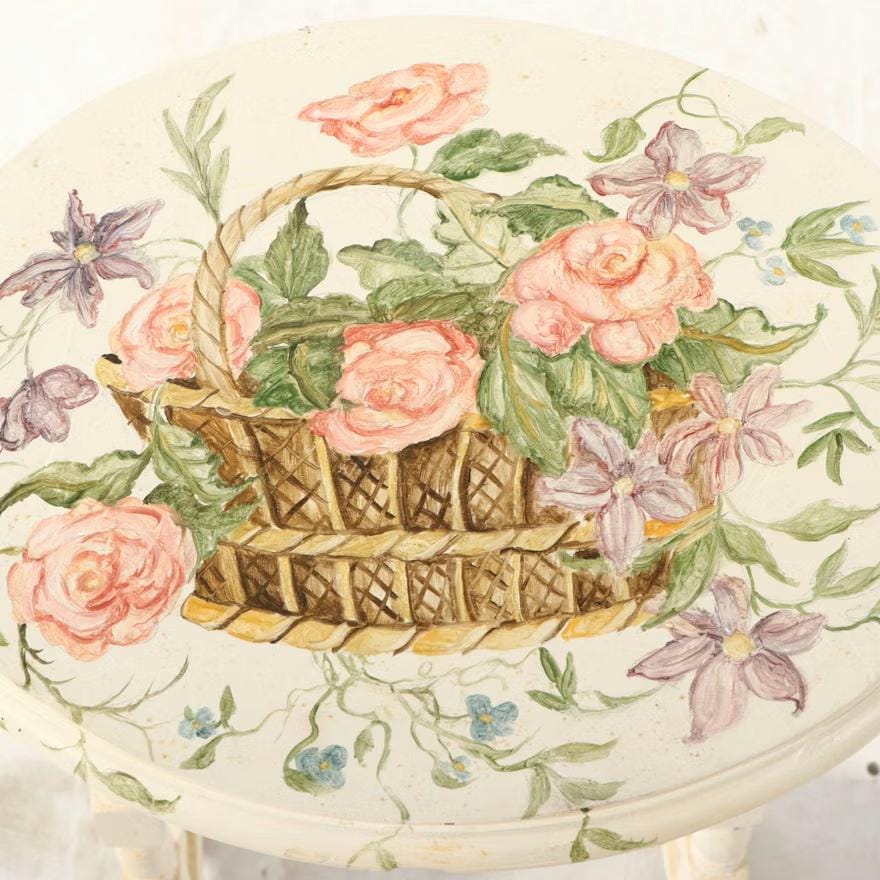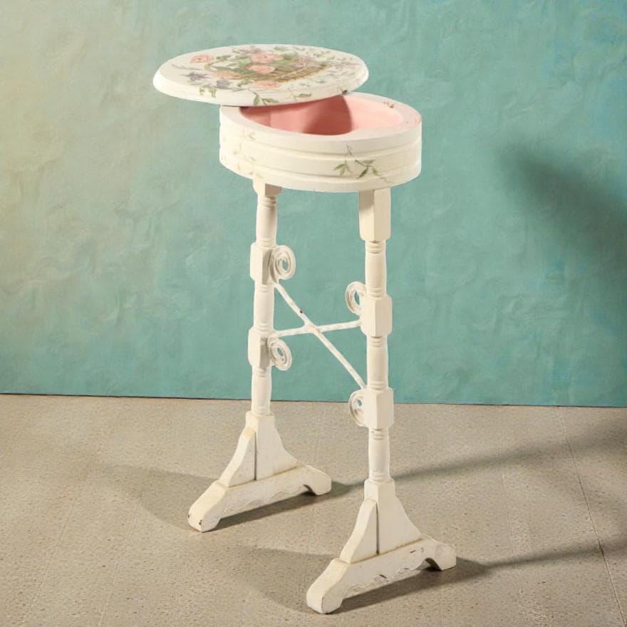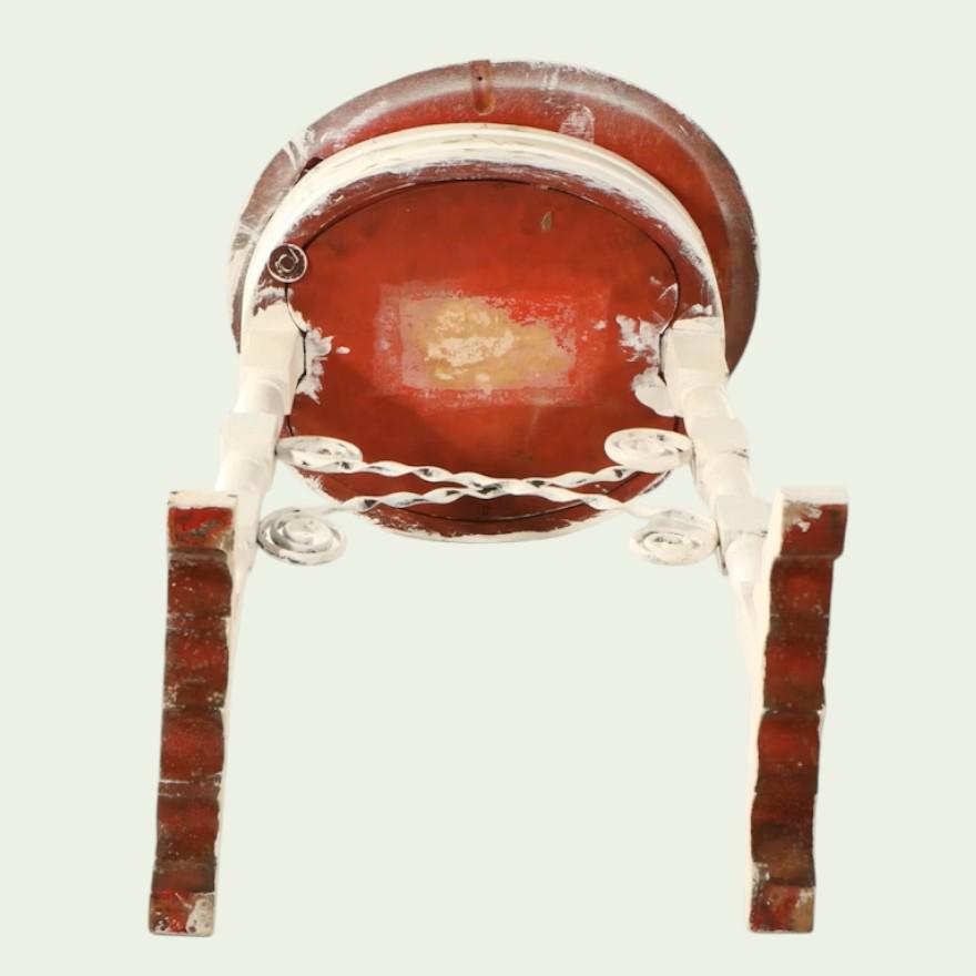 Antique hand painted swivel top stand / side table. Wrought iron bracing. Storage under swivel top. Expected minor wear as shown. Dimensions are 13.0" W x 24.75" H x 11.0" D