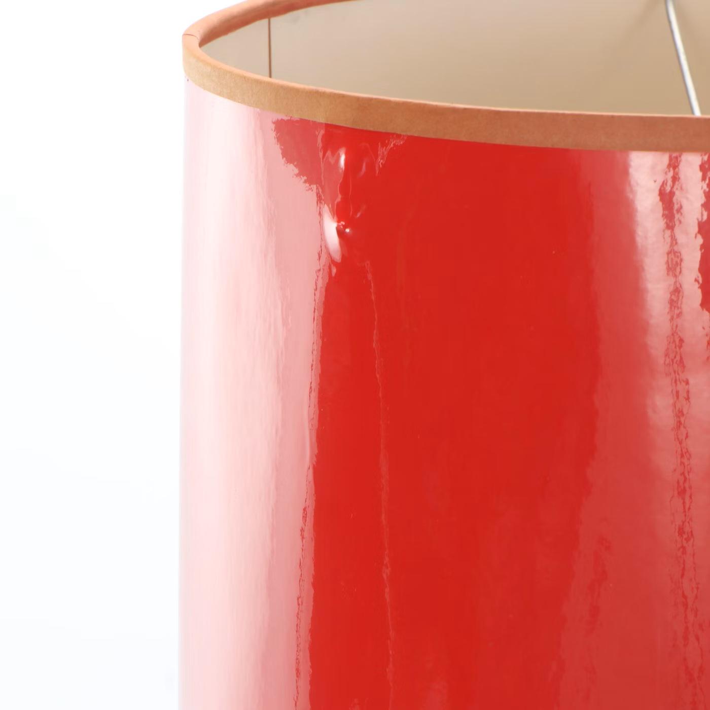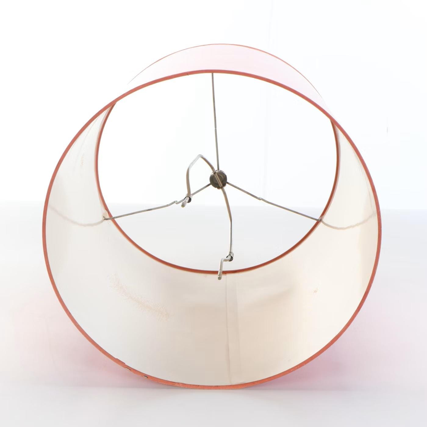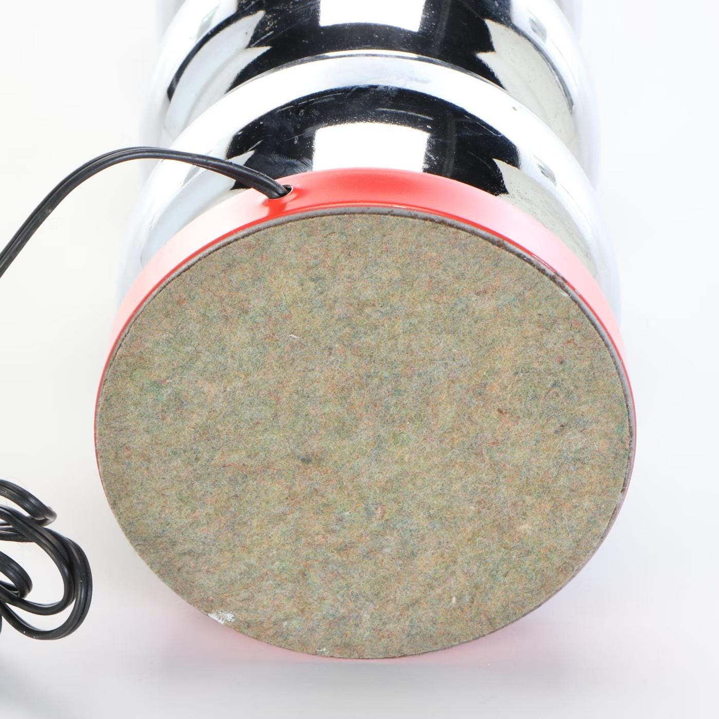 Iconic 1970's styling with stacked chrome orbs. Very good condition, works very well .Rare to find one with the original heavy enamel painted shade. Works well. Very minor wispy marks to chrome. Shade has a few 'dings' as shown. Original felt bottom in very good condition. Measures 37" high. Diameter of shade is 15.25"