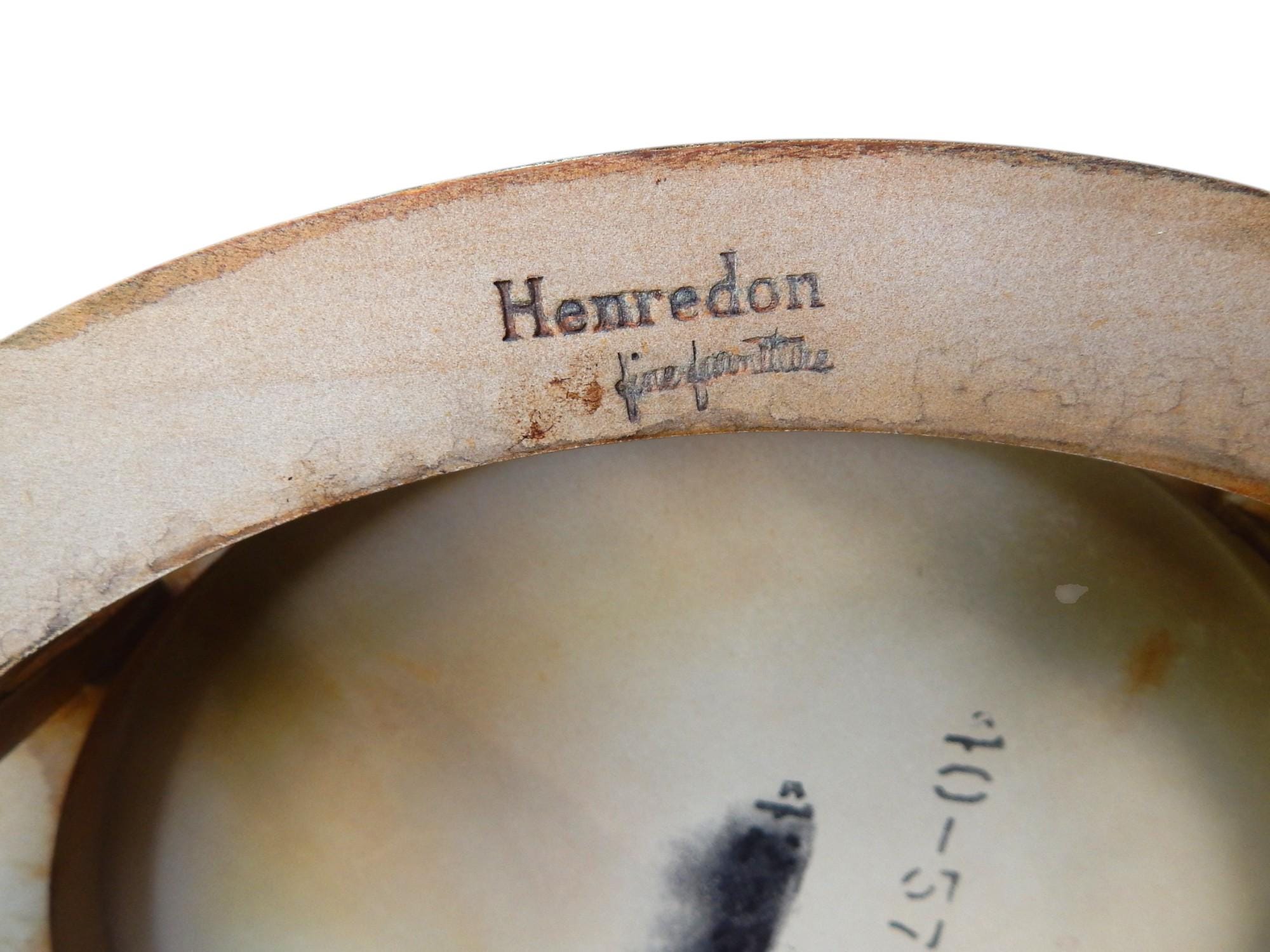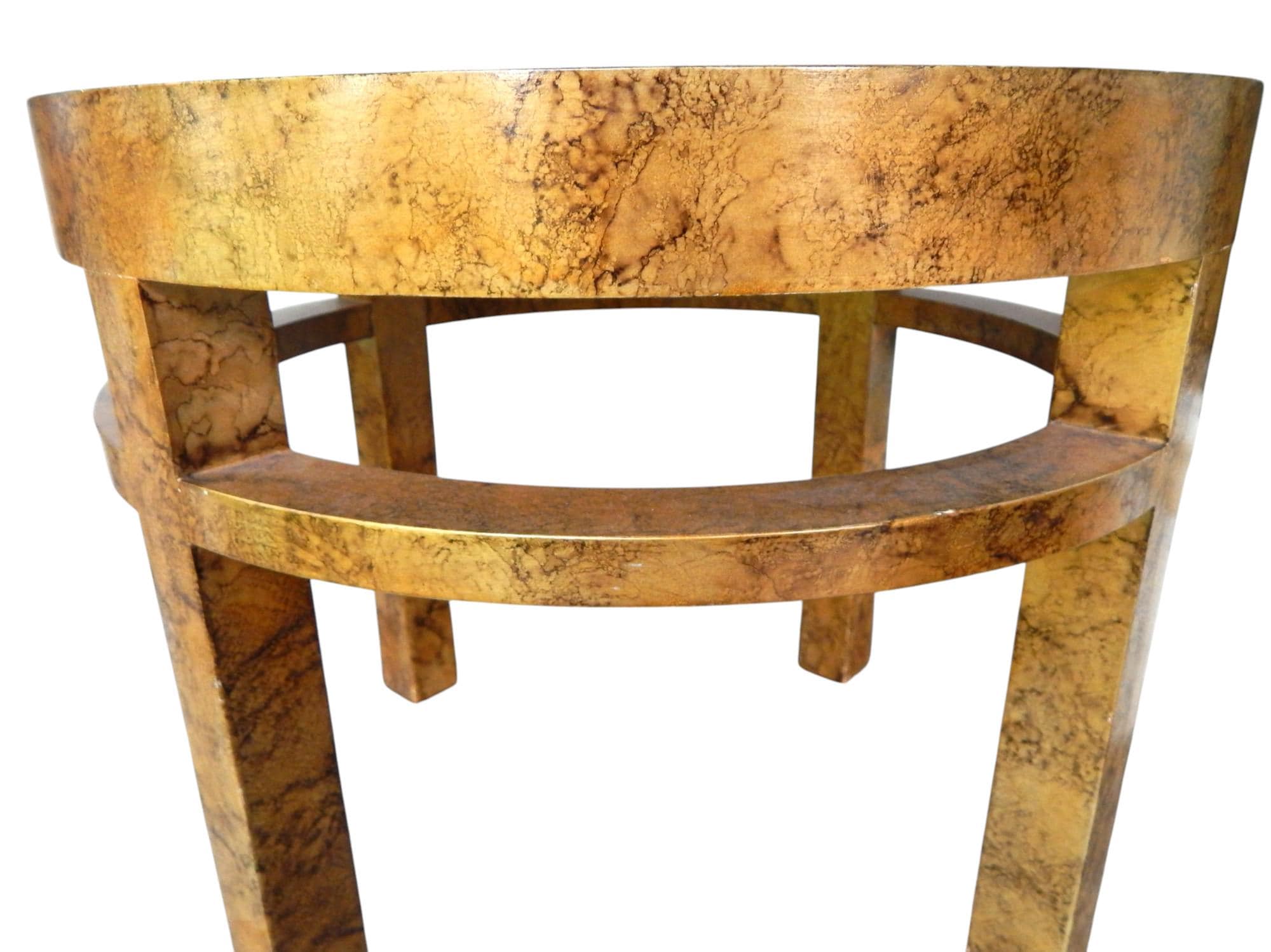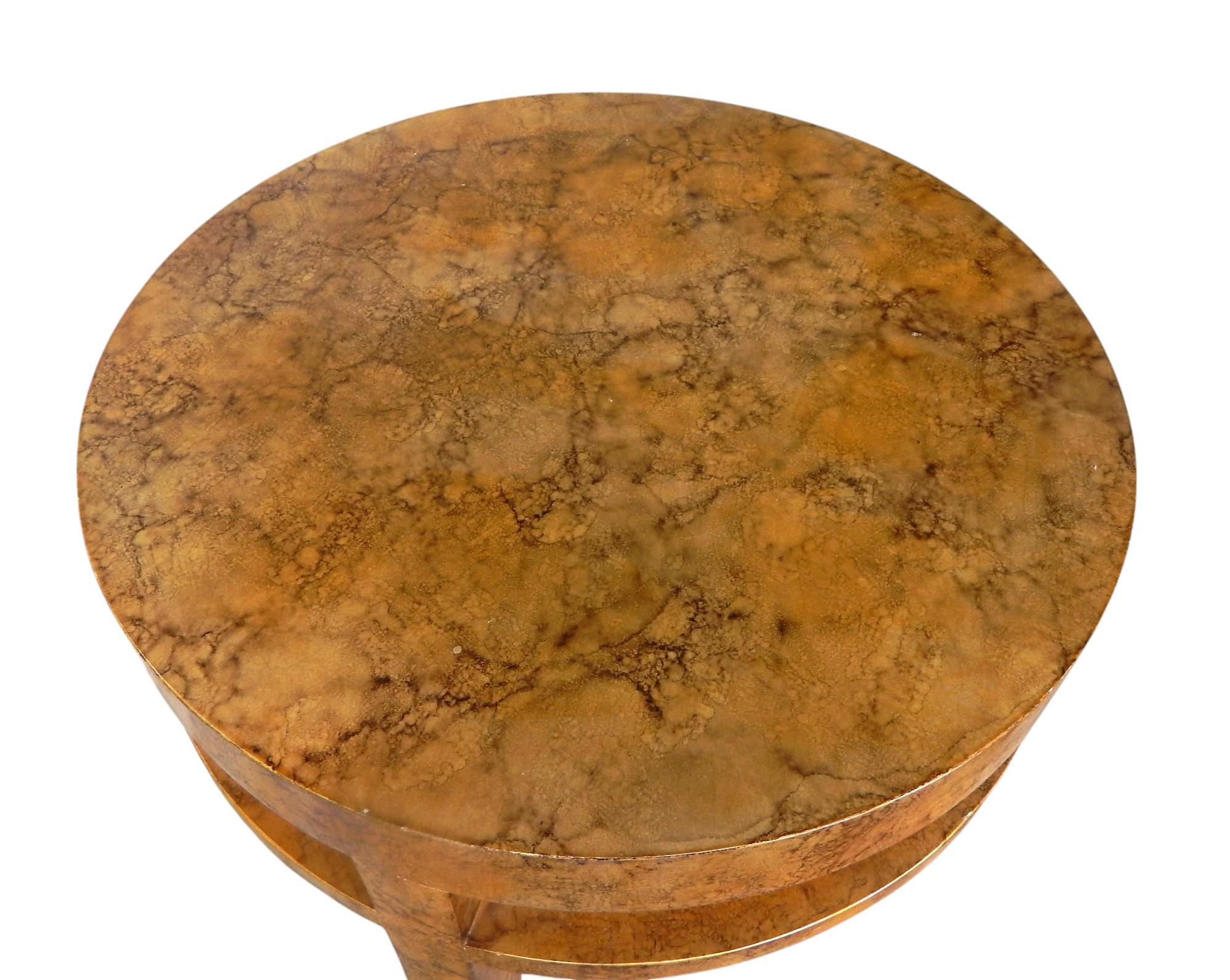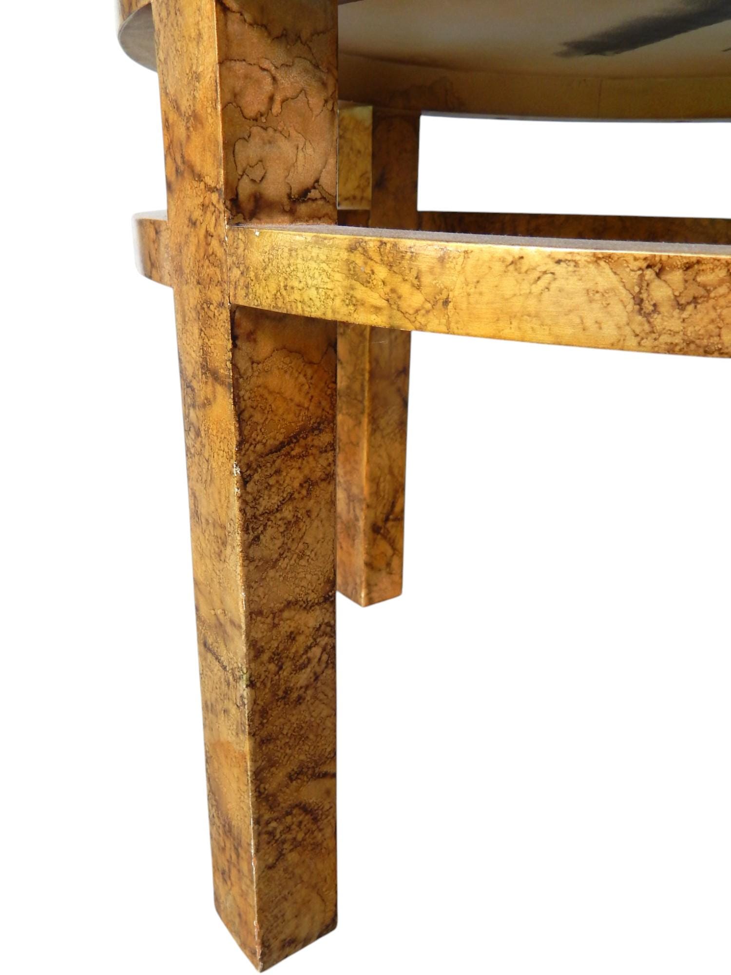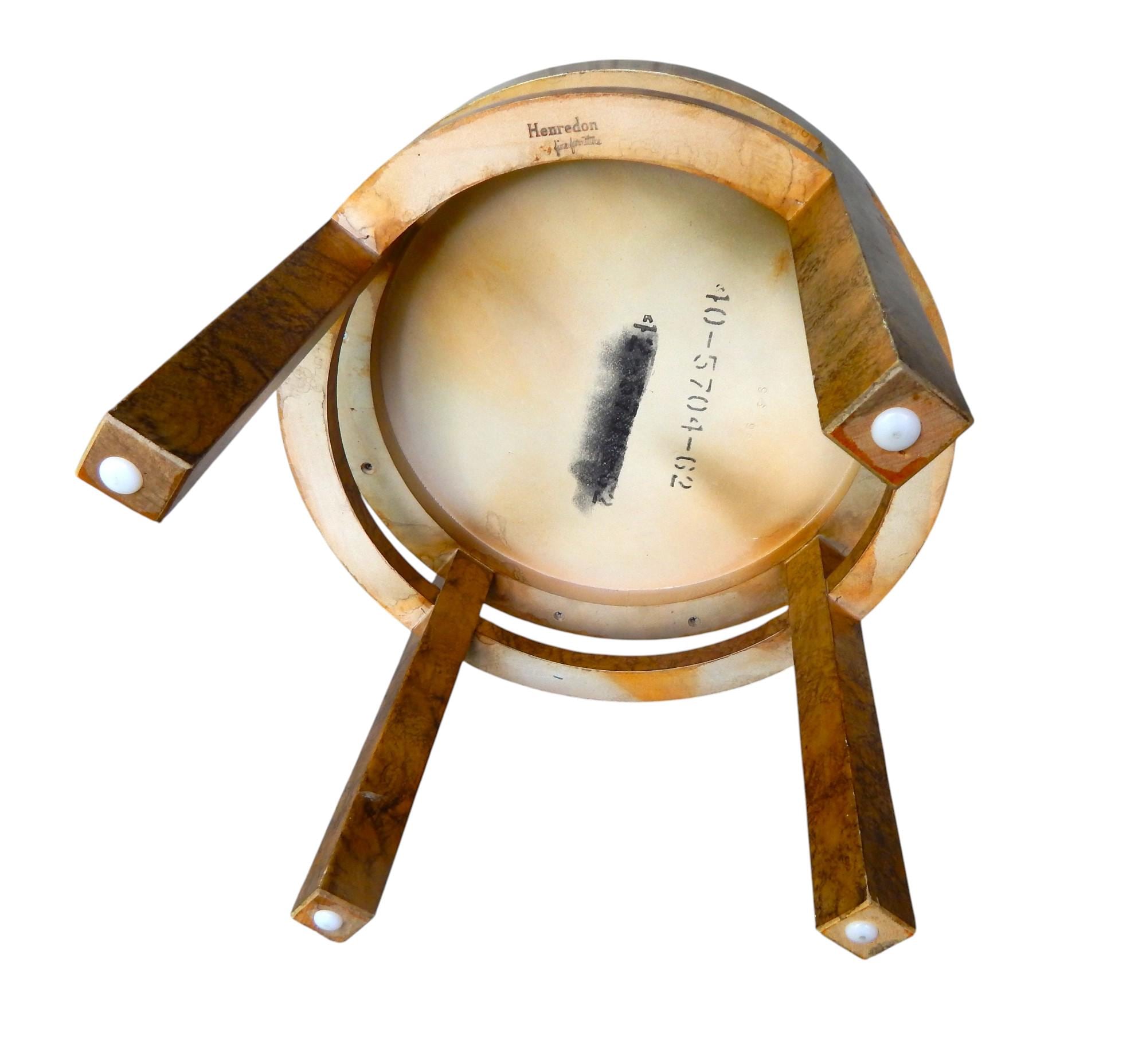Burlwood laminate over engineered wood by Henredon. Dates to the early 1970's. Overall very good condition with light crackling to top and a few very small nicks as shown. 20" diameter x 16.75" high. 70's mod!