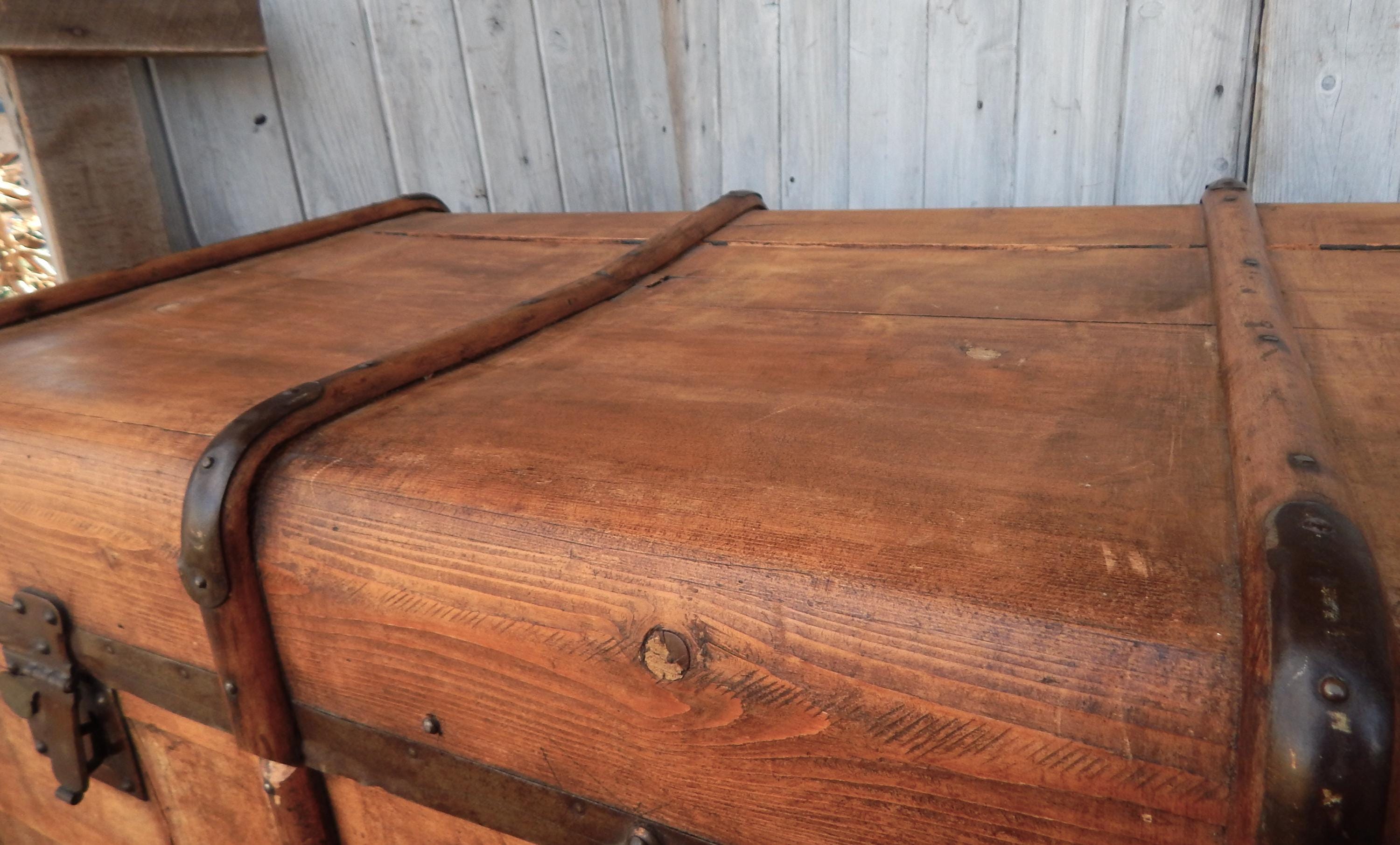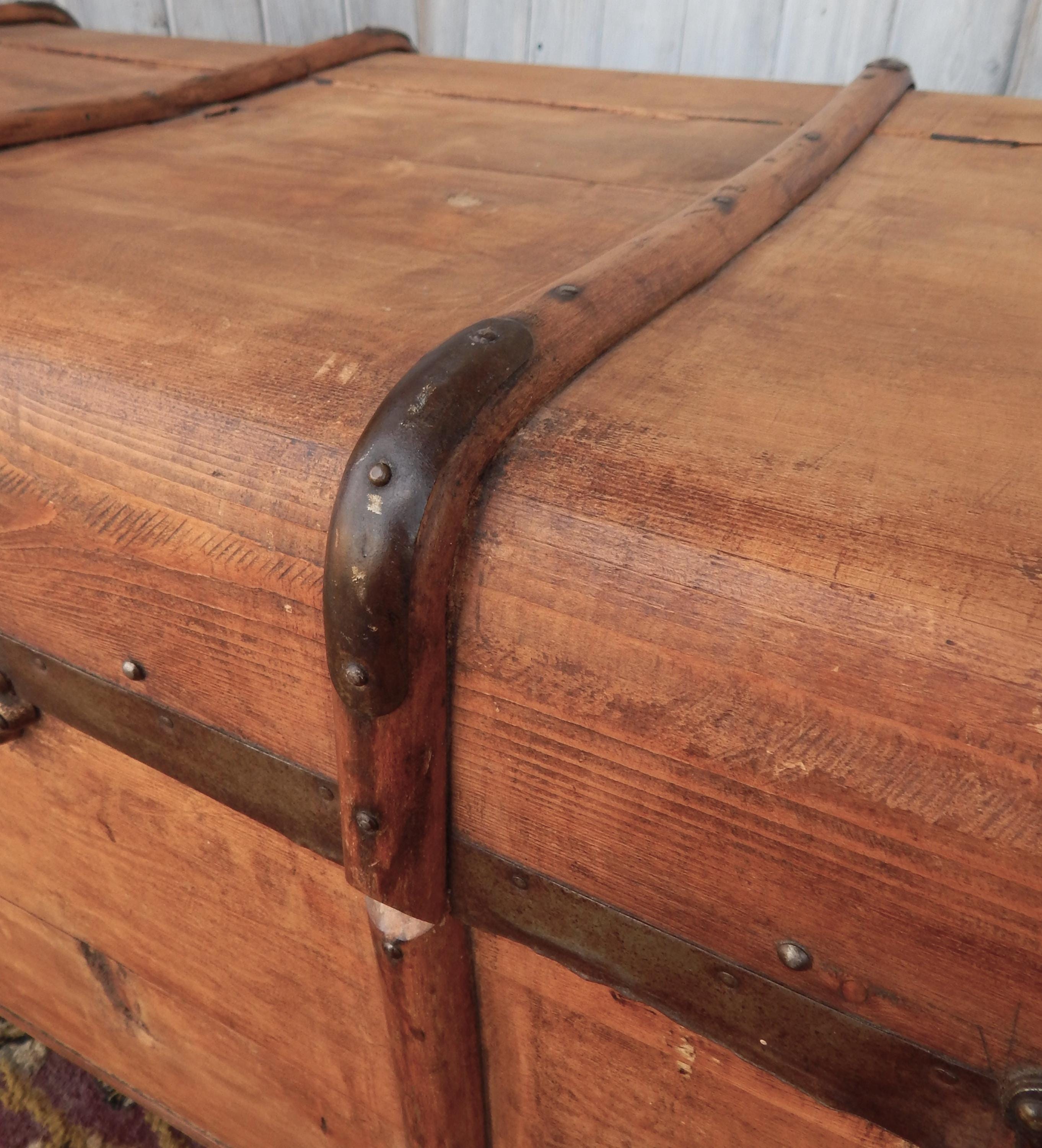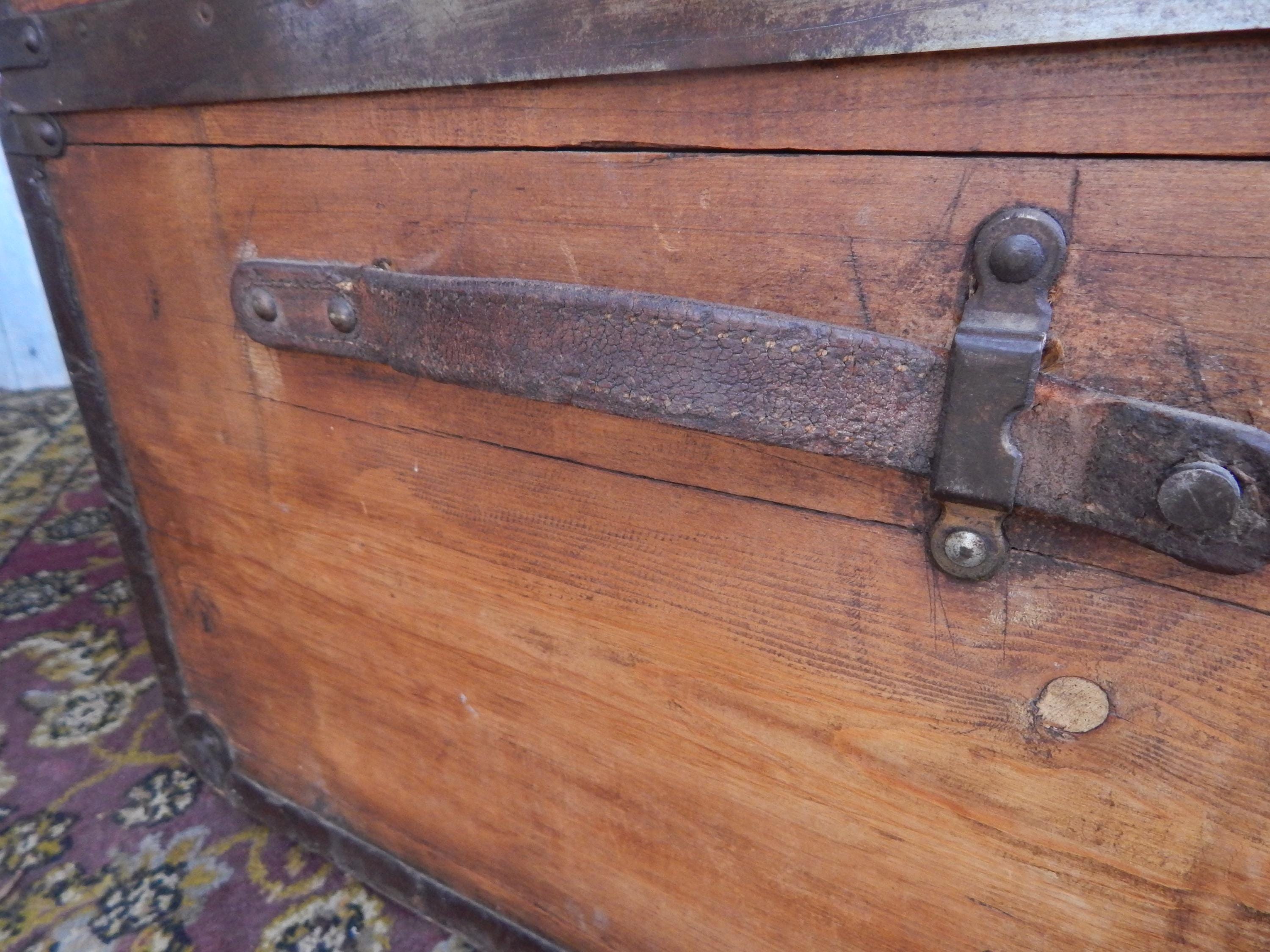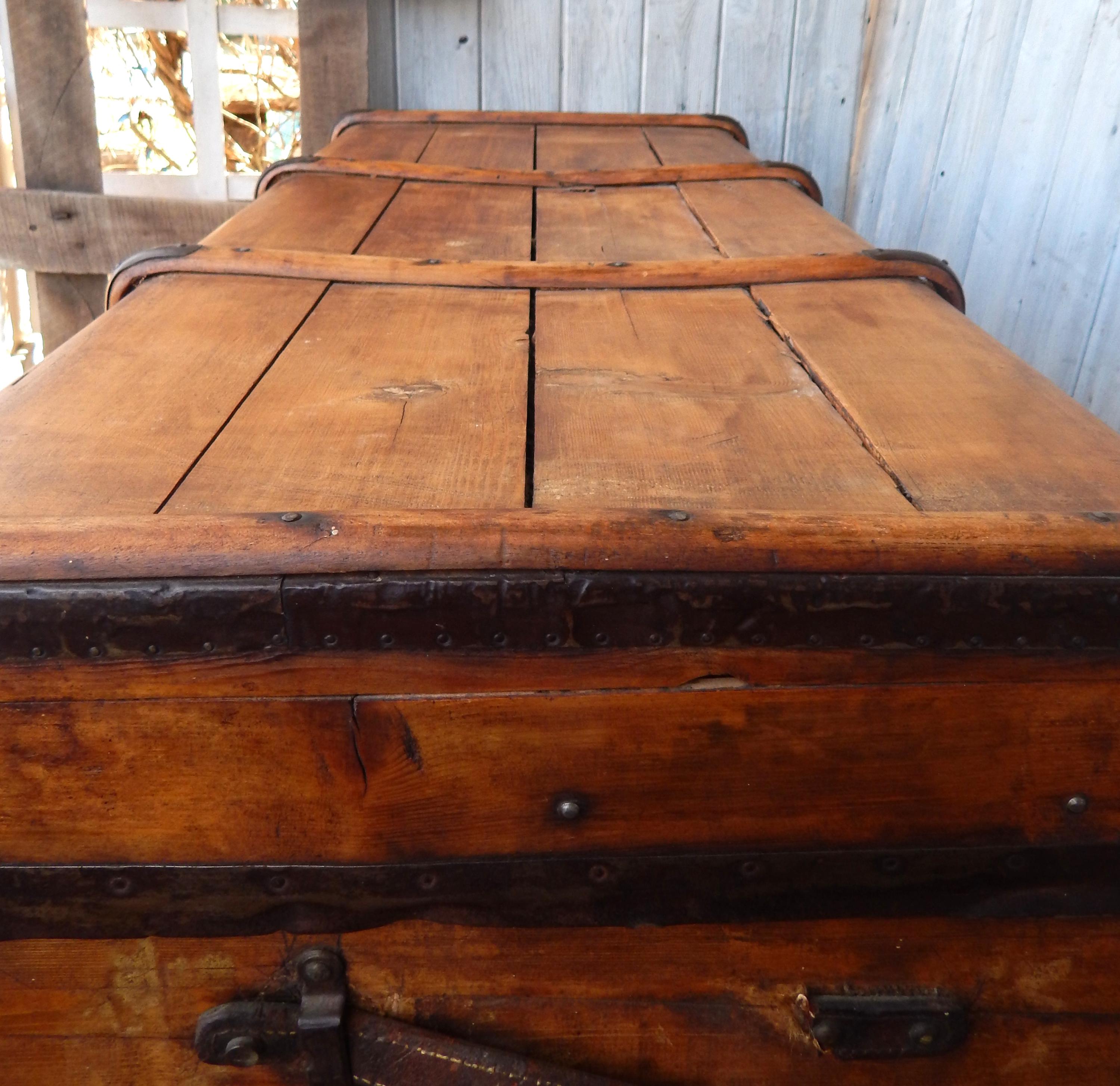 Interesting 'light weight' iron bound and brass trimmed trunk. Wood used to construct it is 1/4" thick instead of the usual 1/2" or 3/4" inch. Great color. Bentwood with brass trim and iron bounding all around. Latches work well. Keys are of course long gone. One leather carry strap is broken as shown. Overall very good condition with only minor scuffs and wear from use. Measures 43W x 20D x 18H.