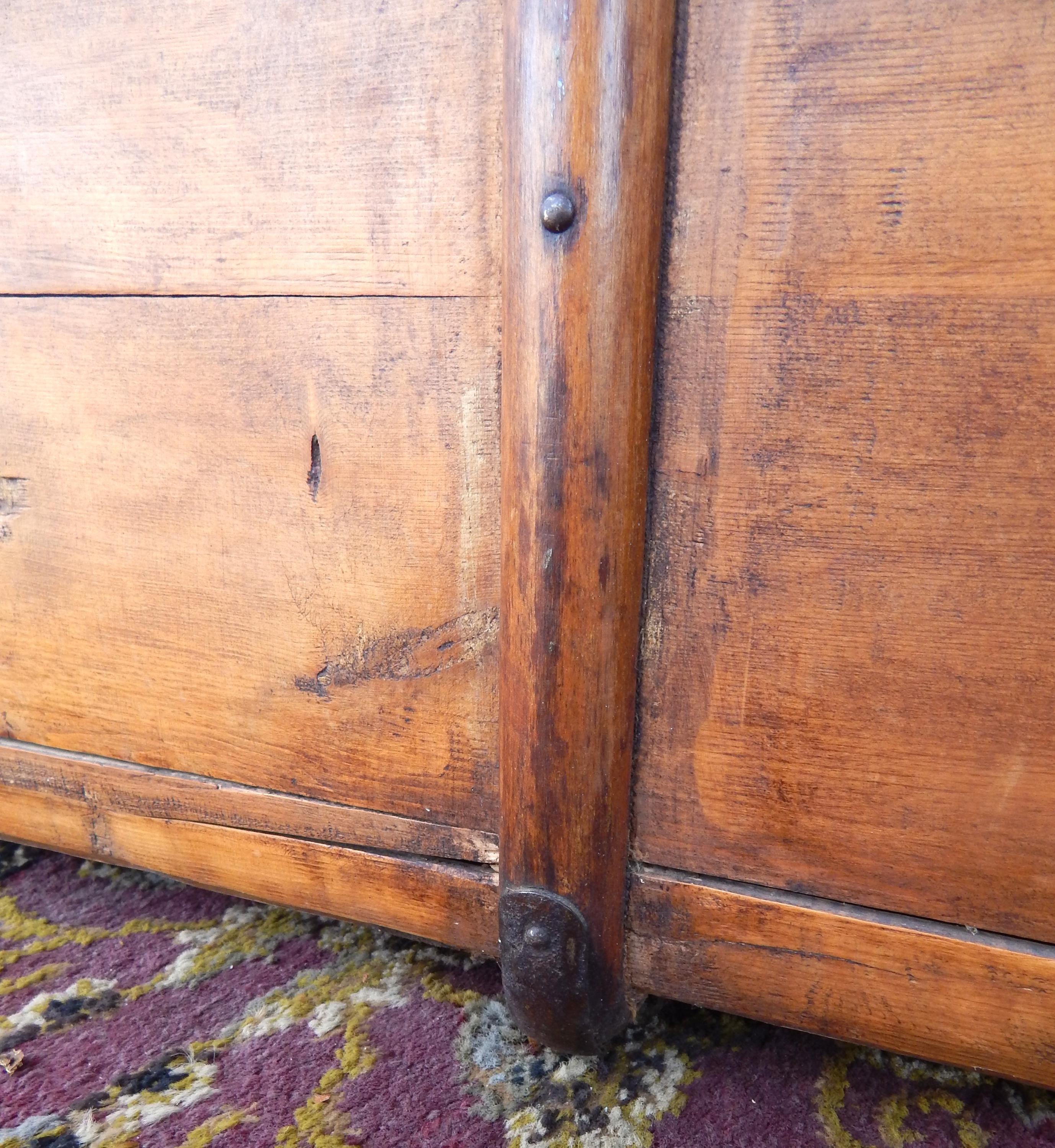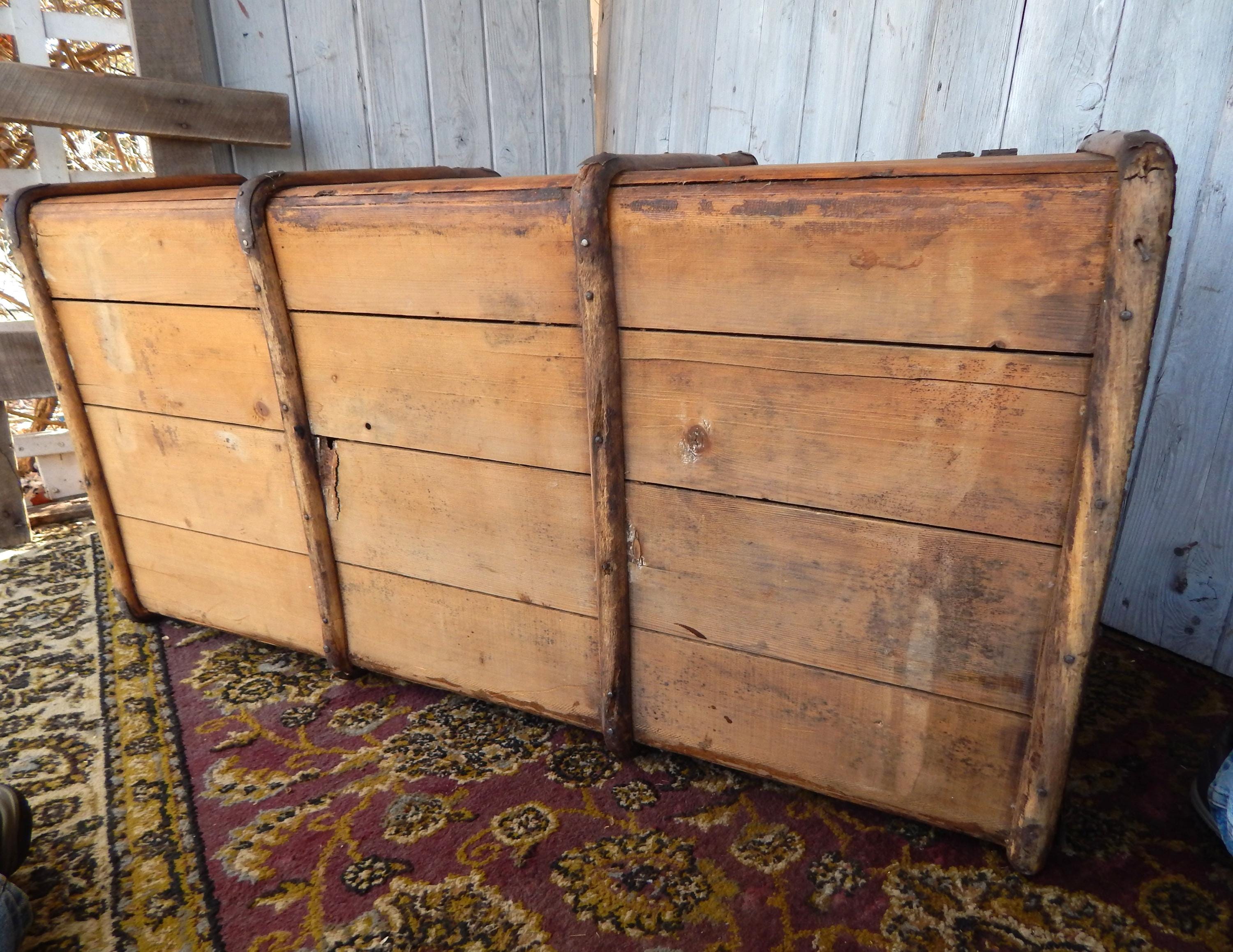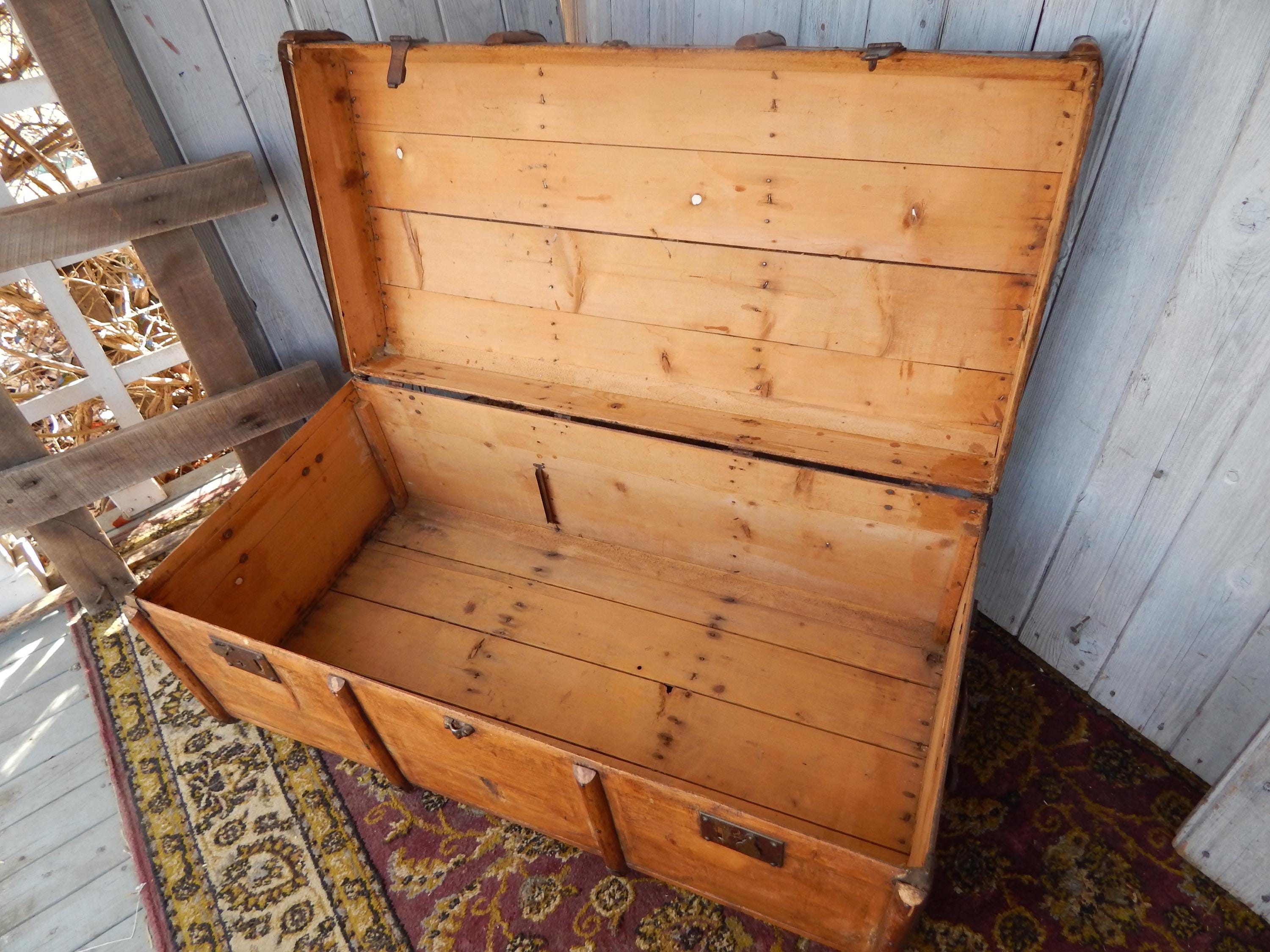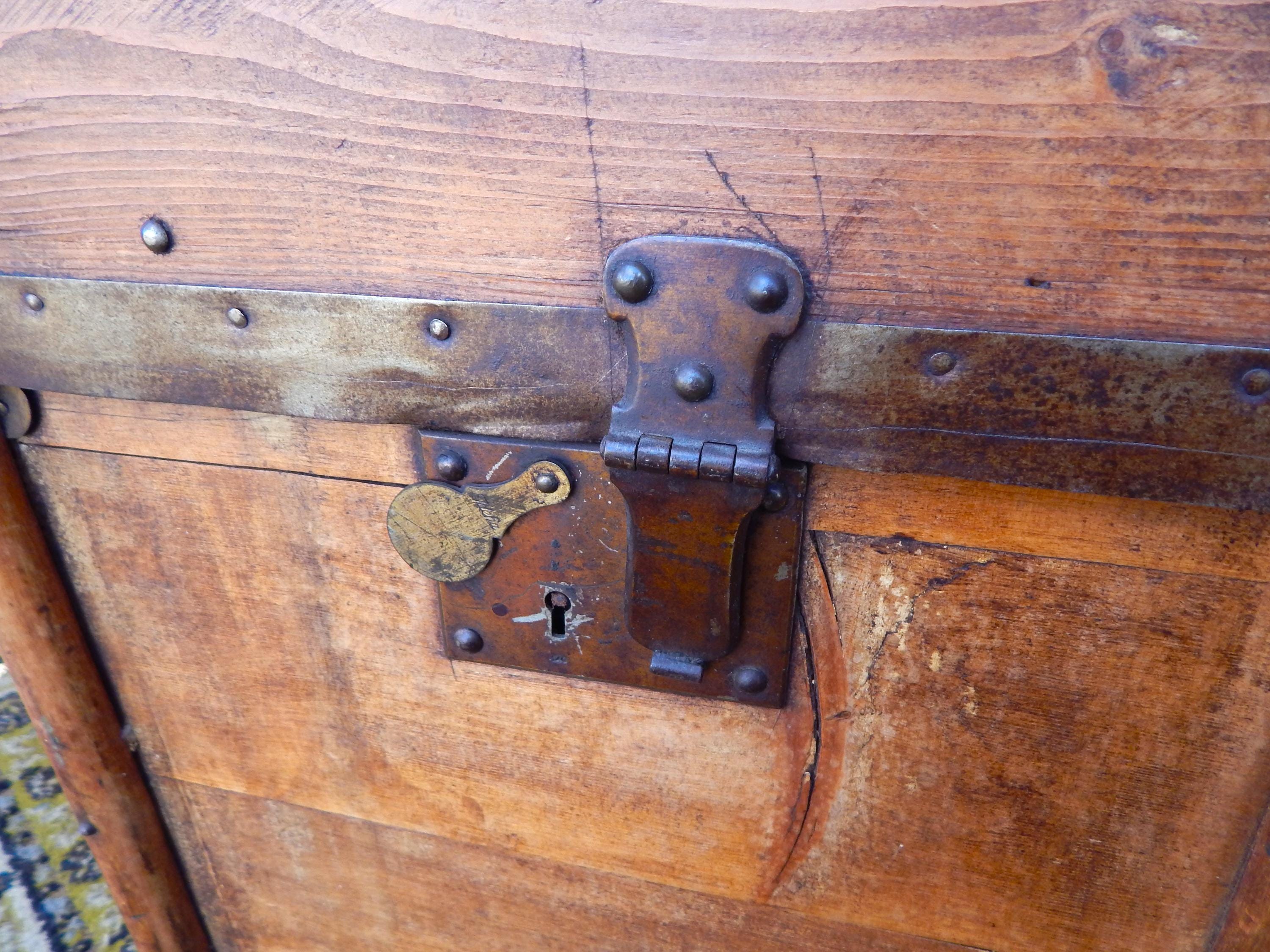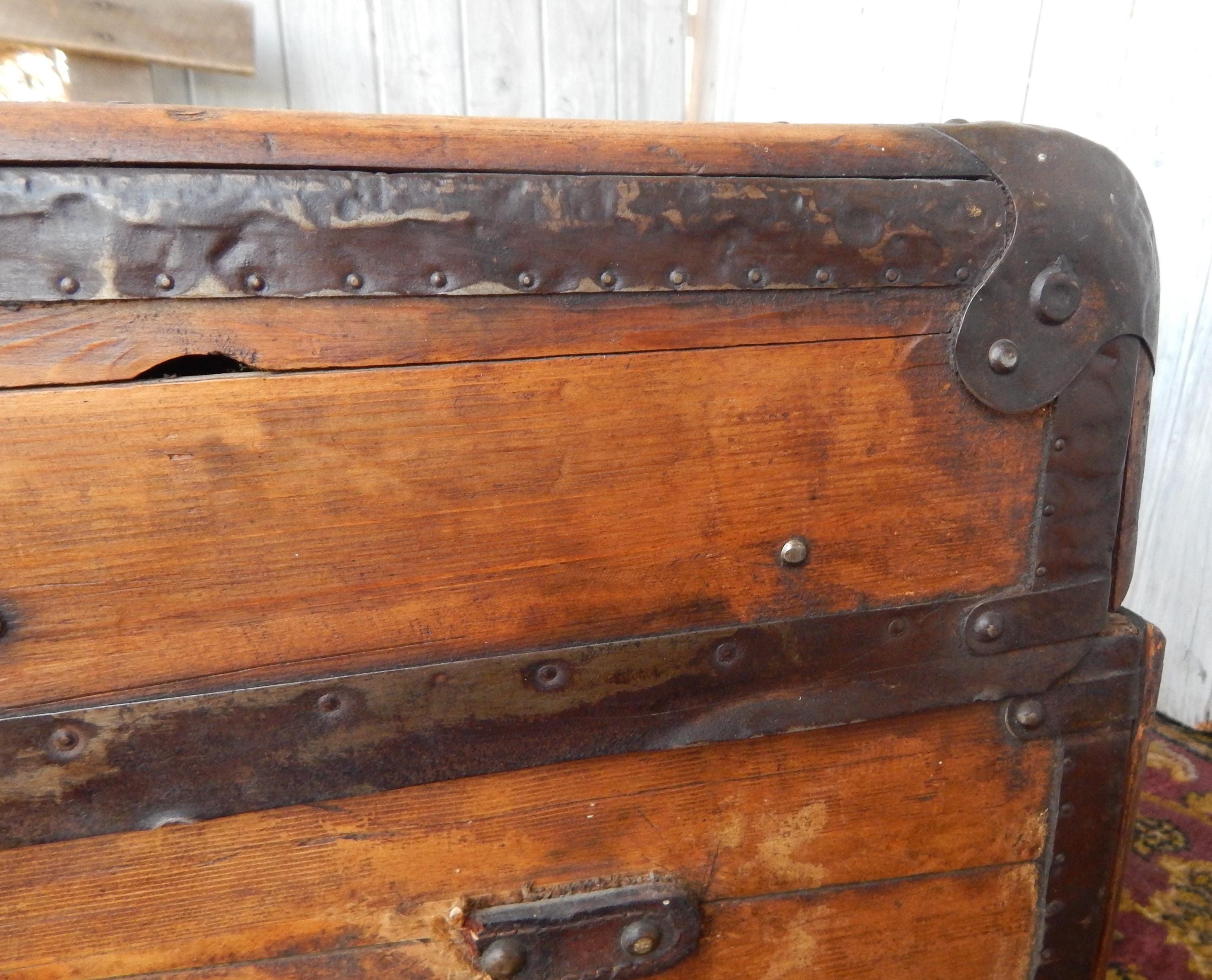 Interesting 'light weight' iron bound and brass trimmed trunk. Wood used to construct it is 1/4" thick instead of the usual 1/2" or 3/4" inch. Great color. Bentwood with brass trim and iron bounding all around. Latches work well. Keys are of course long gone. One leather carry strap is broken as shown. Overall very good condition with only minor scuffs and wear from use. Measures 43W x 20D x 18H.