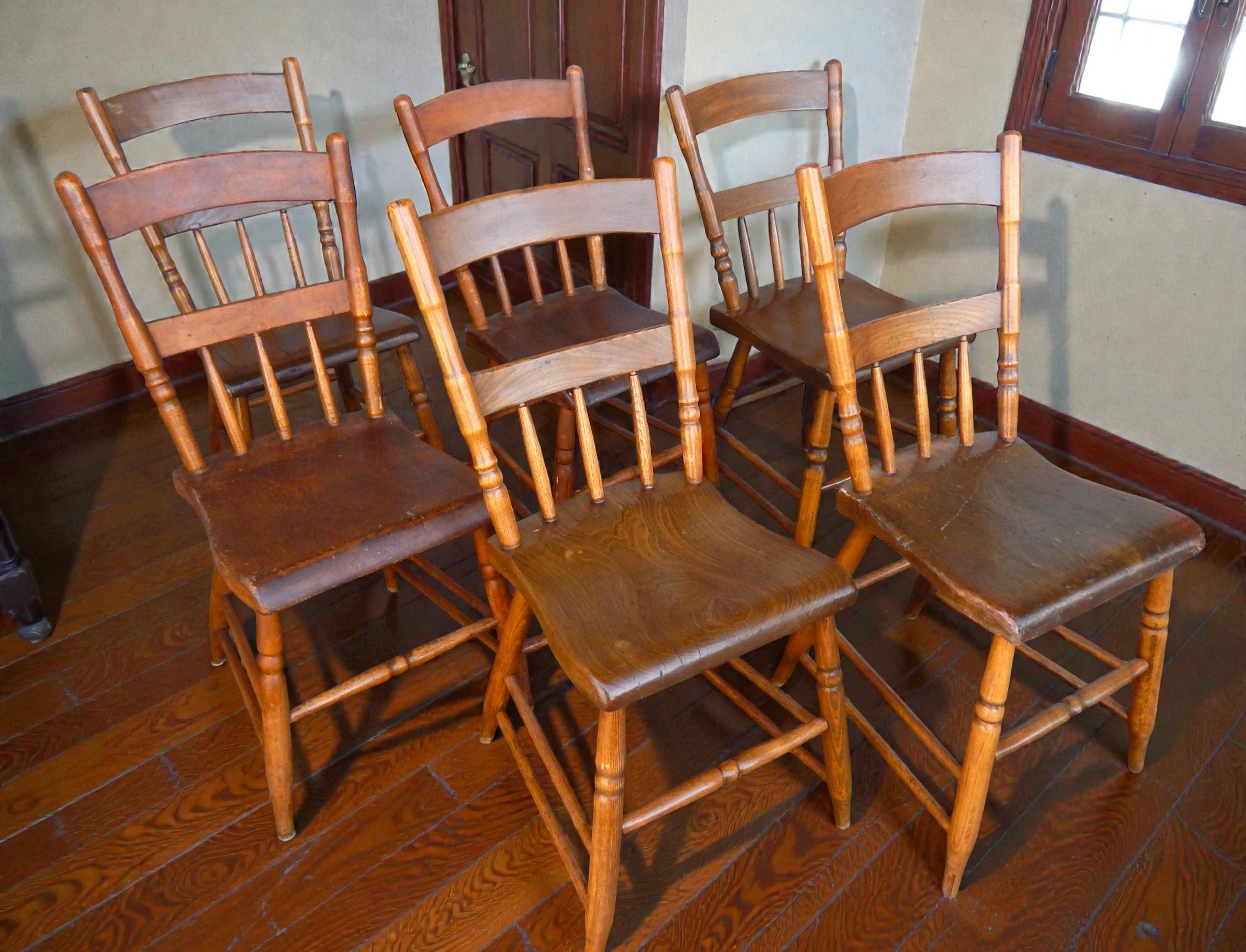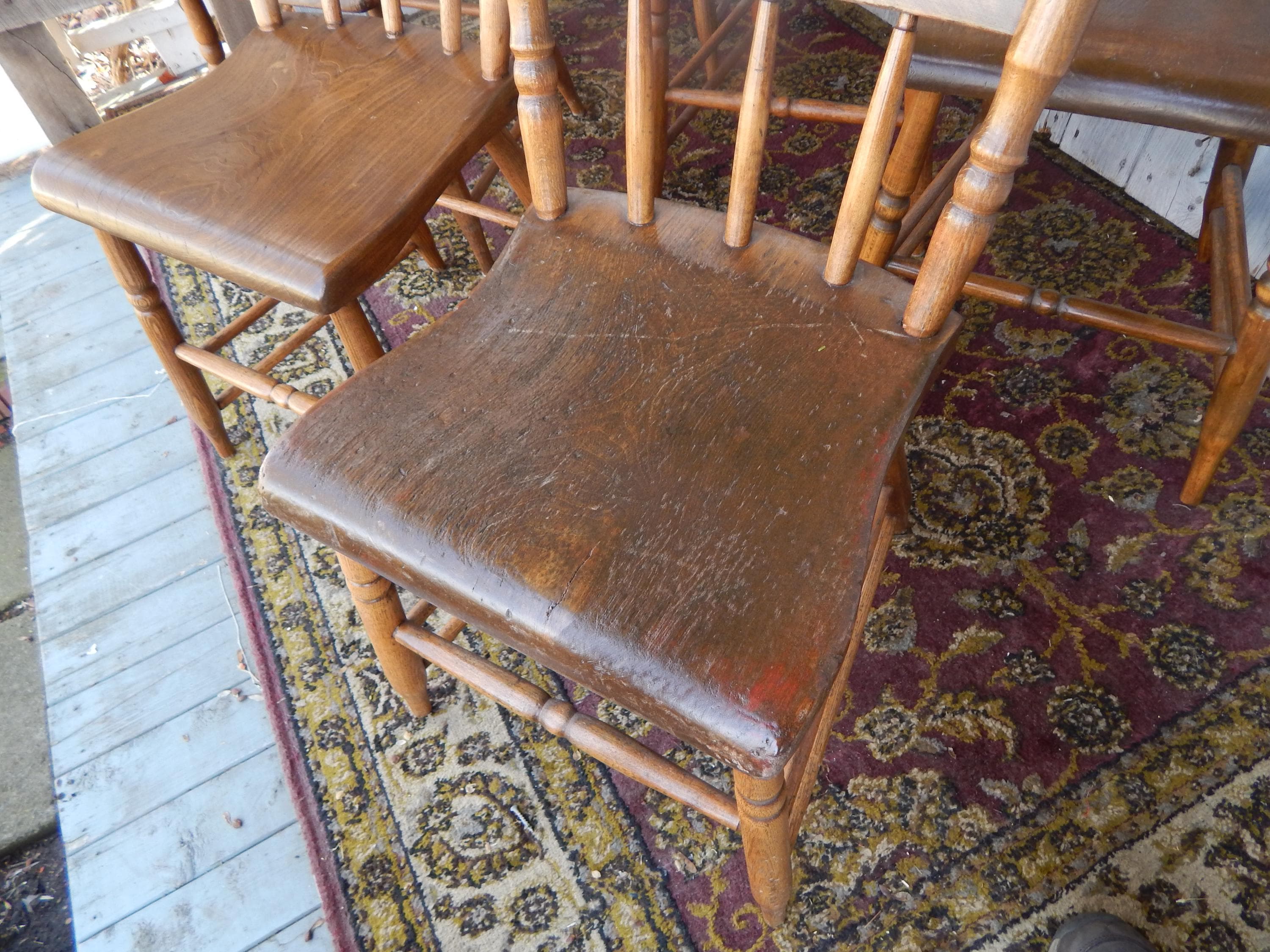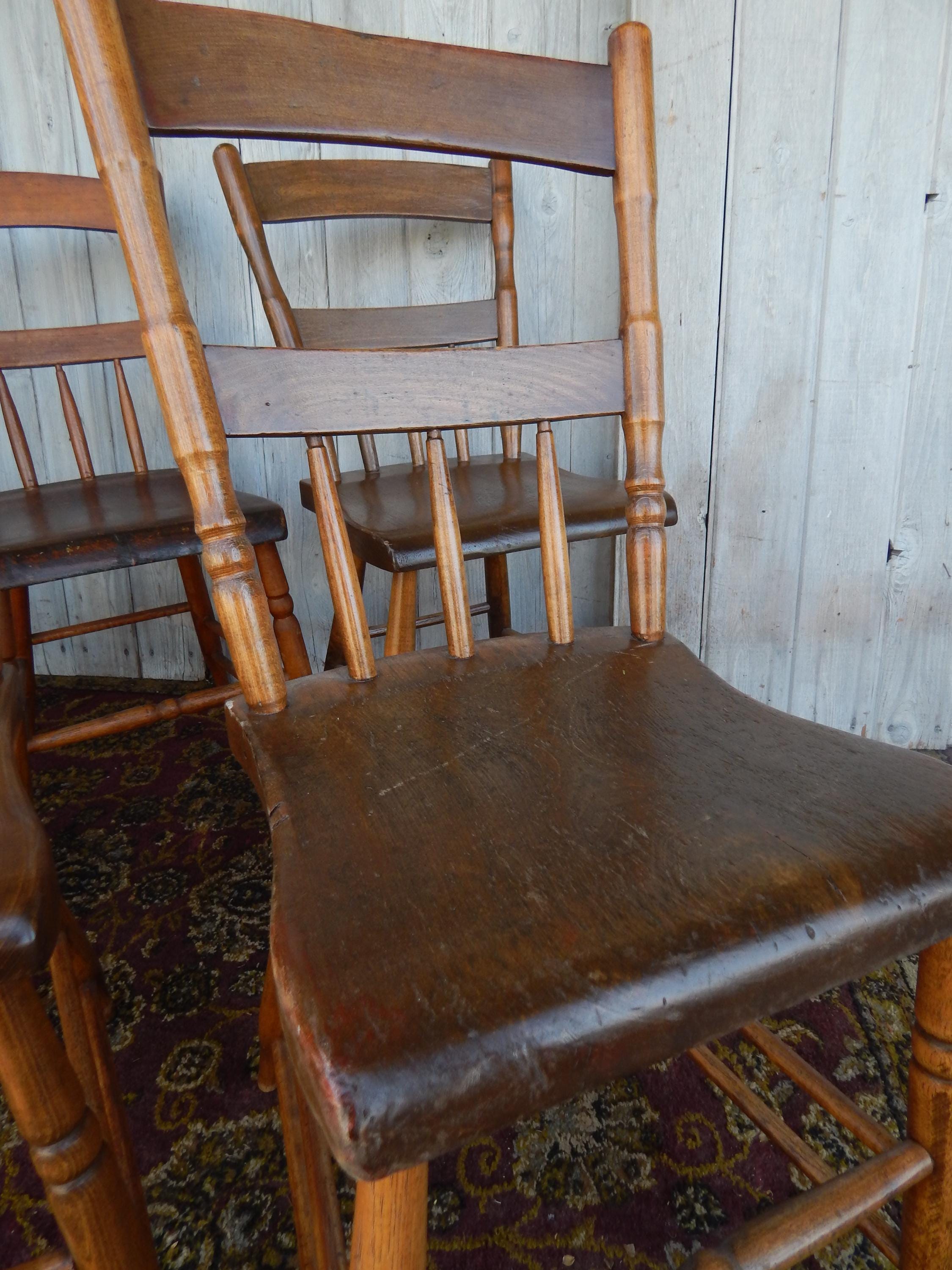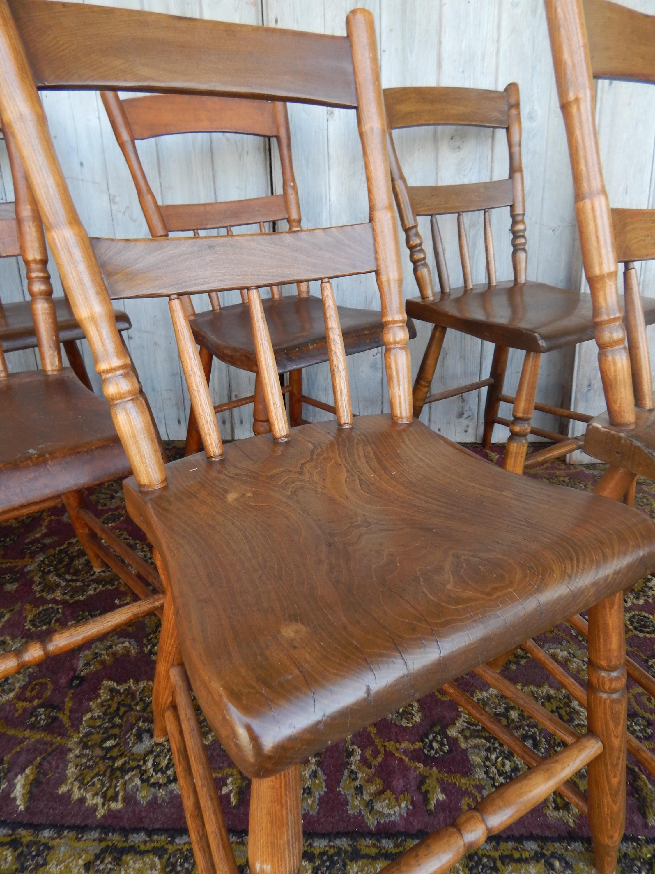 Full set of six 19th century plank bottom farmhouse kitchen/dining/side chairs. Called 'plank bottom' as the seats are a single plank of wood, in this case 15" wide. Lovely patinaed finish and tone. All joinery is very tight. No wobbles or loose pieces. No splits or cracks. Nothing broken. Expected wear as shown. Each measures 33"H x 15"W x 14"D. Seat height is 18".