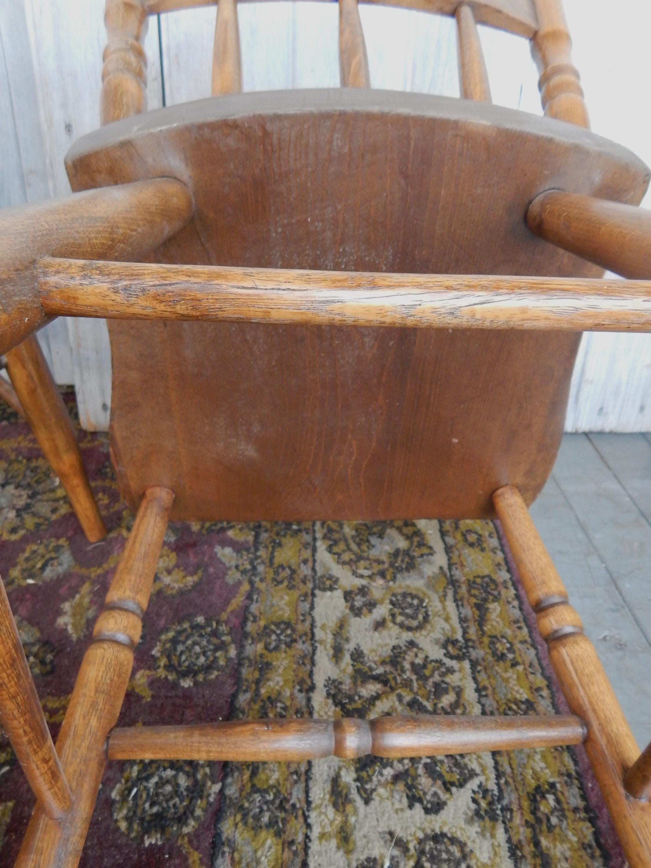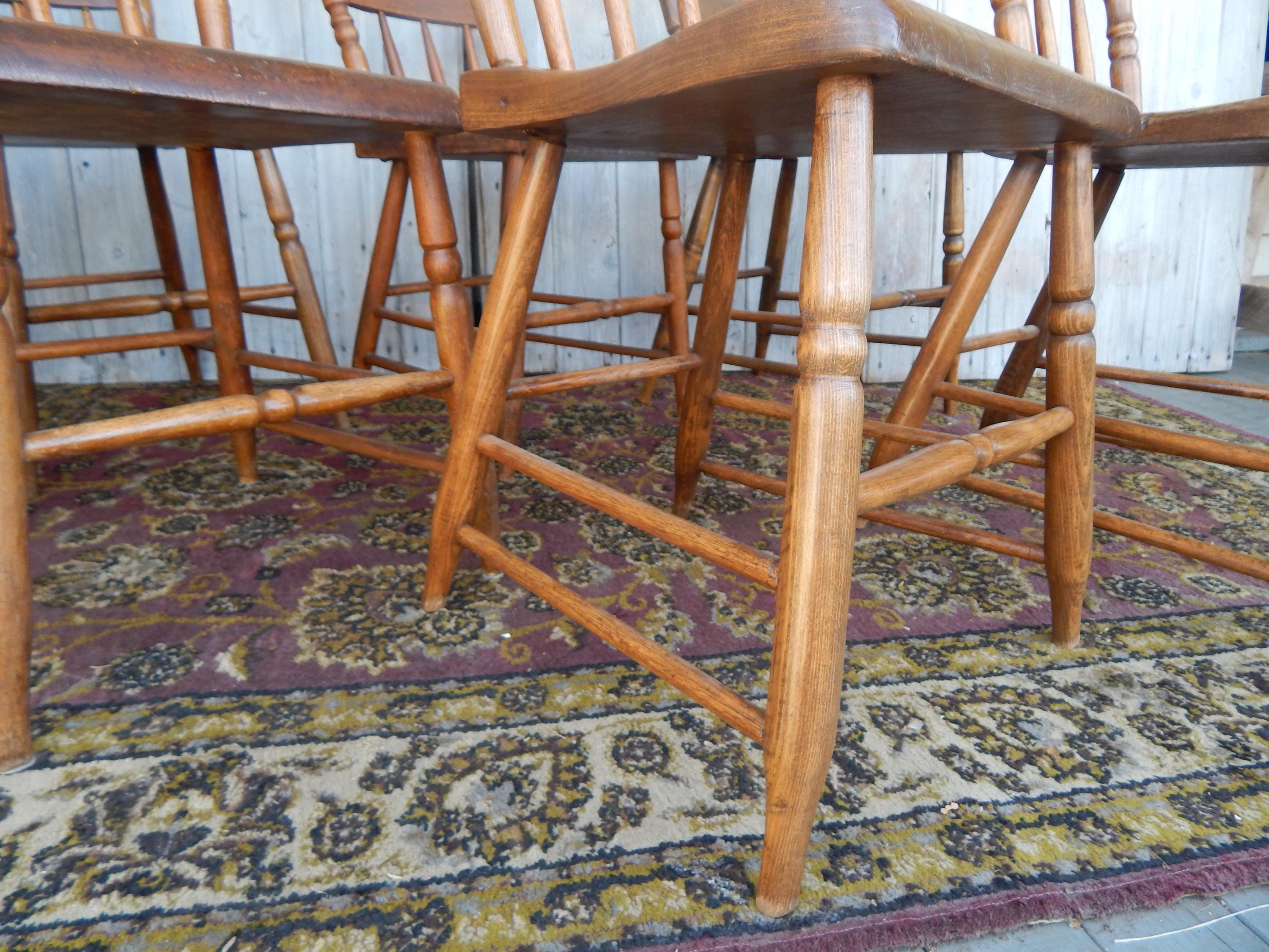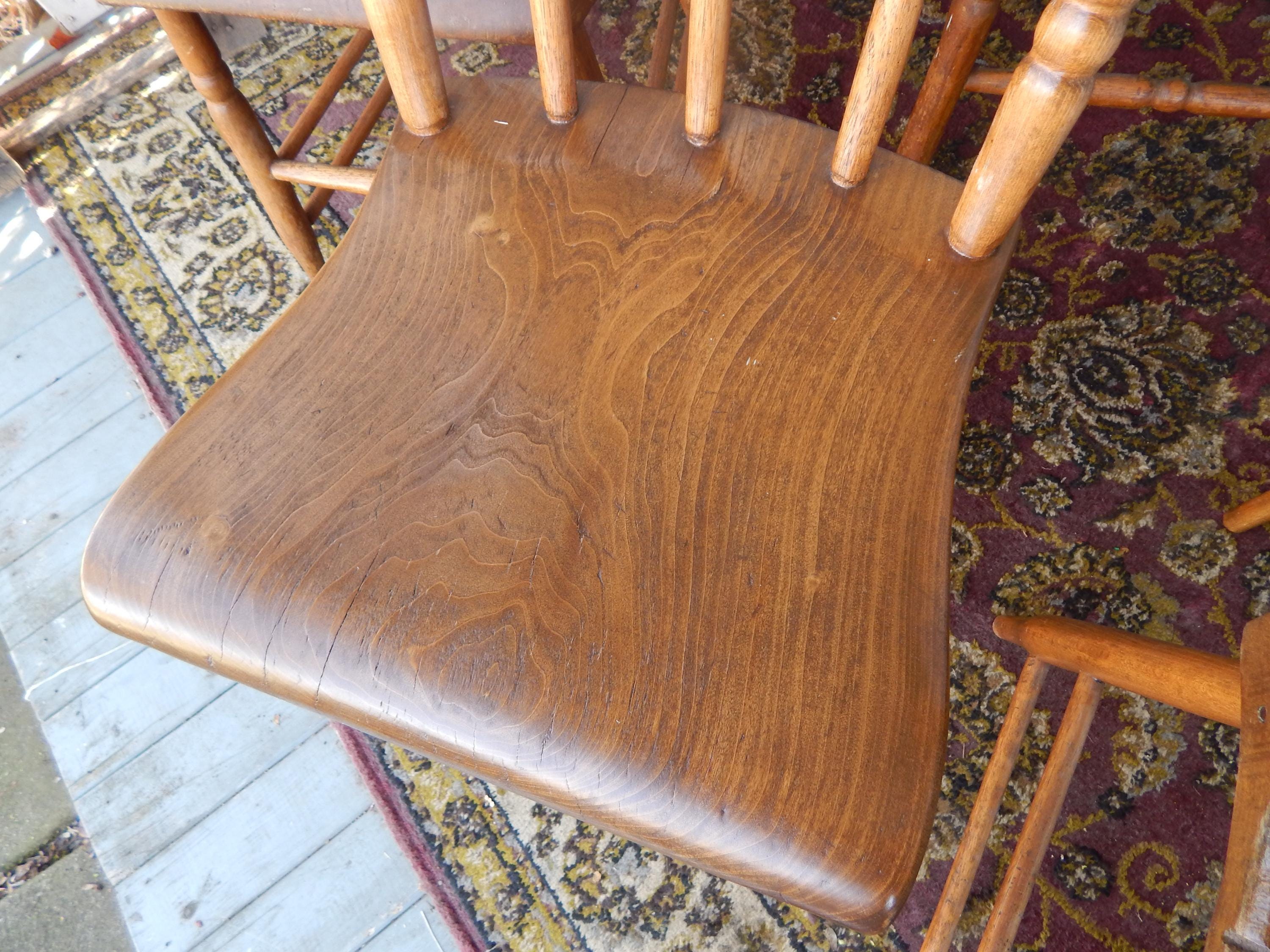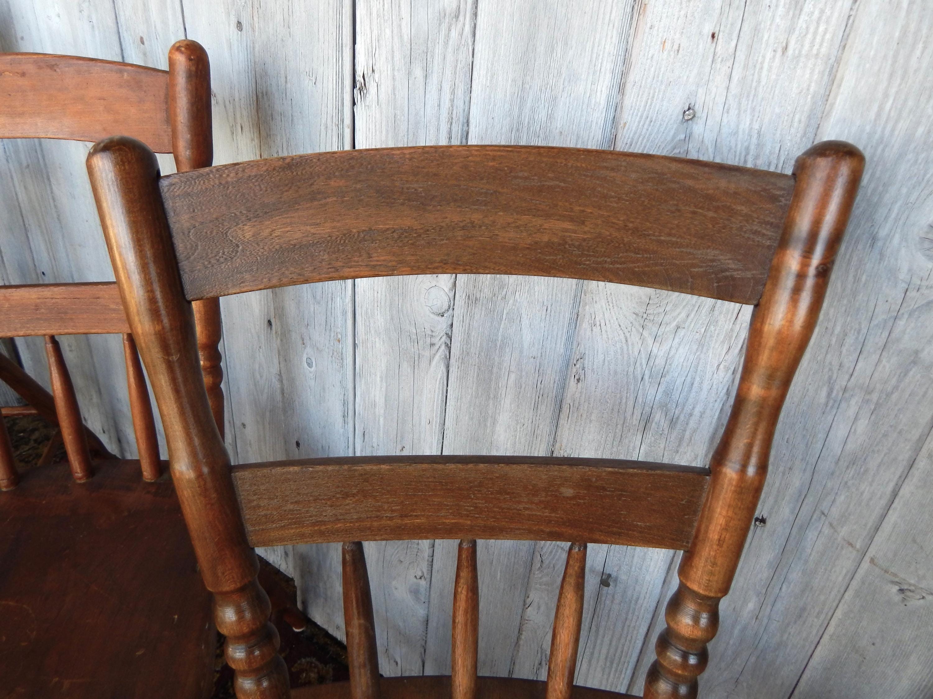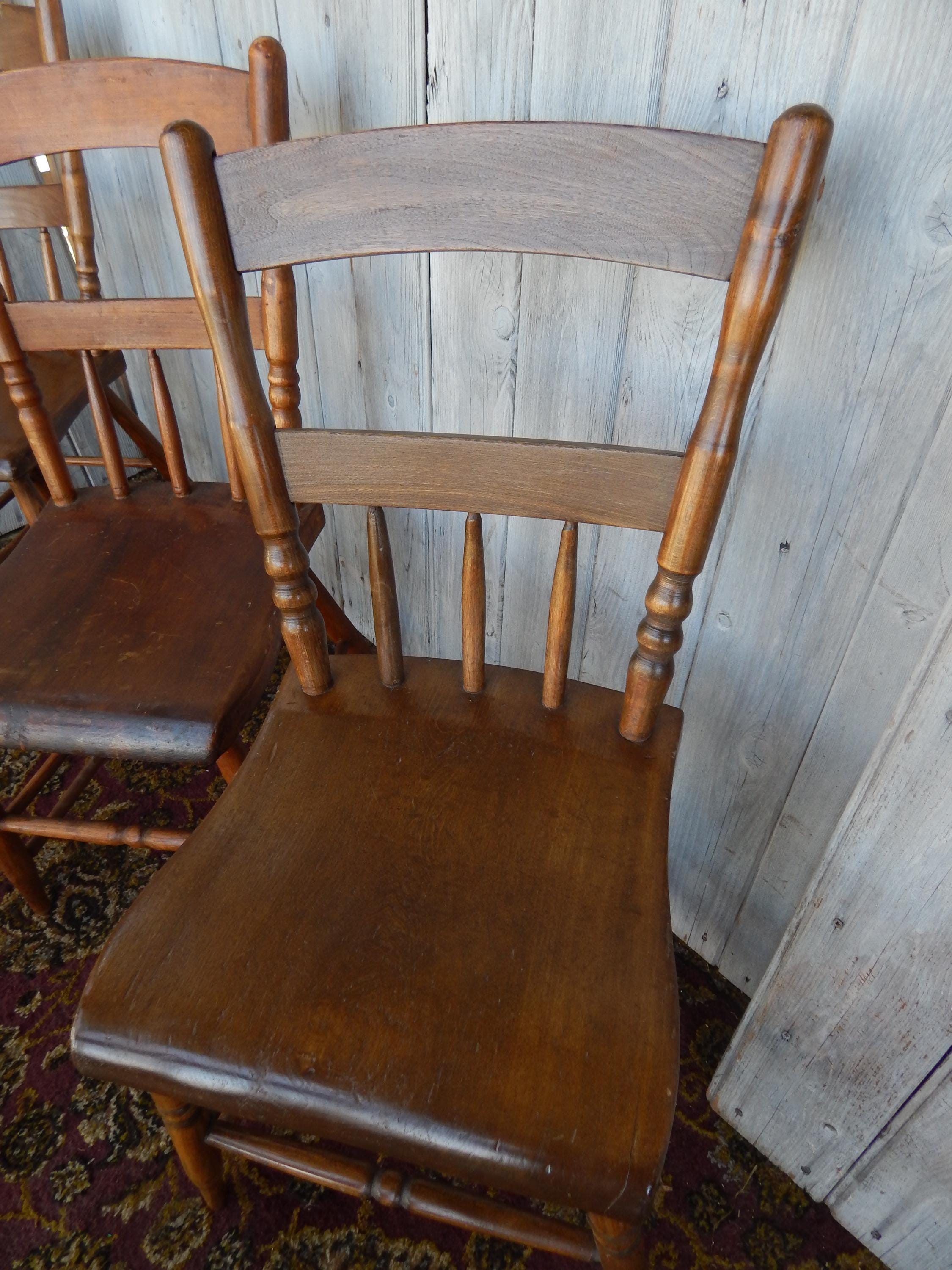 Full set of six 19th century plank bottom farmhouse kitchen/dining/side chairs. Called 'plank bottom' as the seats are a single plank of wood, in this case 15" wide. Lovely patinaed finish and tone. All joinery is very tight. No wobbles or loose pieces. No splits or cracks. Nothing broken. Expected wear as shown. Each measures 33"H x 15"W x 14"D. Seat height is 18".