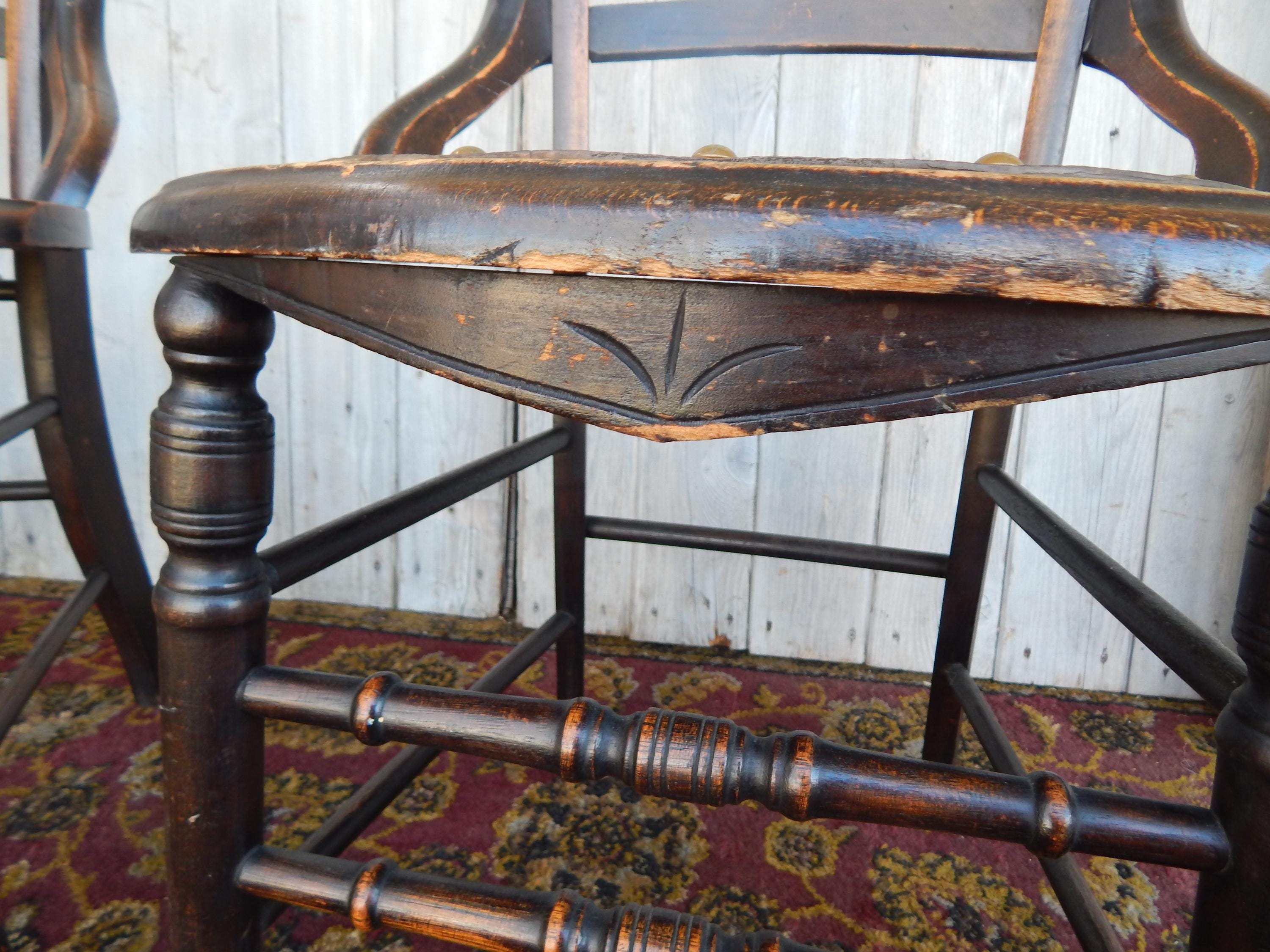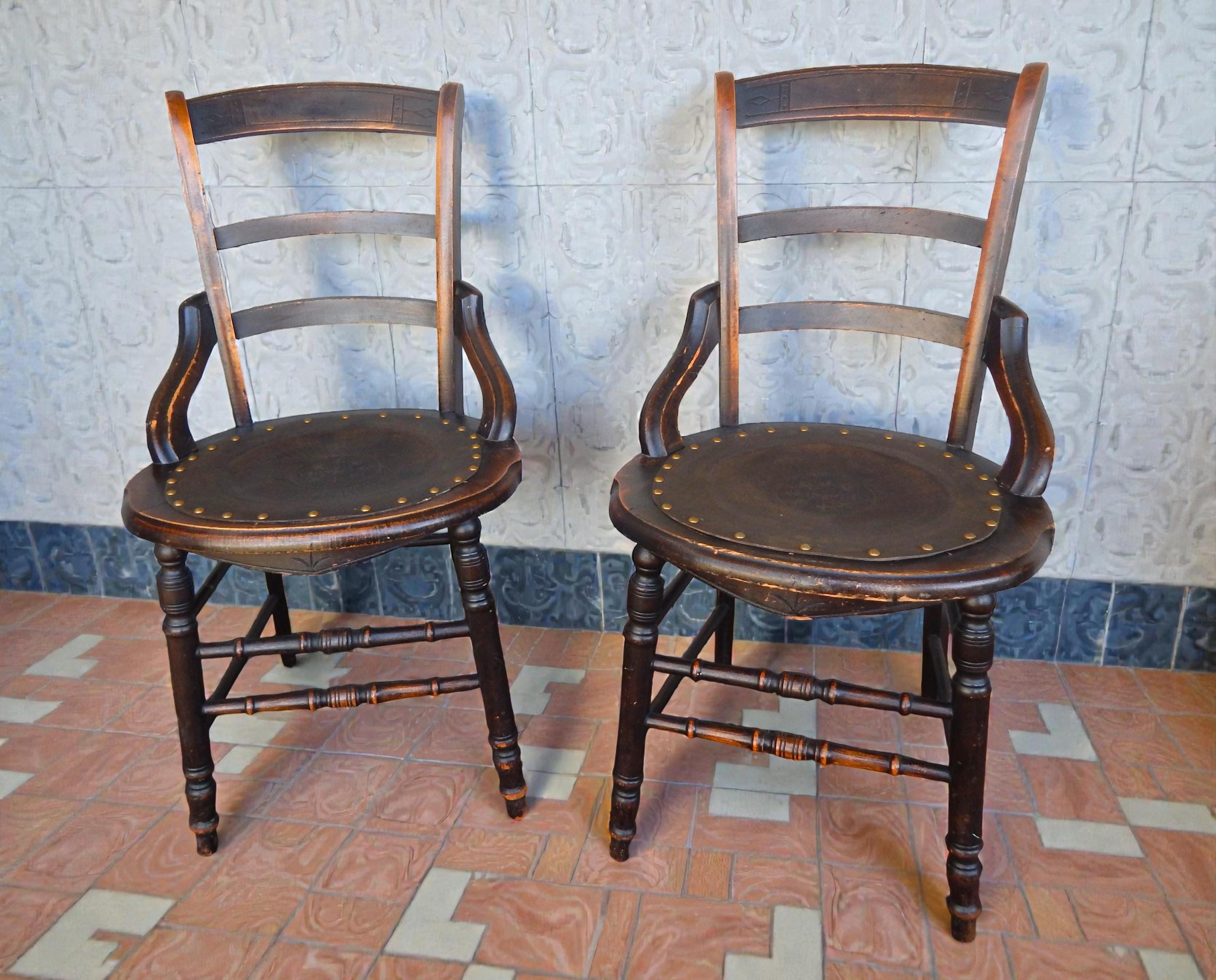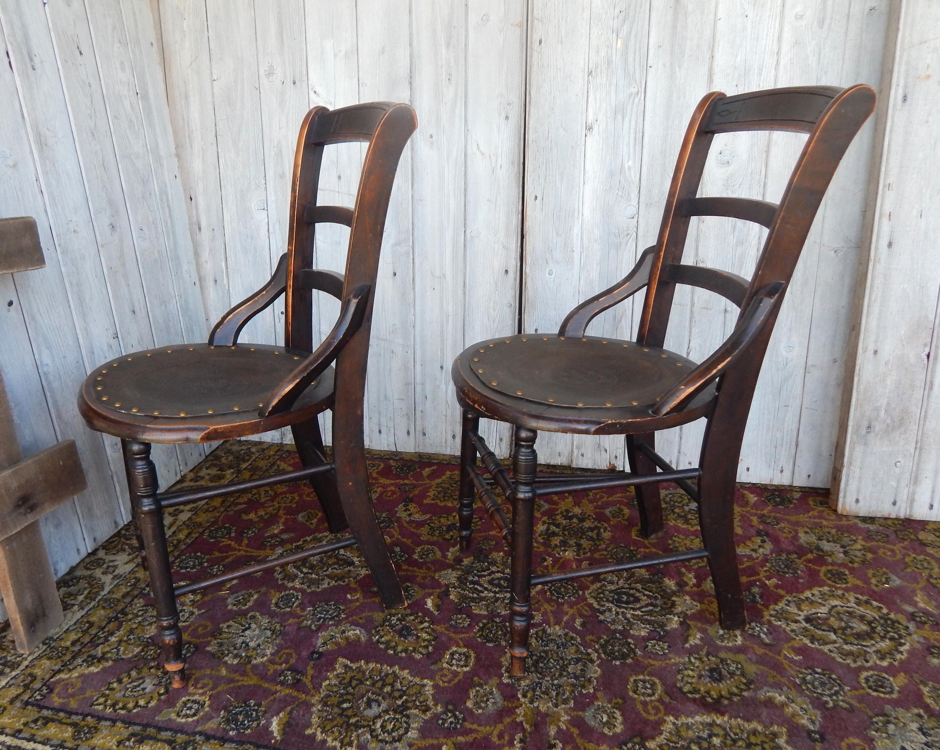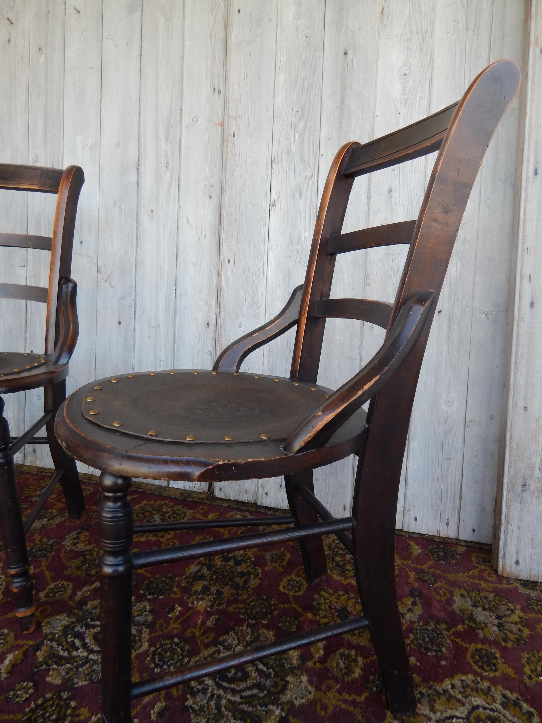 We've seen lots of tooled patterns in this type of leather seat chair, but never the Fleur Du Lis until now. Would certainly signify a more 'high end' owner 150 years ago. Leather is in very good condition and firmly tacked to frame. Dark finish with nice carved detail and turnings. Note finish wear throughout. Joinery is all very good. Nice and snug with no wobbles. No splits, cracks, or missing pieces. Each measures 35"H x 18"W x 16.5"D. Seat height is 18". Price is for the pair.