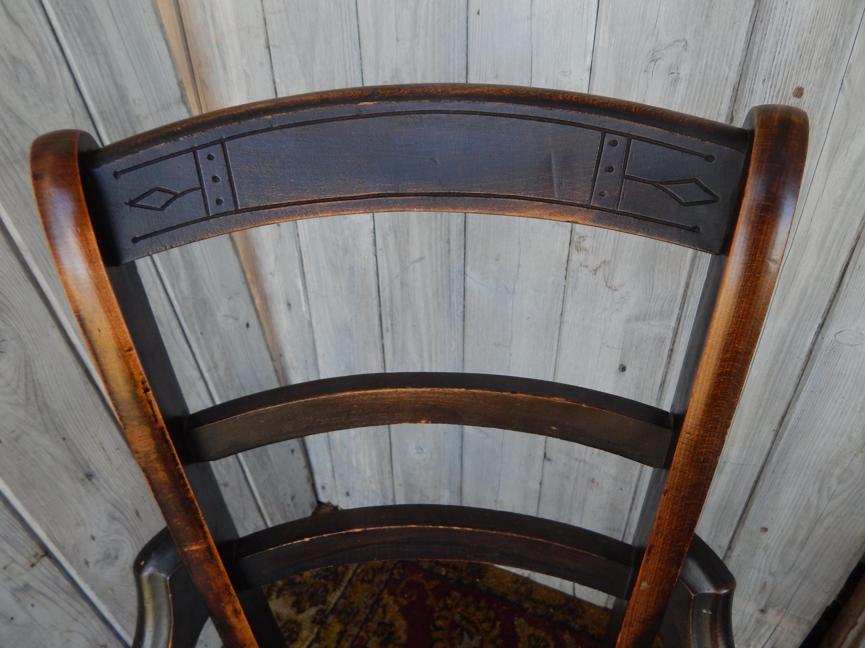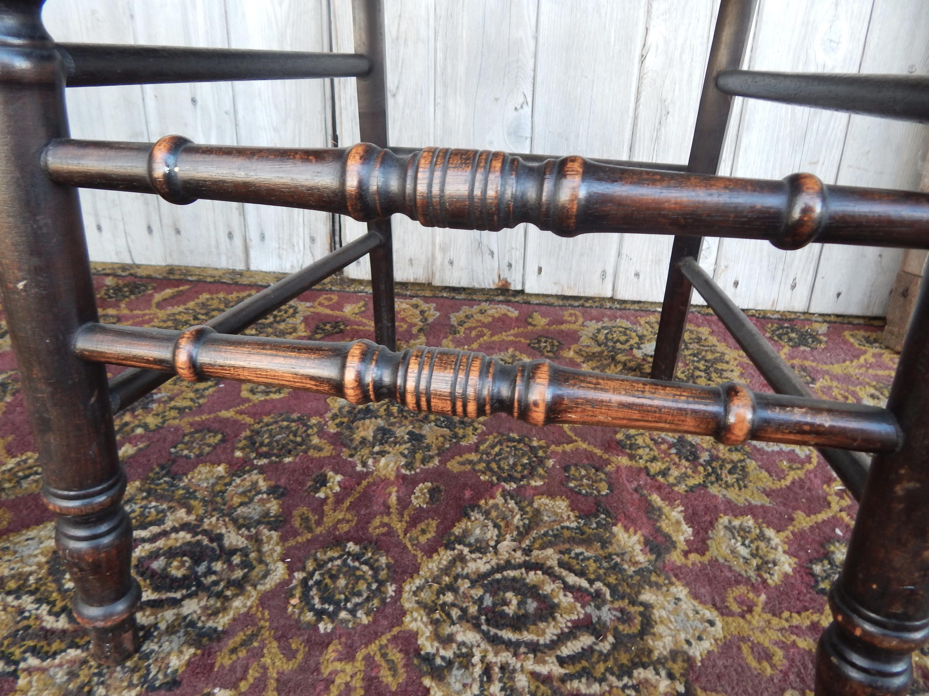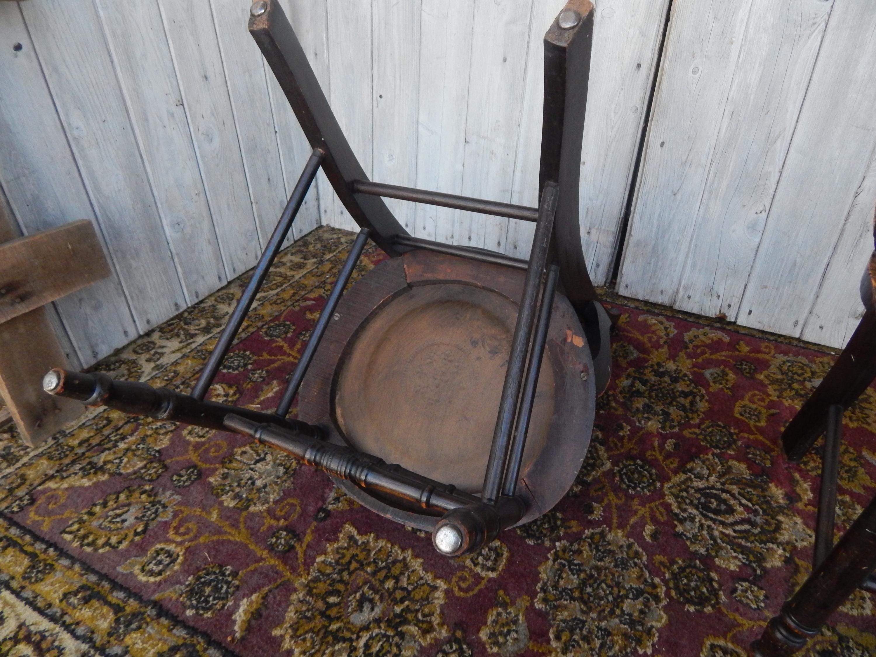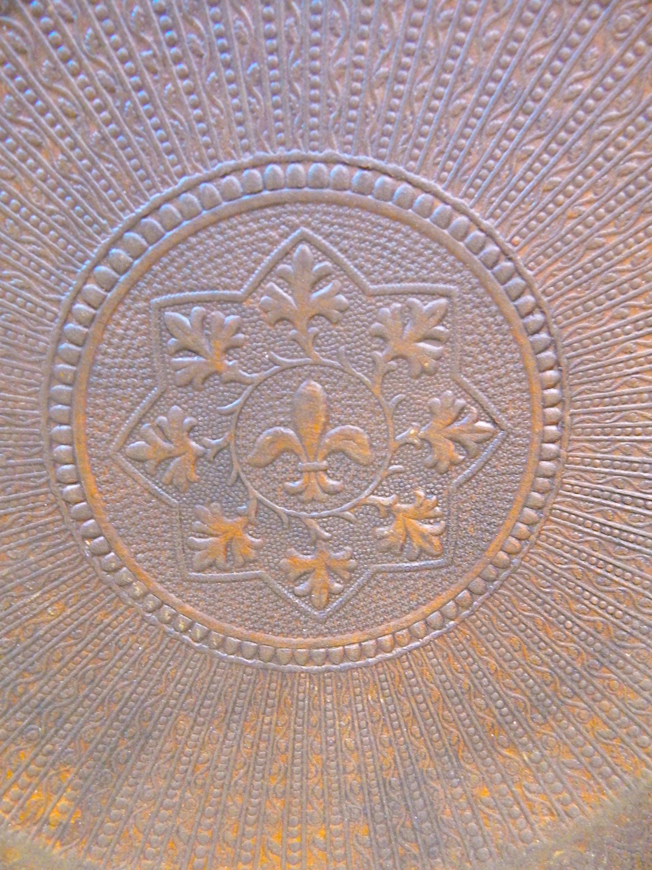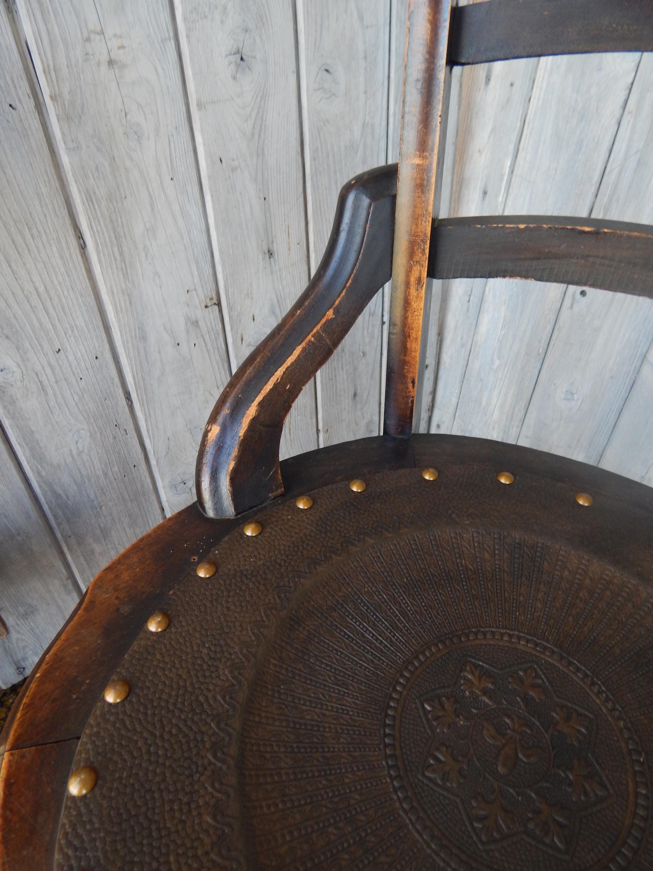 We've seen lots of tooled patterns in this type of leather seat chair, but never the Fleur Du Lis until now. Would certainly signify a more 'high end' owner 150 years ago. Leather is in very good condition and firmly tacked to frame. Dark finish with nice carved detail and turnings. Note finish wear throughout. Joinery is all very good. Nice and snug with no wobbles. No splits, cracks, or missing pieces. Each measures 35"H x 18"W x 16.5"D. Seat height is 18". Price is for the pair.