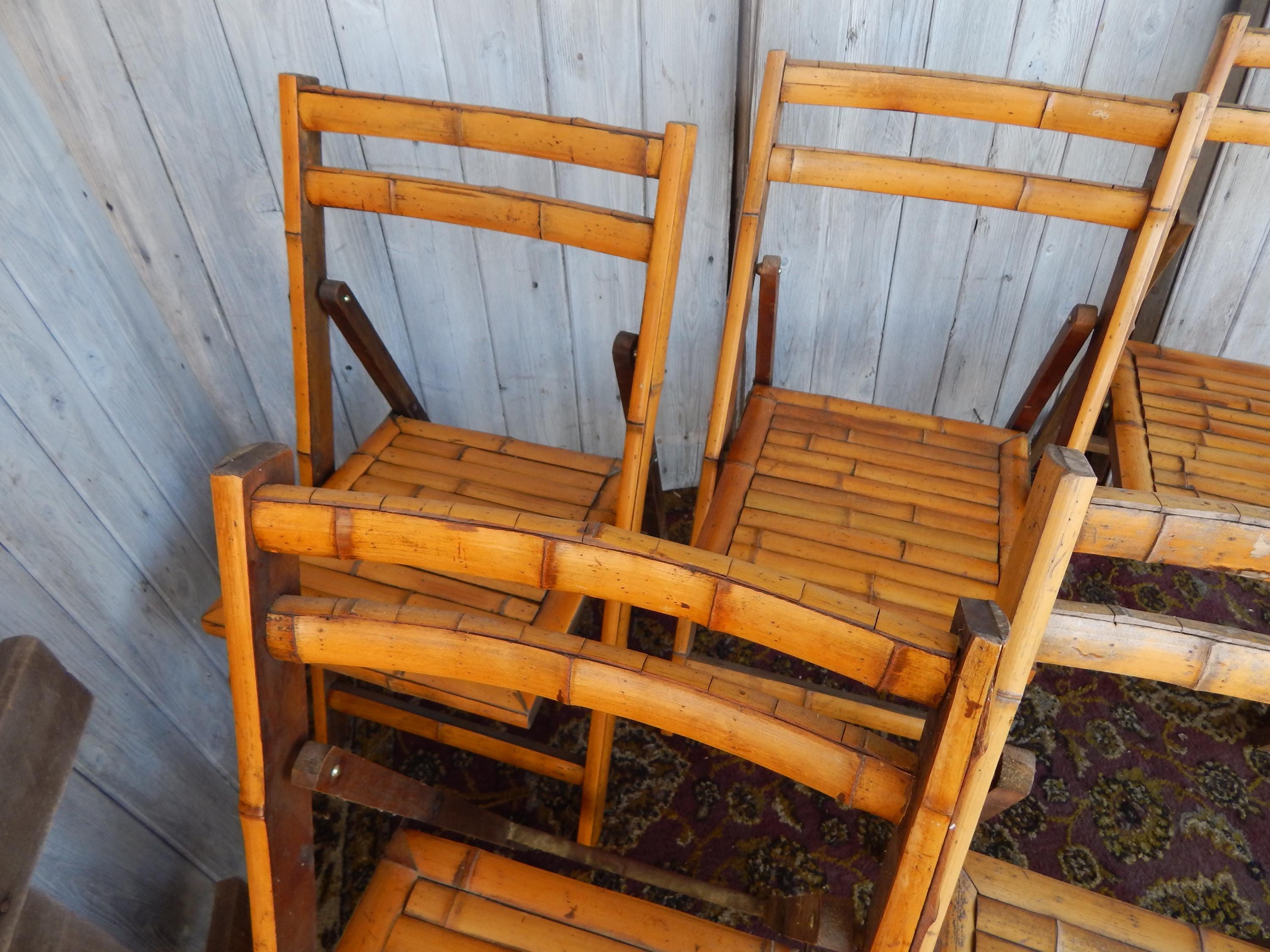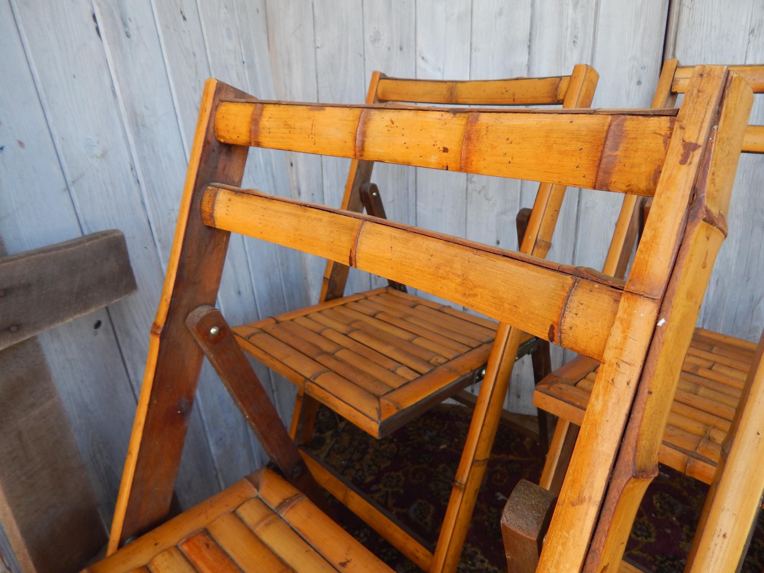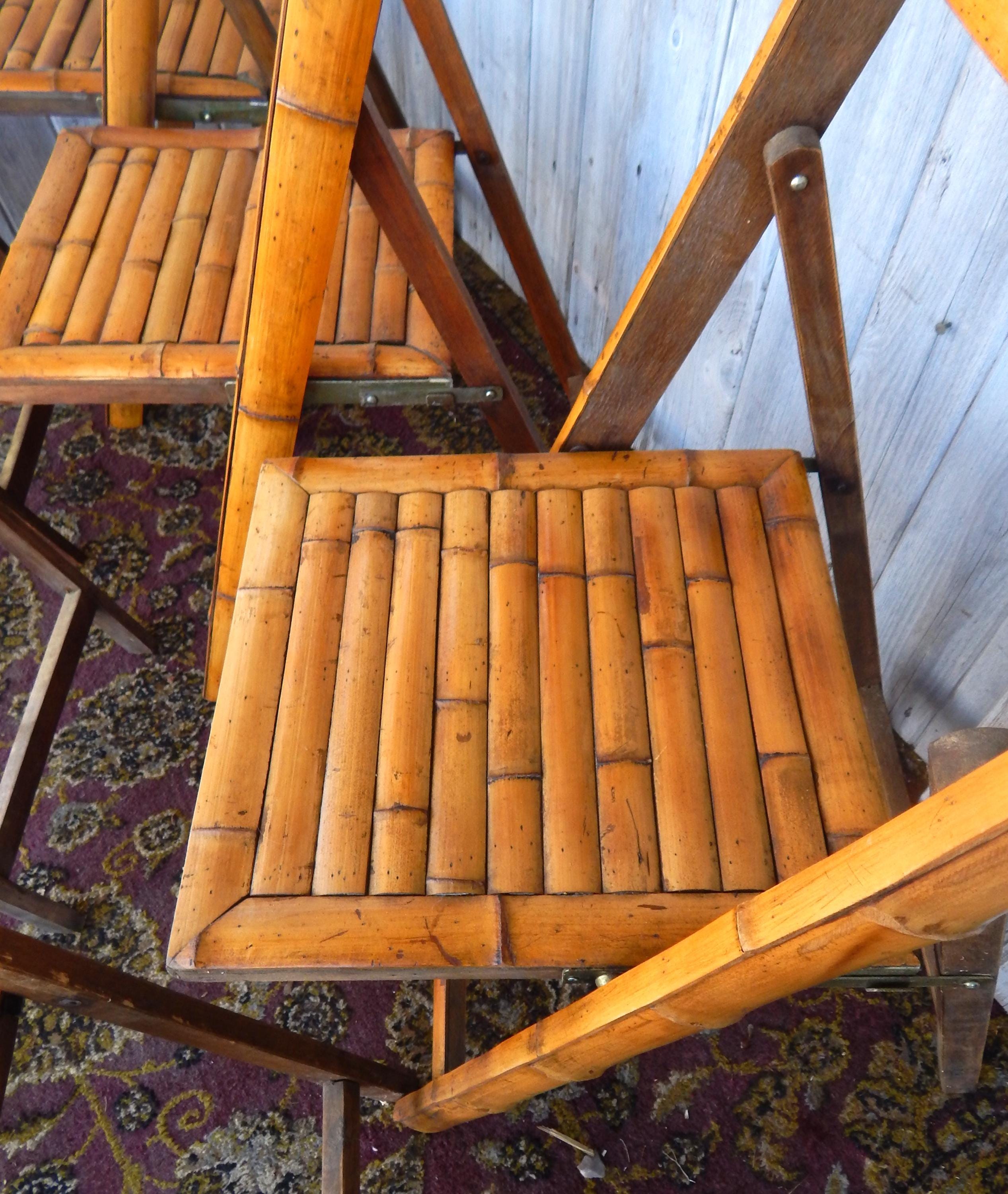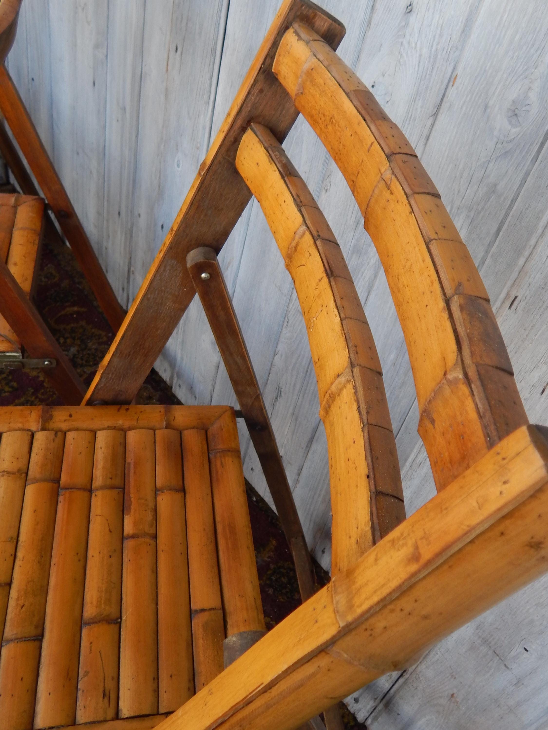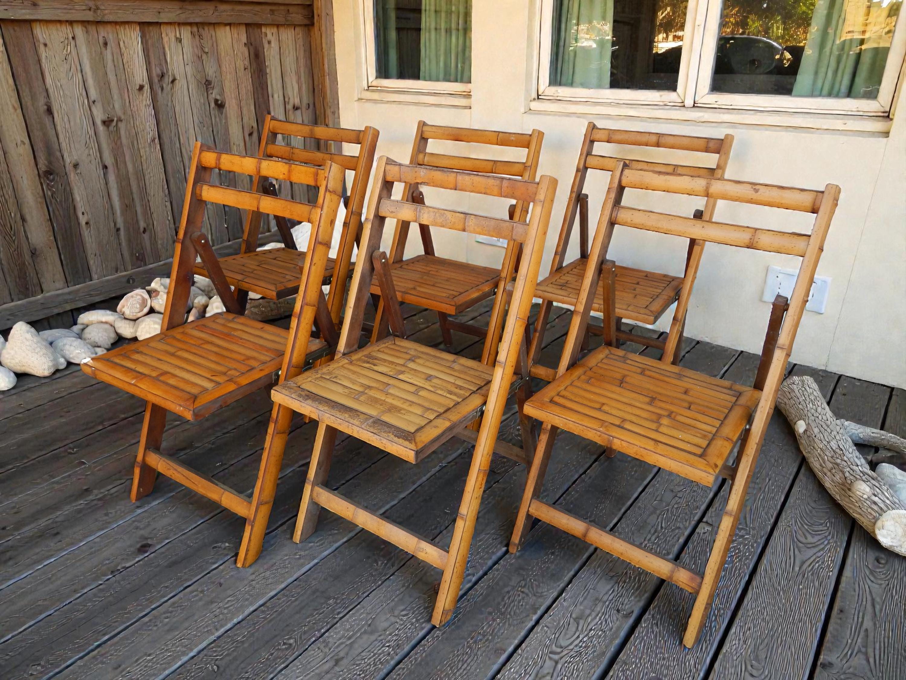 Nice tropical throwback to the 1970's. Split bamboo and hardwood folding chairs. Set of six. All hardware in good shape. All fold as they should No missing parts, no rot. Joinery very good. No undo wobbles. Finish wear in spots as to be expected for their age. Each measures 35H x 15W x 16D. Seat height is 18.5"