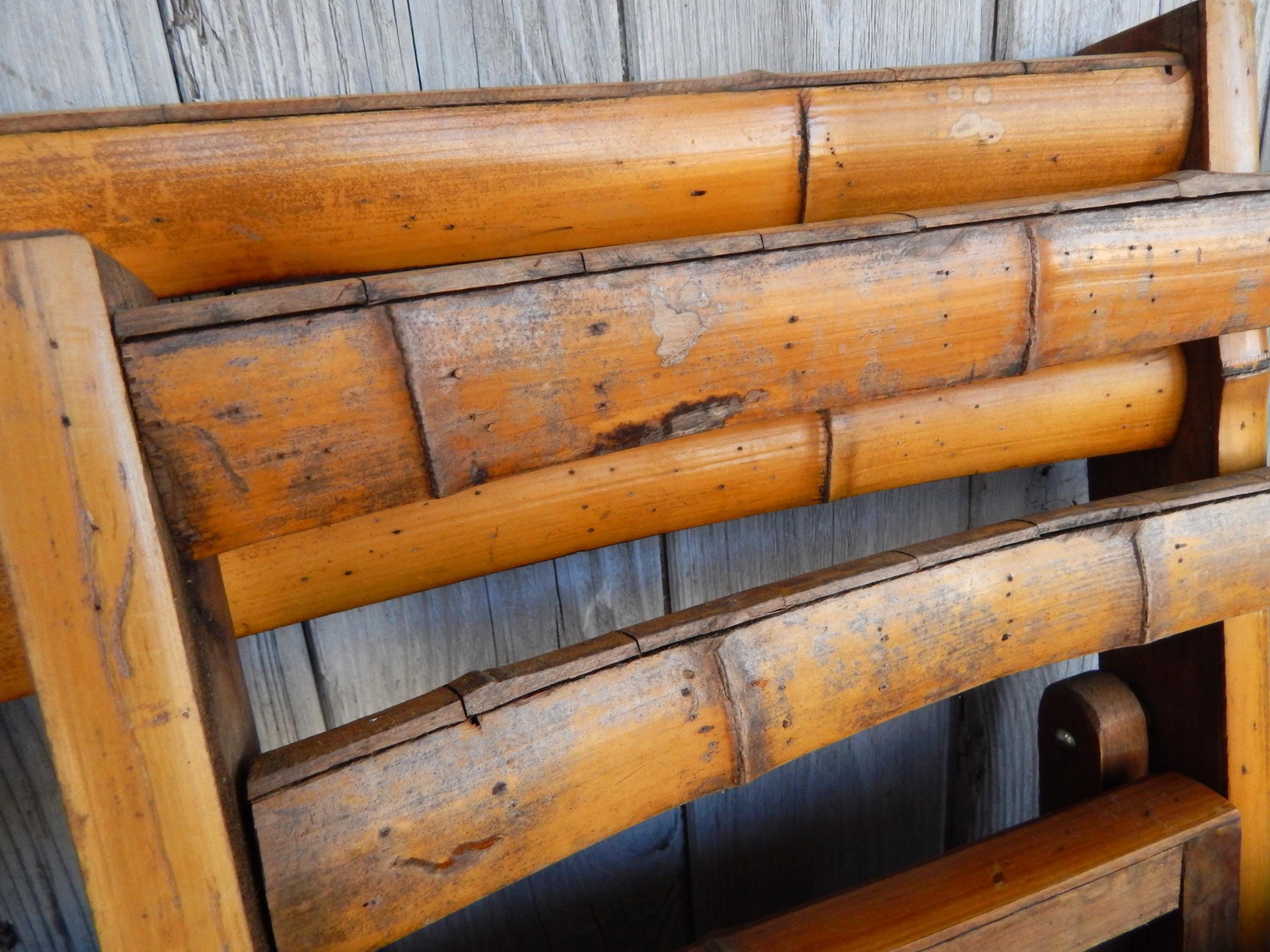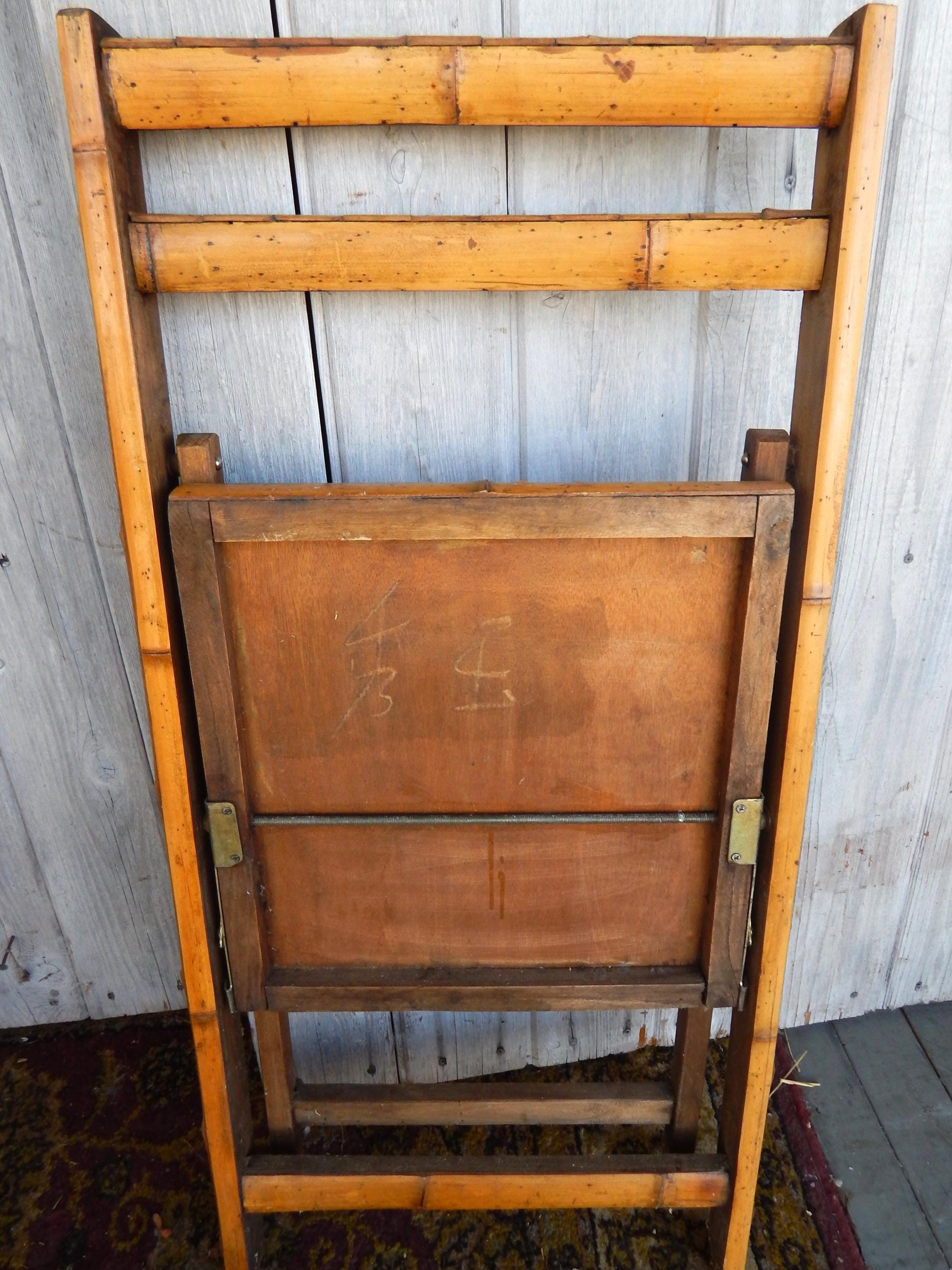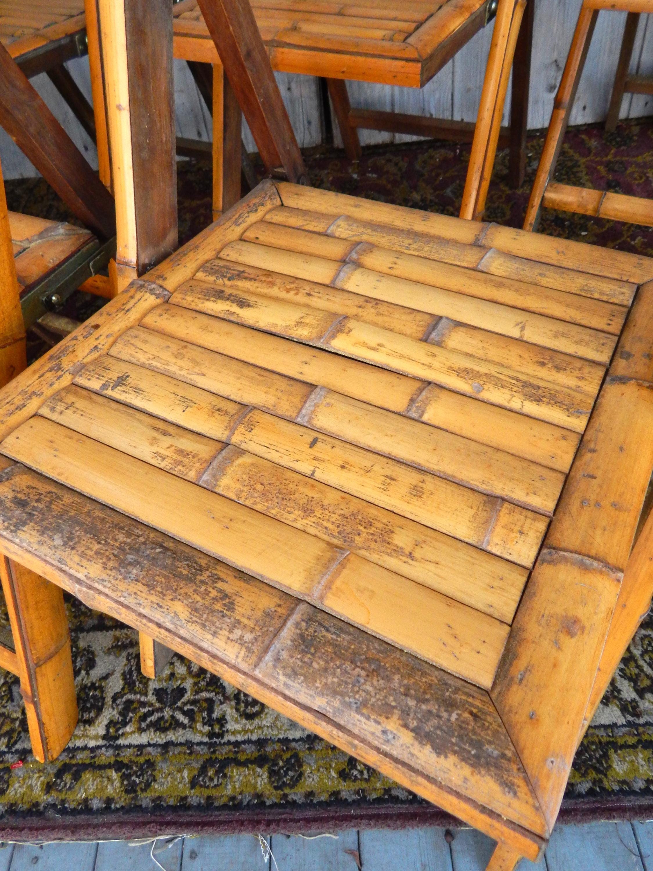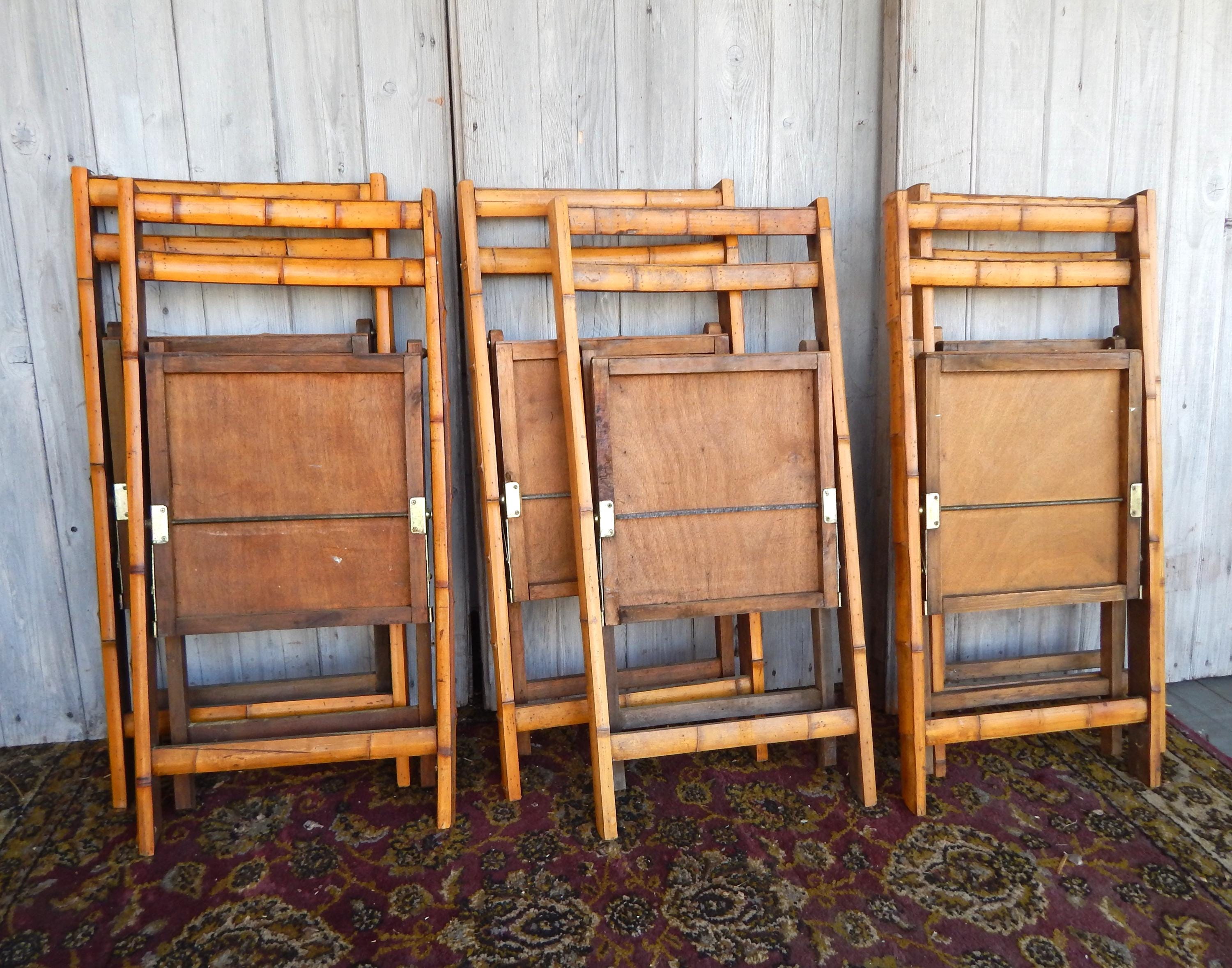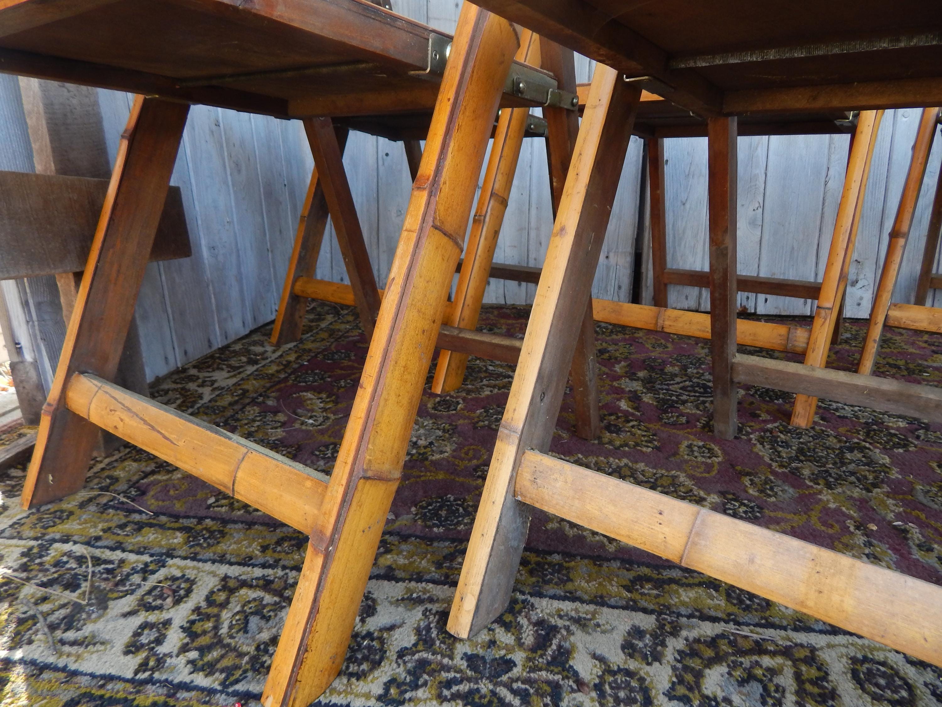 Nice tropical throwback to the 1970's. Split bamboo and hardwood folding chairs. Set of six. All hardware in good shape. All fold as they should No missing parts, no rot. Joinery very good. No undo wobbles. Finish wear in spots as to be expected for their age. Each measures 35H x 15W x 16D. Seat height is 18.5"