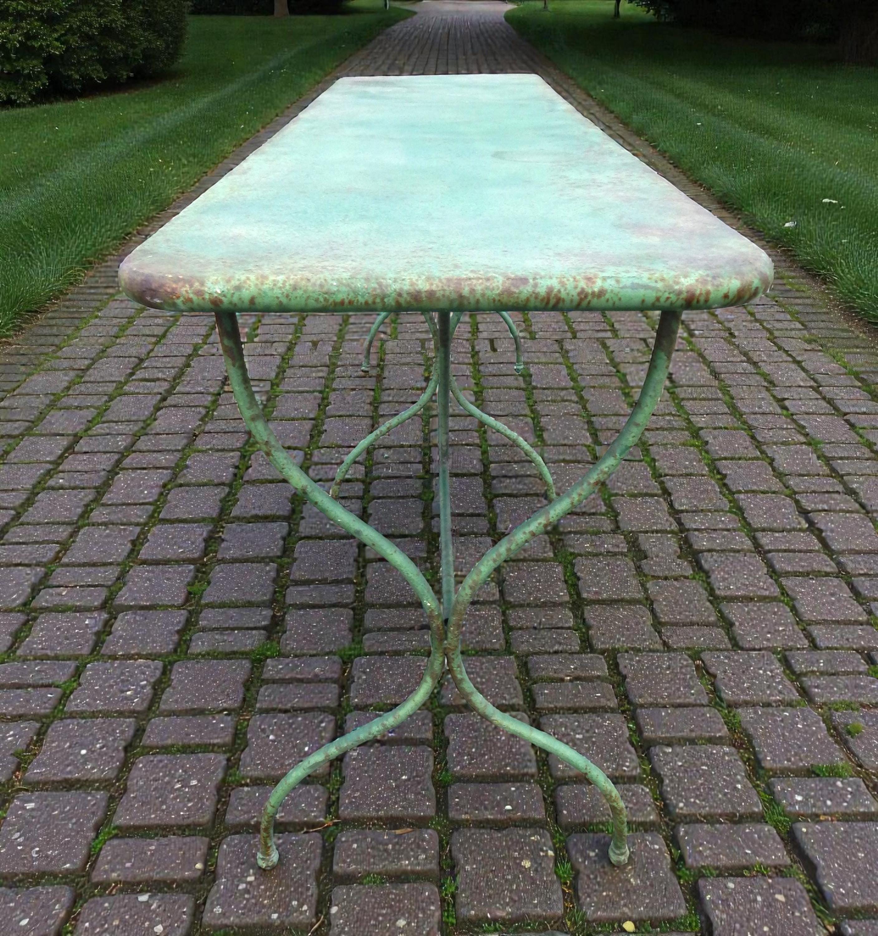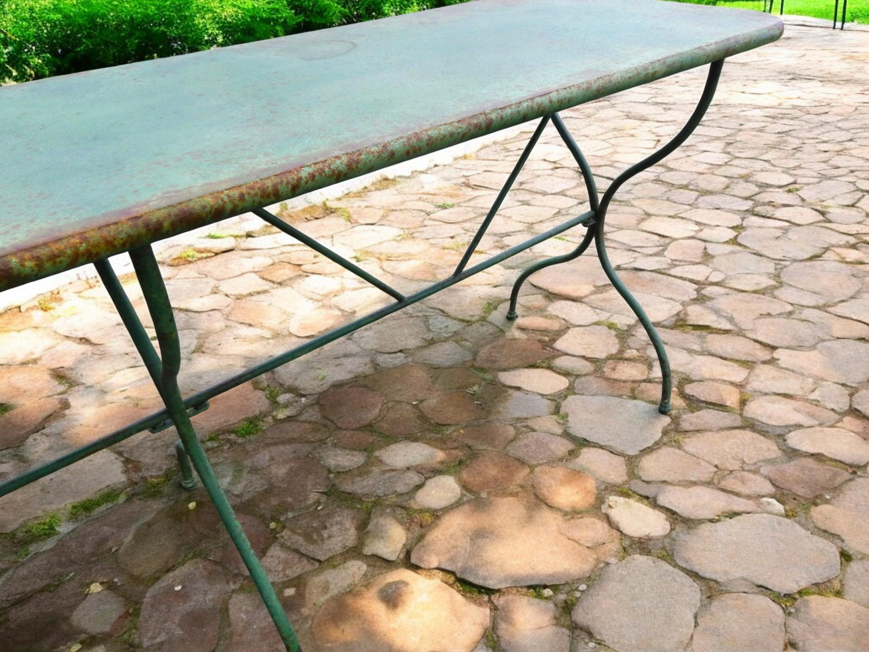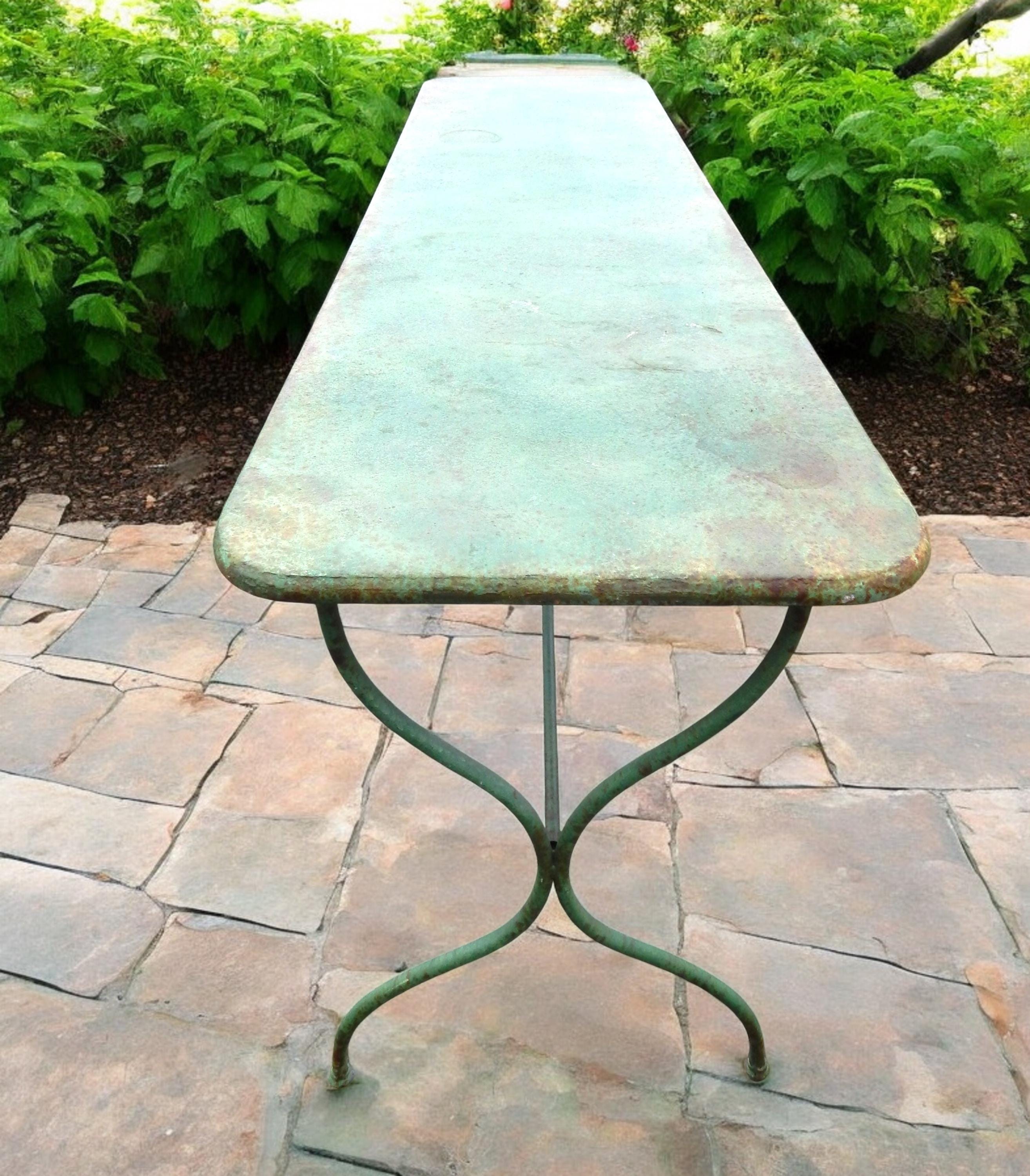 We have to admit being unable to date this to a specific decade. Construction and materials are certainly multi-generational. 1950's? 70's? Newer? In any case a fantastically patina'd French style steel bistro table. No splits, cracks, or dents. No missing pieces. Hardware nice and snug, with no wobbling. Steel top and steel heavy rod legs. Measures 72L x 20D x 29H.
