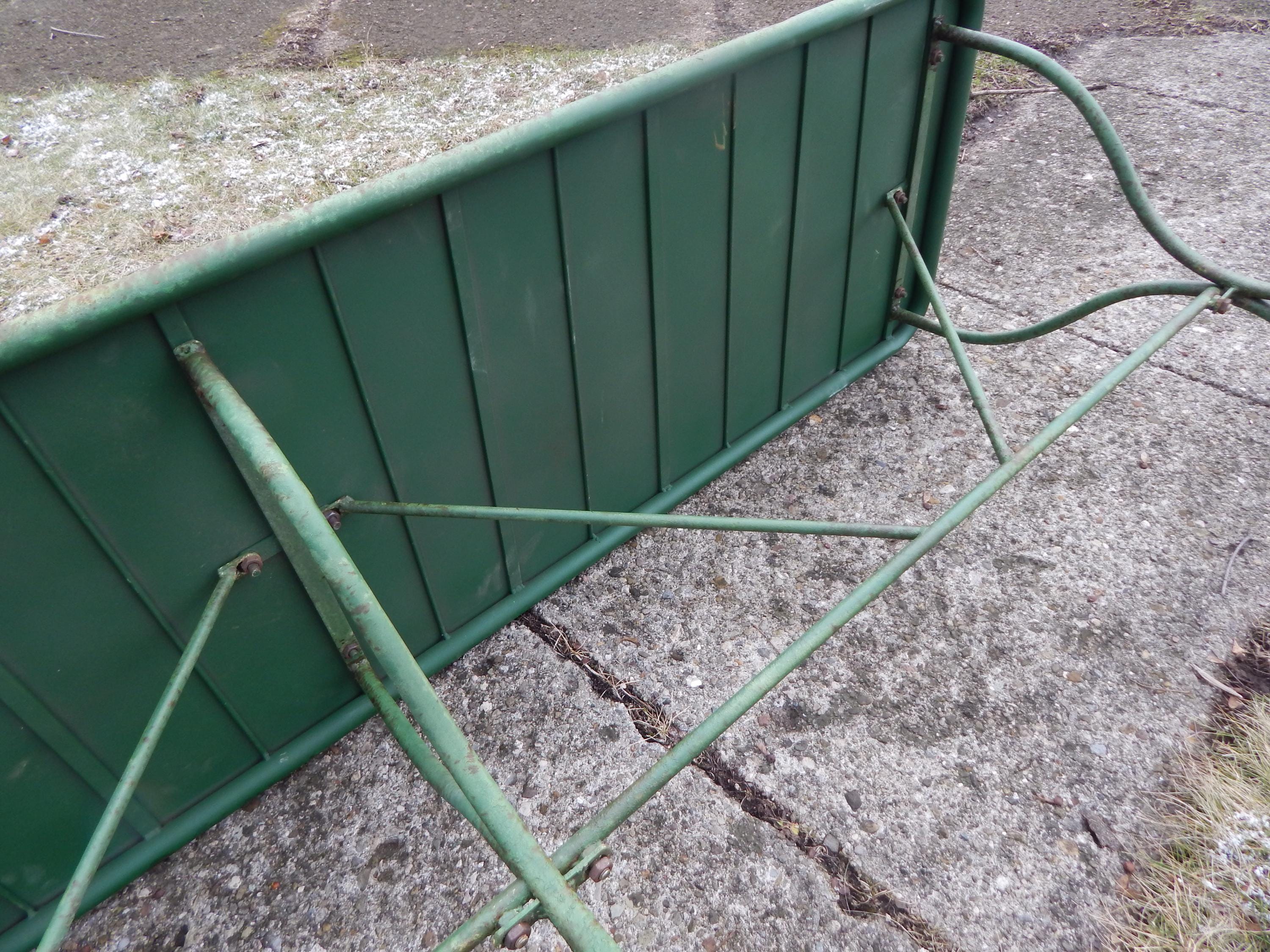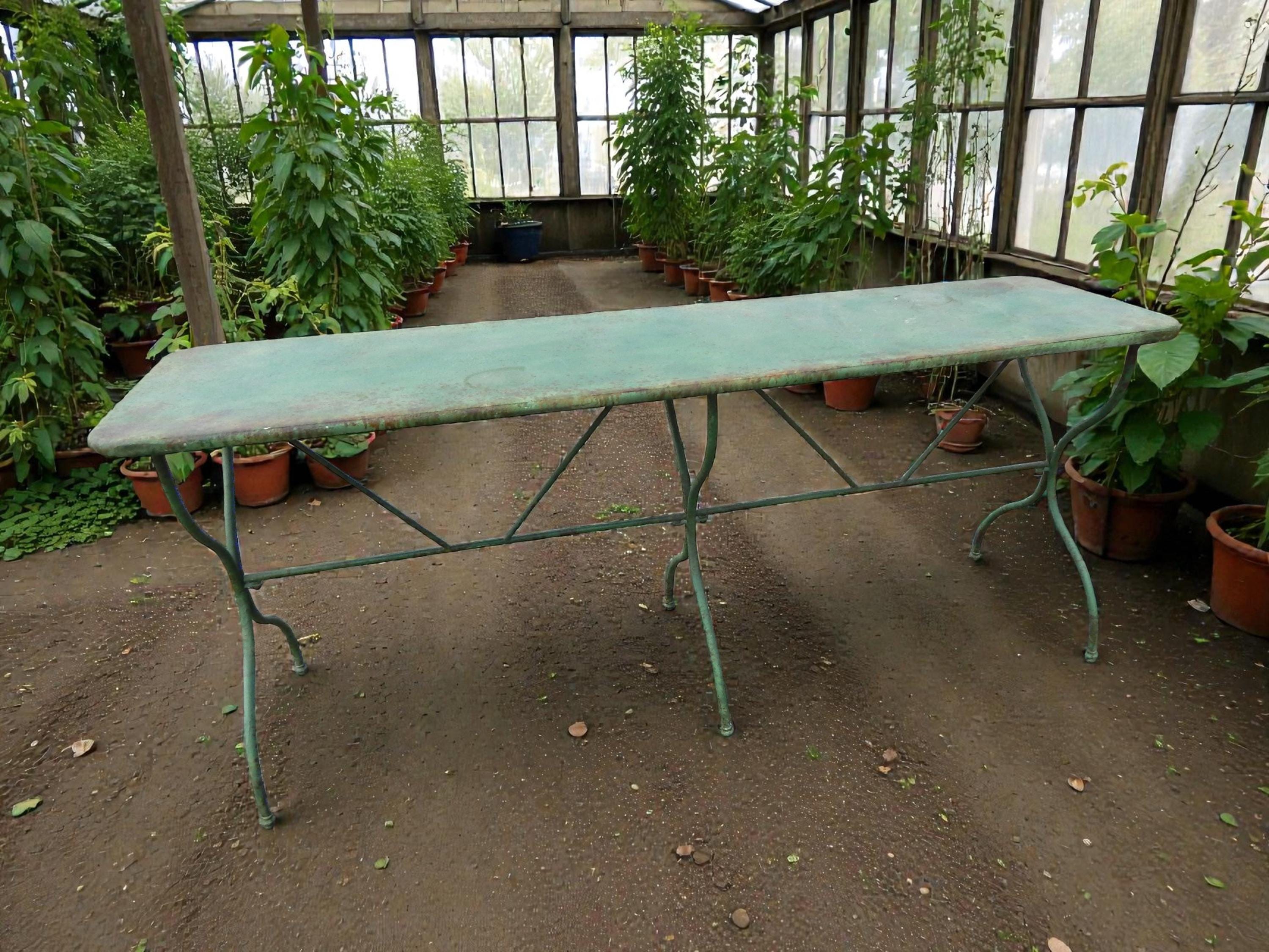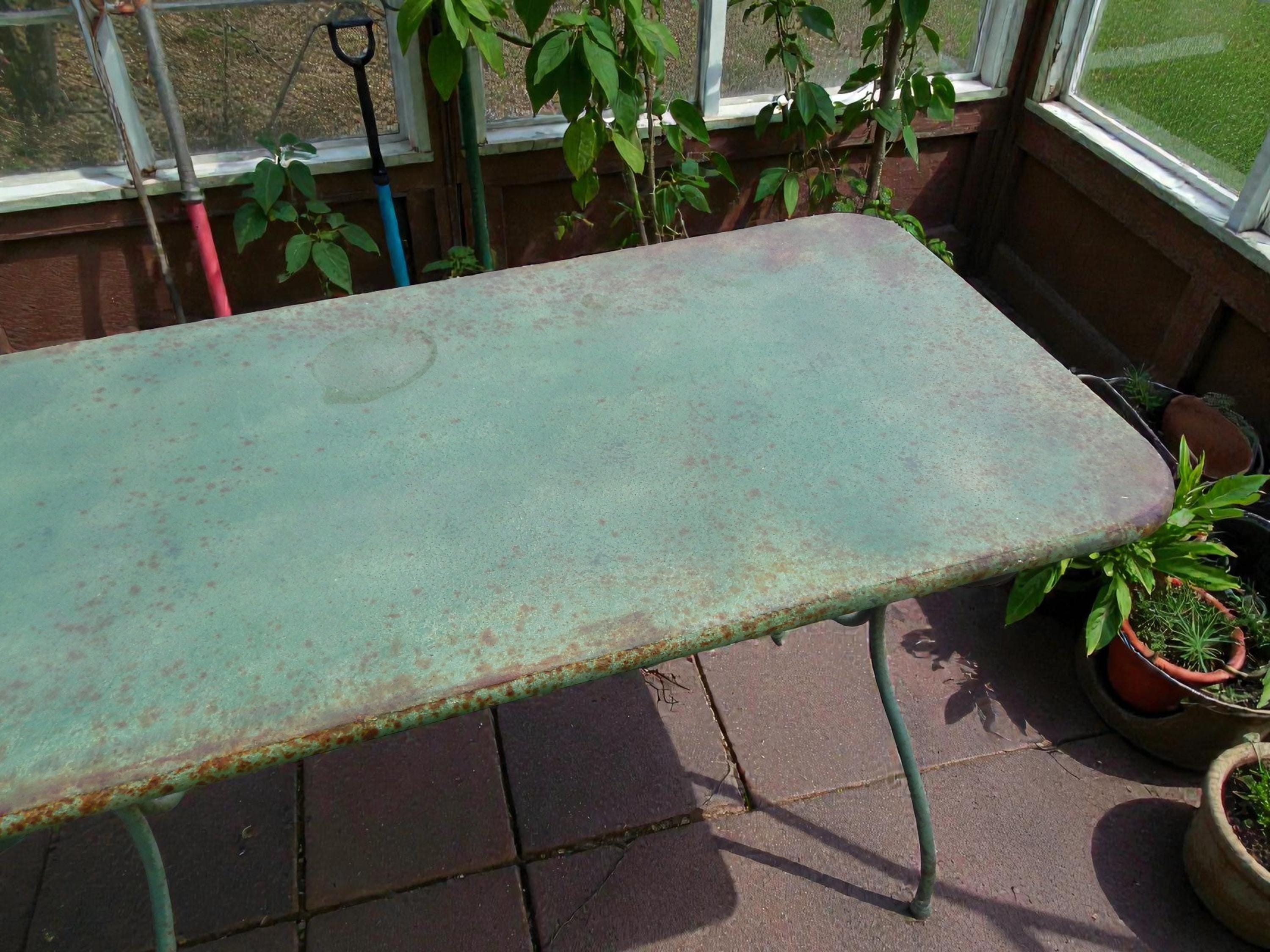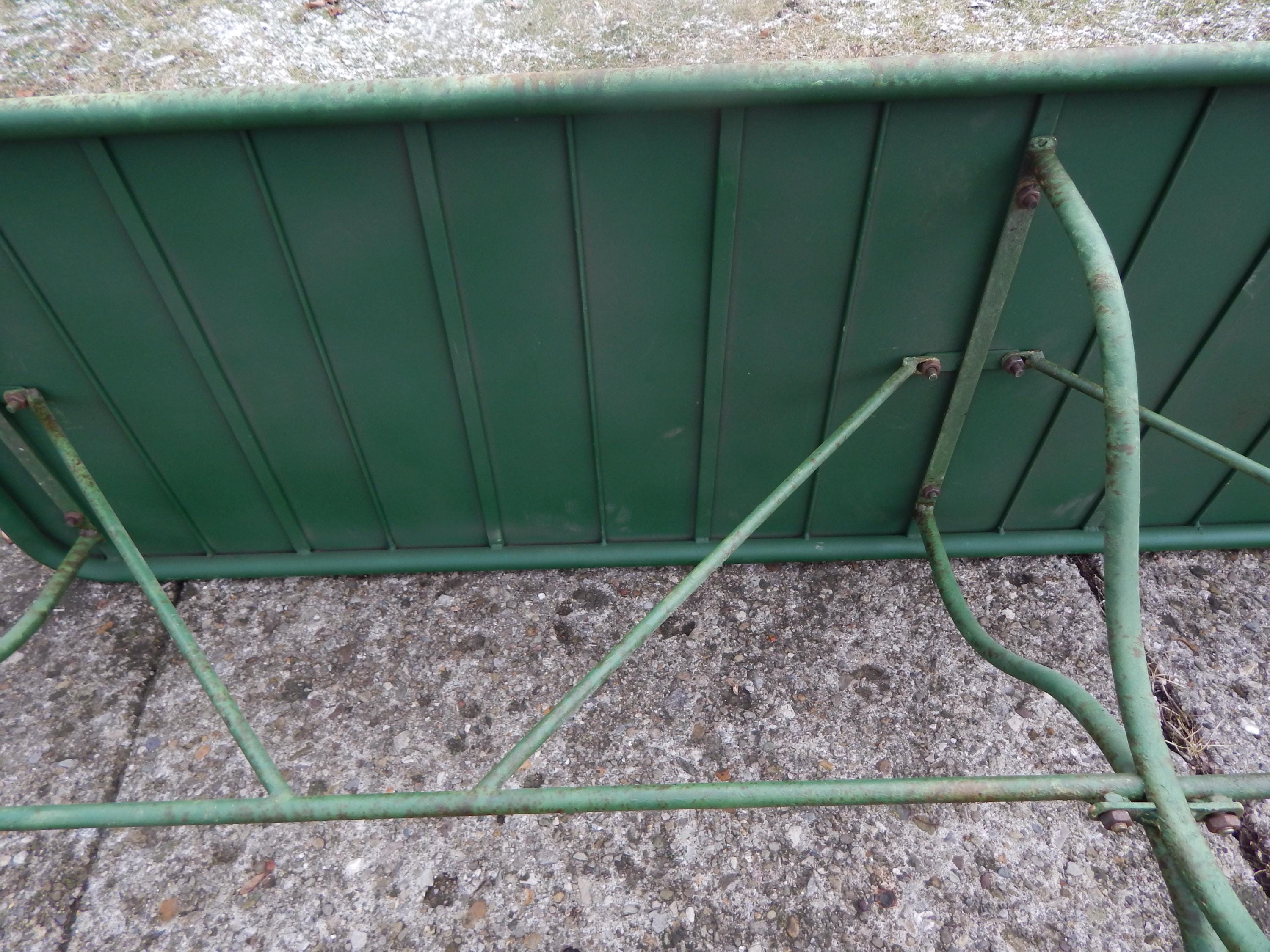 We have to admit being unable to date this to a specific decade. Construction and materials are certainly multi-generational. 1950's? 70's? Newer? In any case a fantastically patina'd French style steel bistro table. No splits, cracks, or dents. No missing pieces. Hardware nice and snug, with no wobbling. Steel top and steel heavy rod legs. Measures 72L x 20D x 29H.