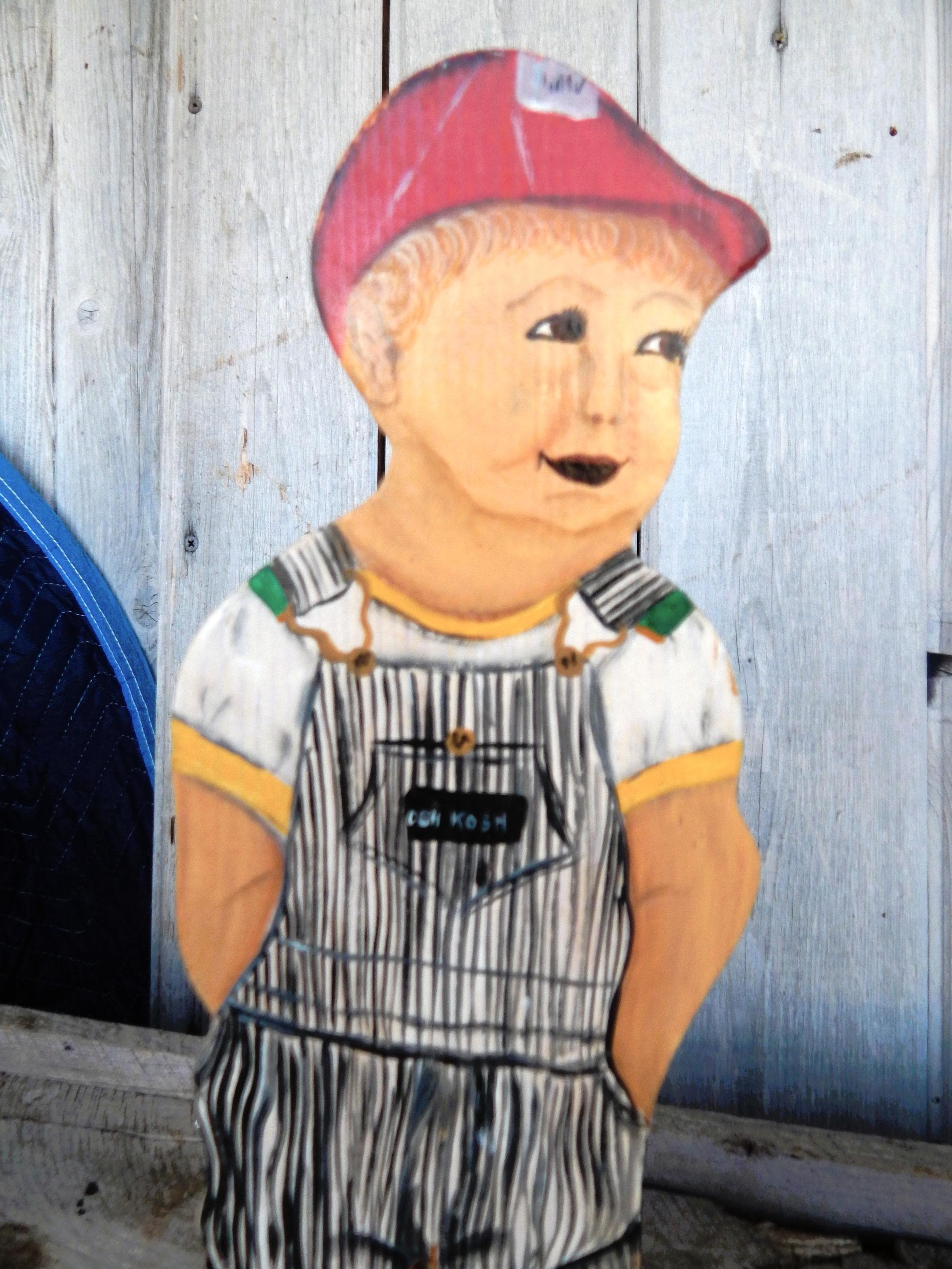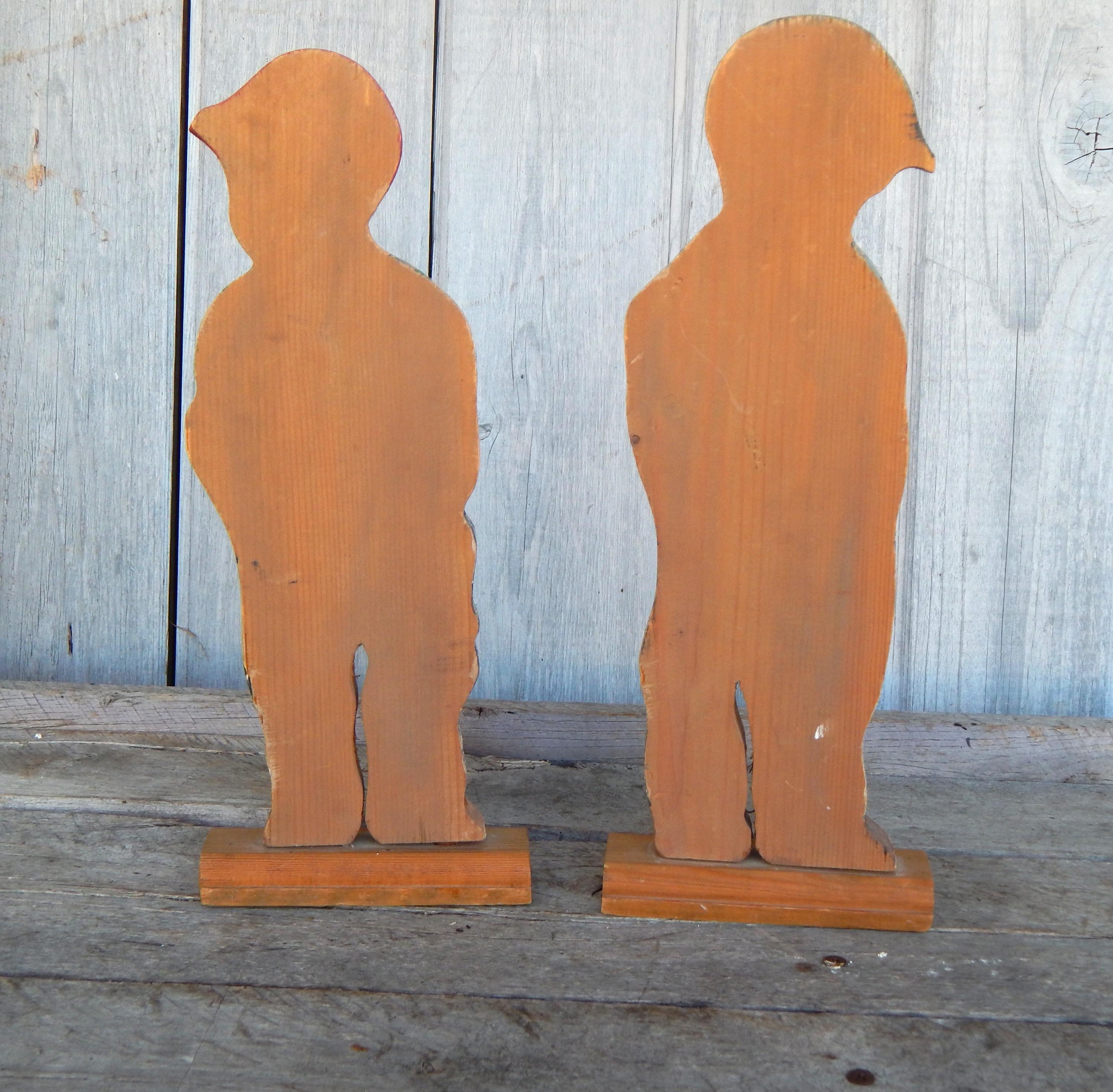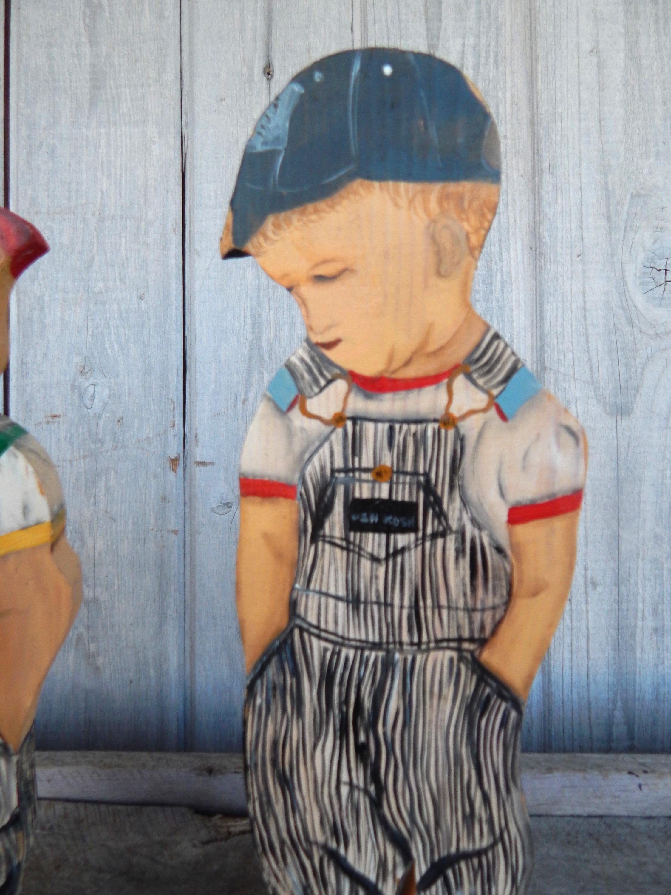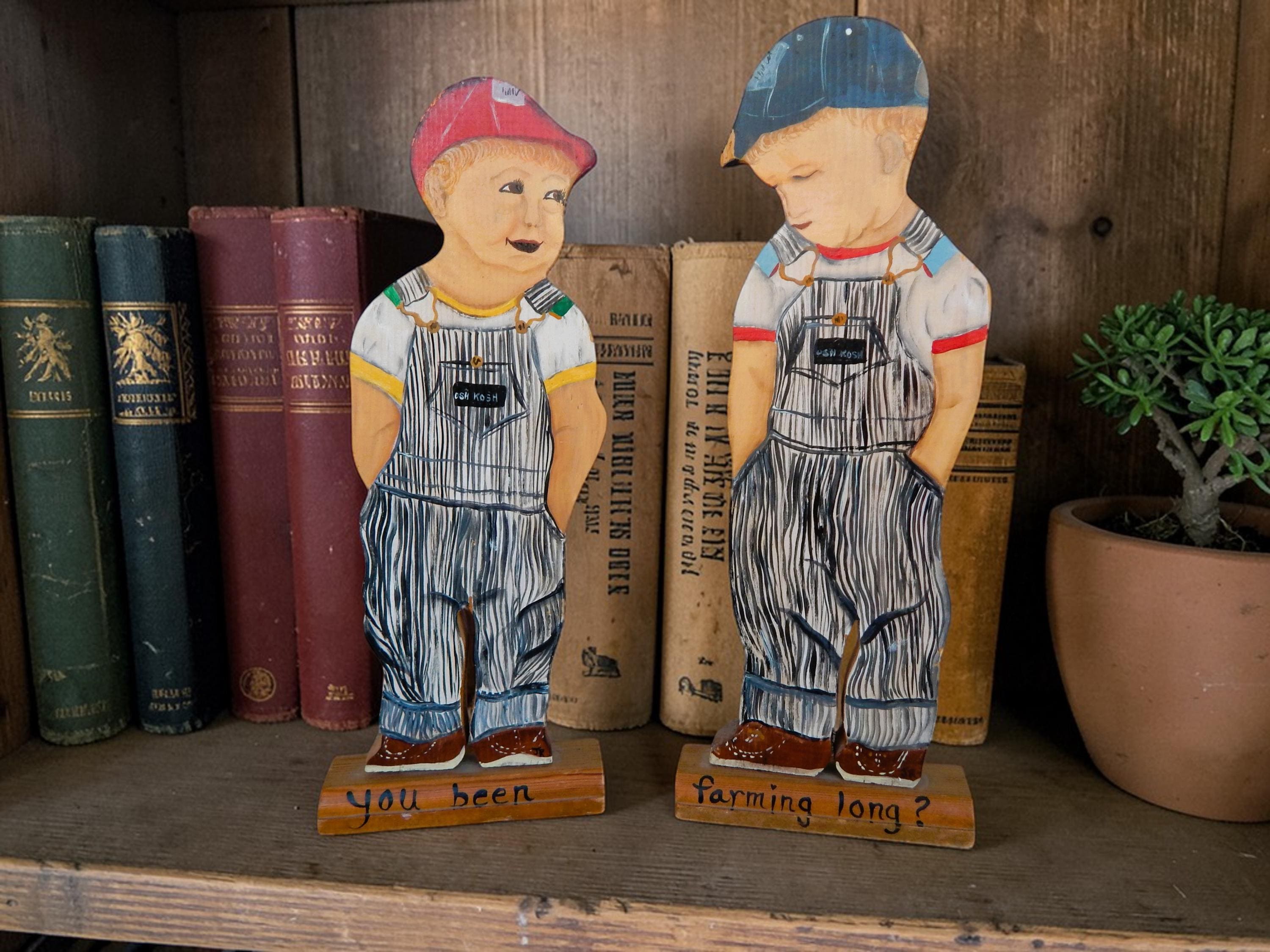 Fun find in the attic of an old house in northeastern Ohio. Mid 20th century promotional advertising hand painted wood cutouts for OshKosh B'Gosh children's clothing. "You been farming long", hand painted on bases. Each stands 12.5" high. Hand painted and initialed by the artist. Note chip in one boy's cap. Otherwise, zero issues. Measurements are 12.5H x 1"D.