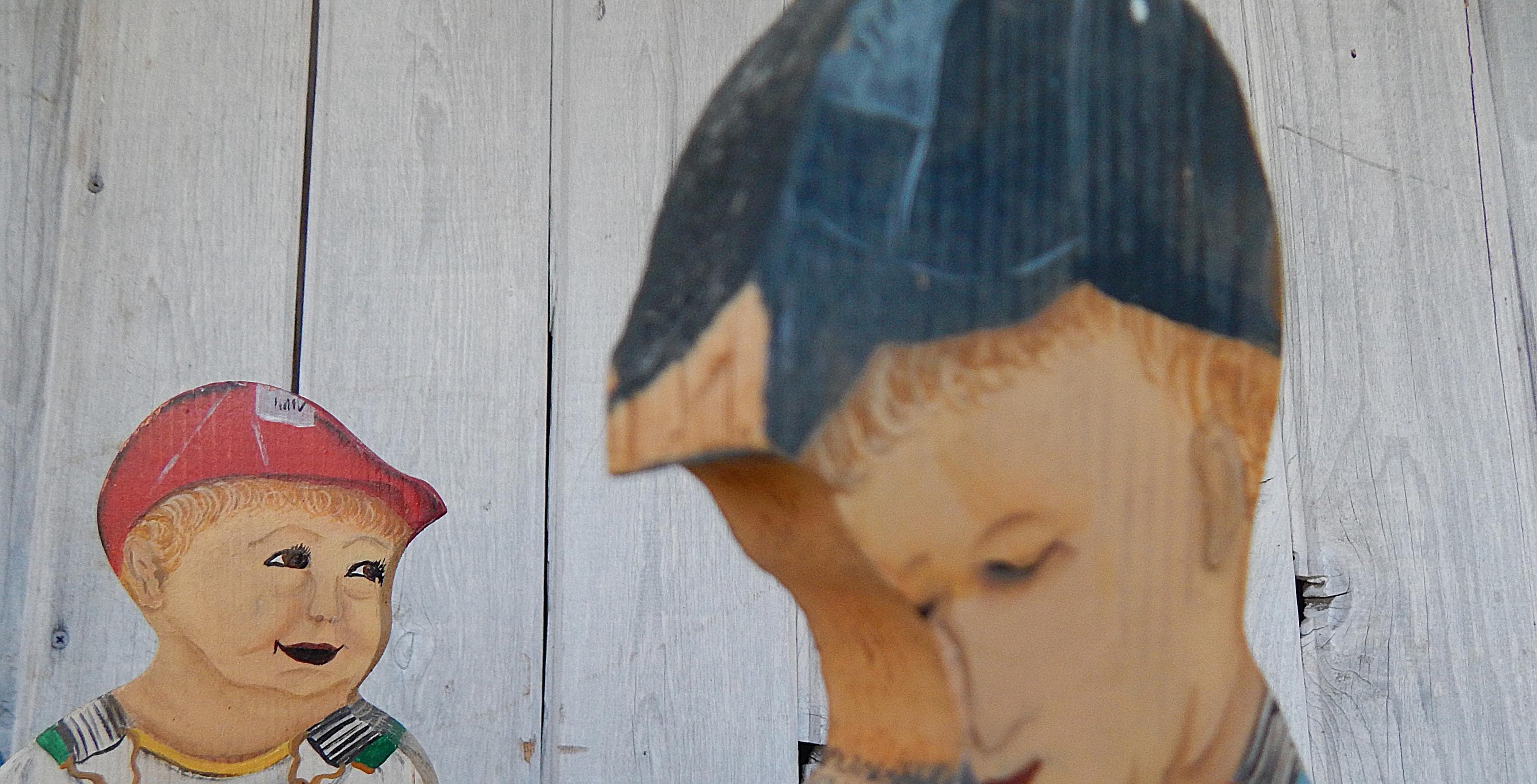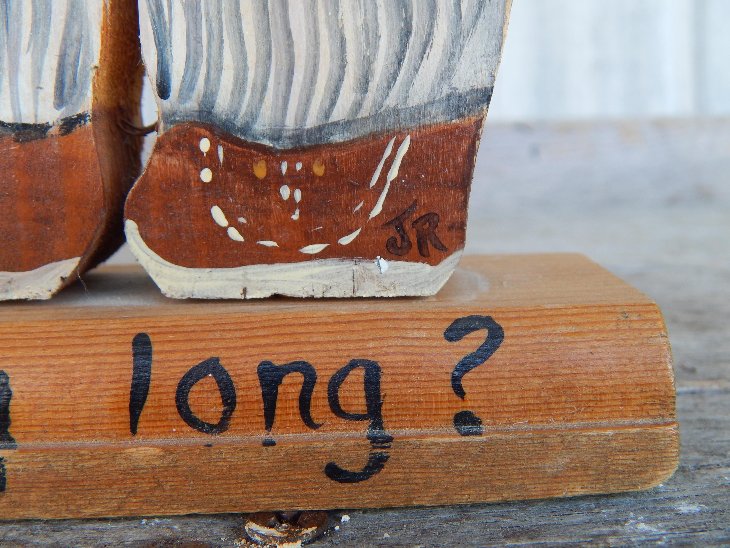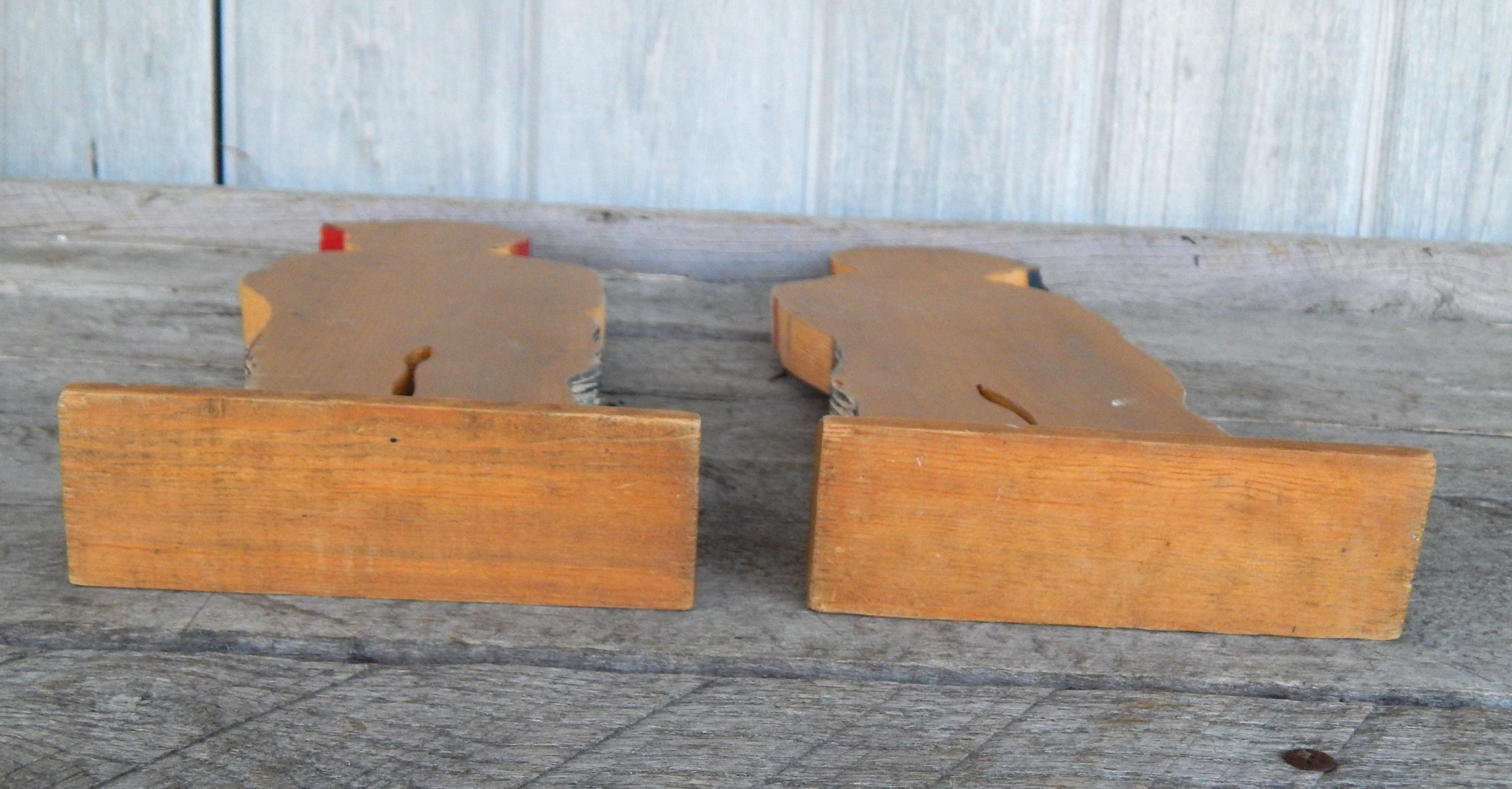 Fun find in the attic of an old house in northeastern Ohio. Mid 20th century promotional advertising hand painted wood cutouts for OshKosh B'Gosh children's clothing. "You been farming long", hand painted on bases. Each stands 12.5" high. Hand painted and initialed by the artist. Note chip in one boy's cap. Otherwise, zero issues. Measurements are 12.5H x 1"D.
