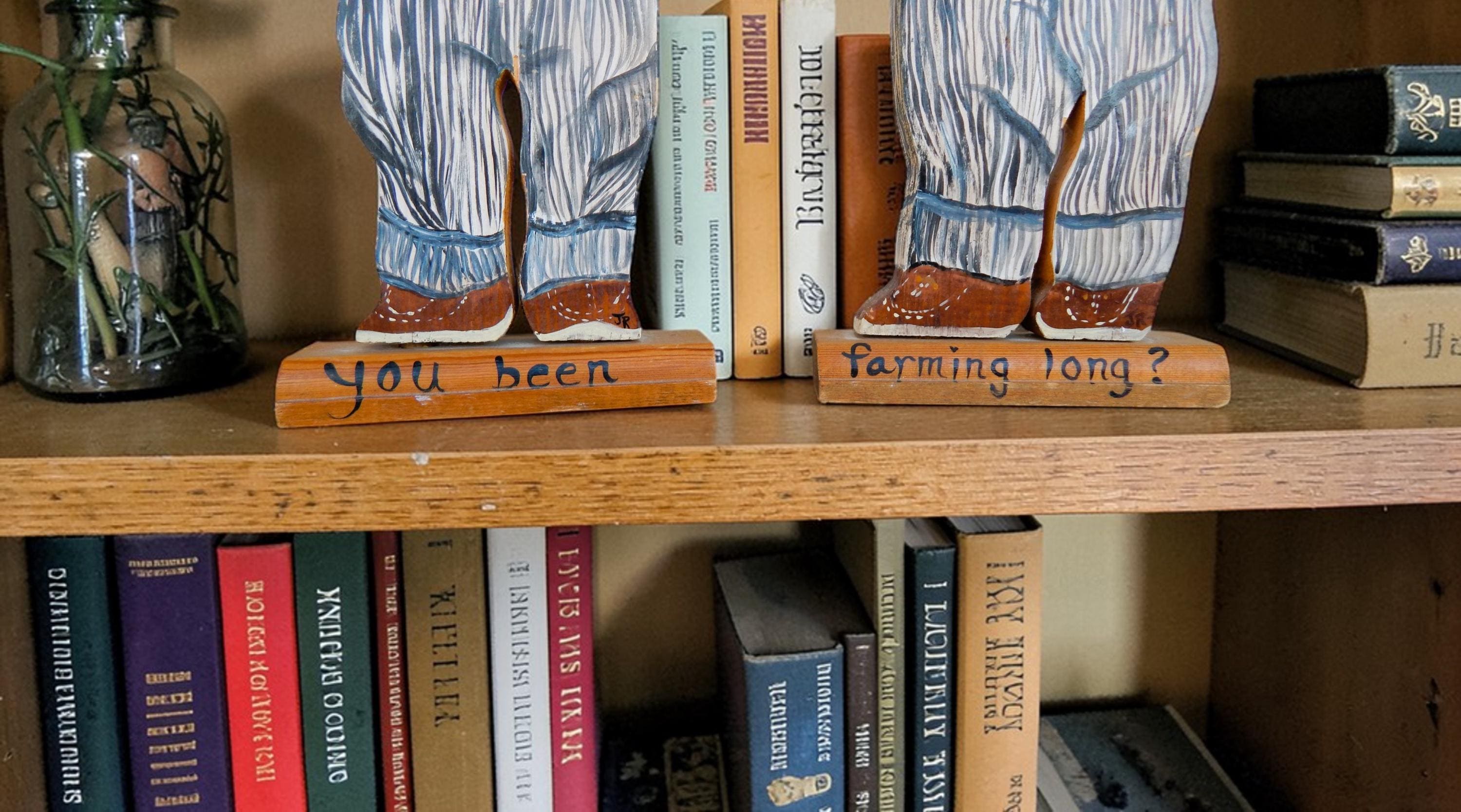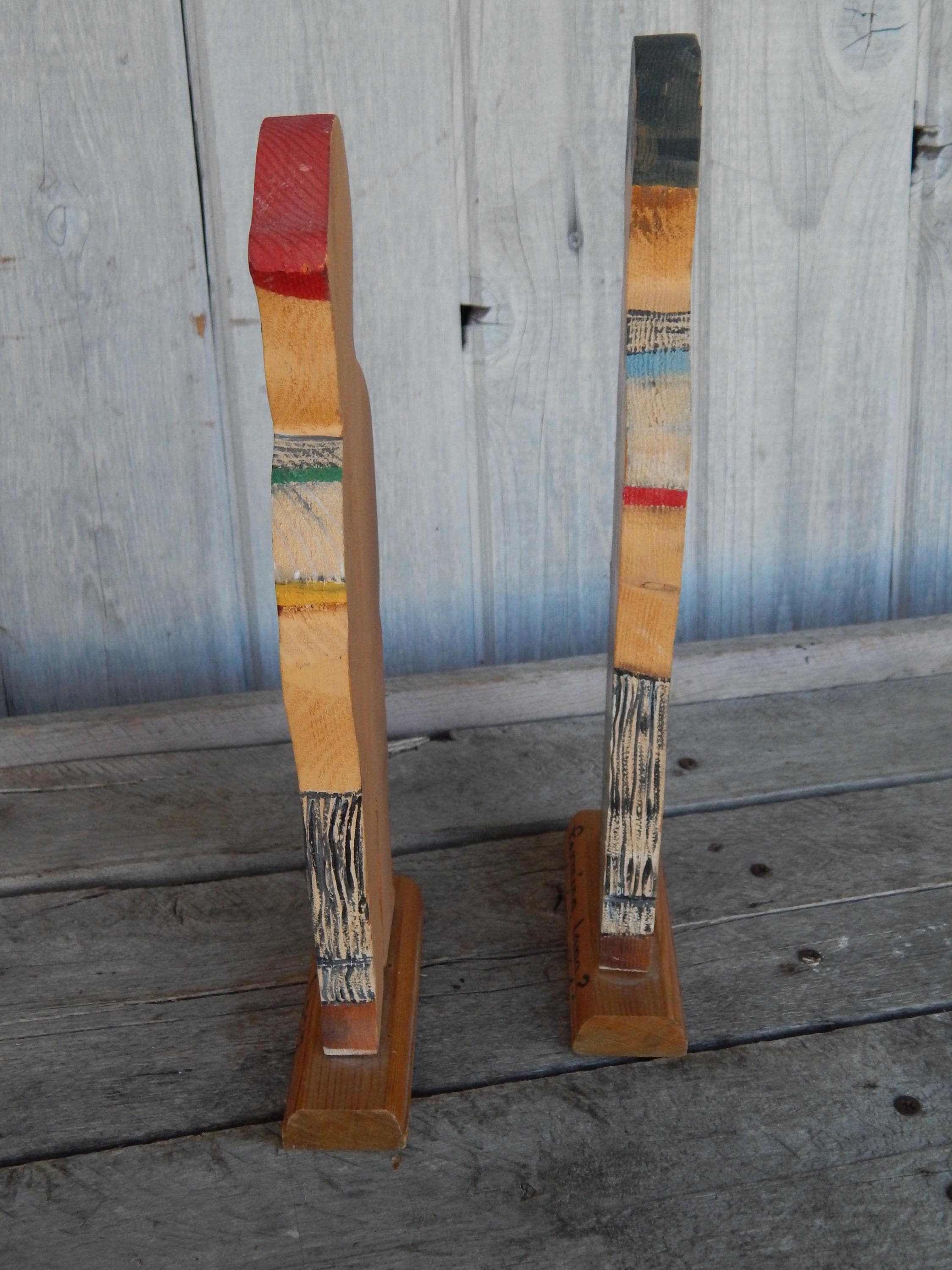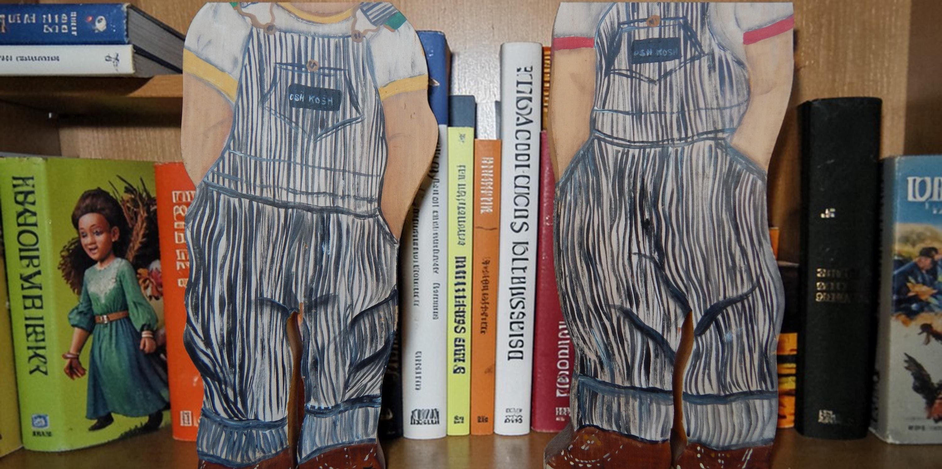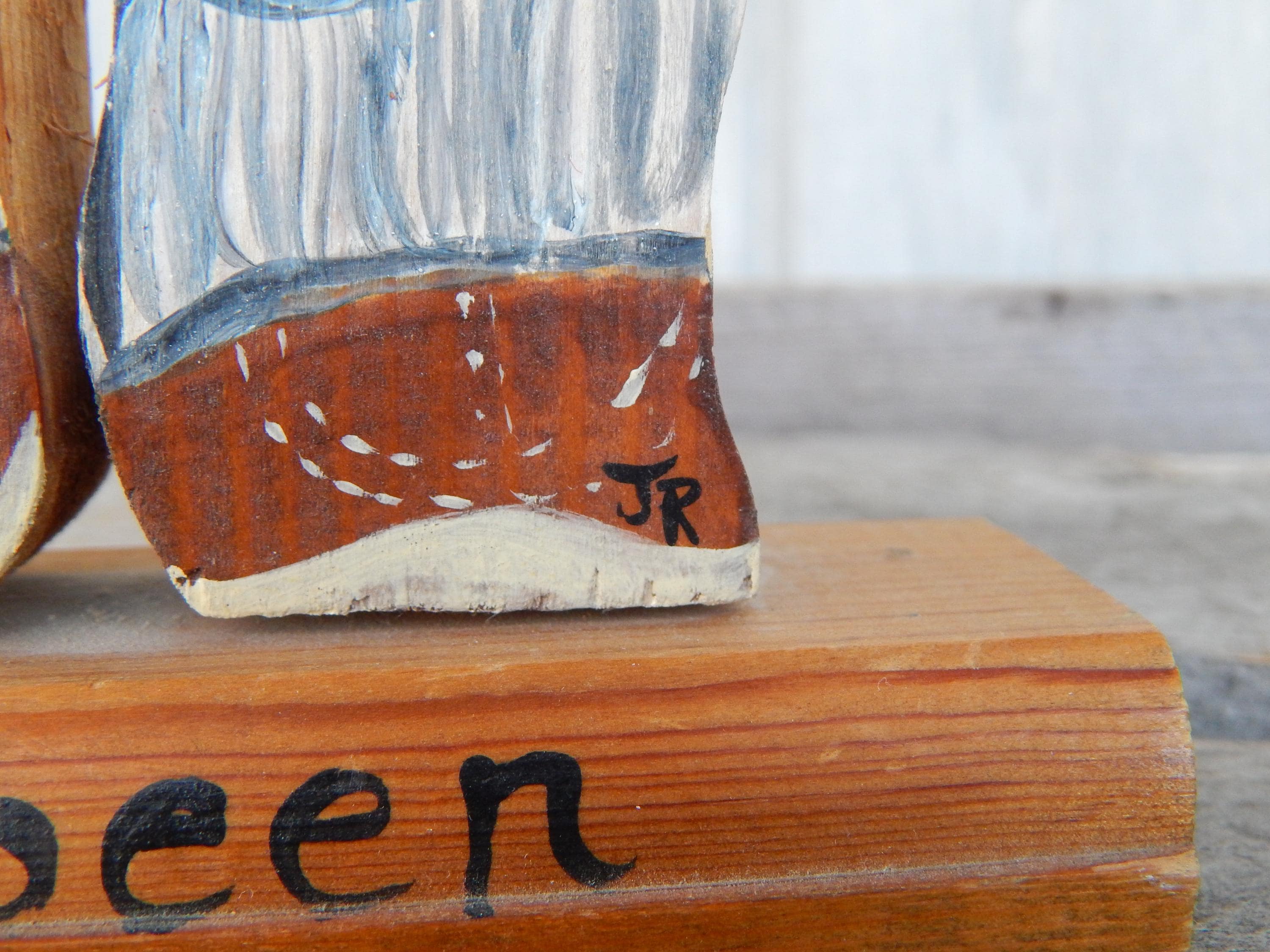 Fun find in the attic of an old house in northeastern Ohio. Mid 20th century promotional advertising hand painted wood cutouts for OshKosh B'Gosh children's clothing. "You been farming long", hand painted on bases. Each stands 12.5" high. Hand painted and initialed by the artist. Note chip in one boy's cap. Otherwise, zero issues. Measurements are 12.5H x 1"D.