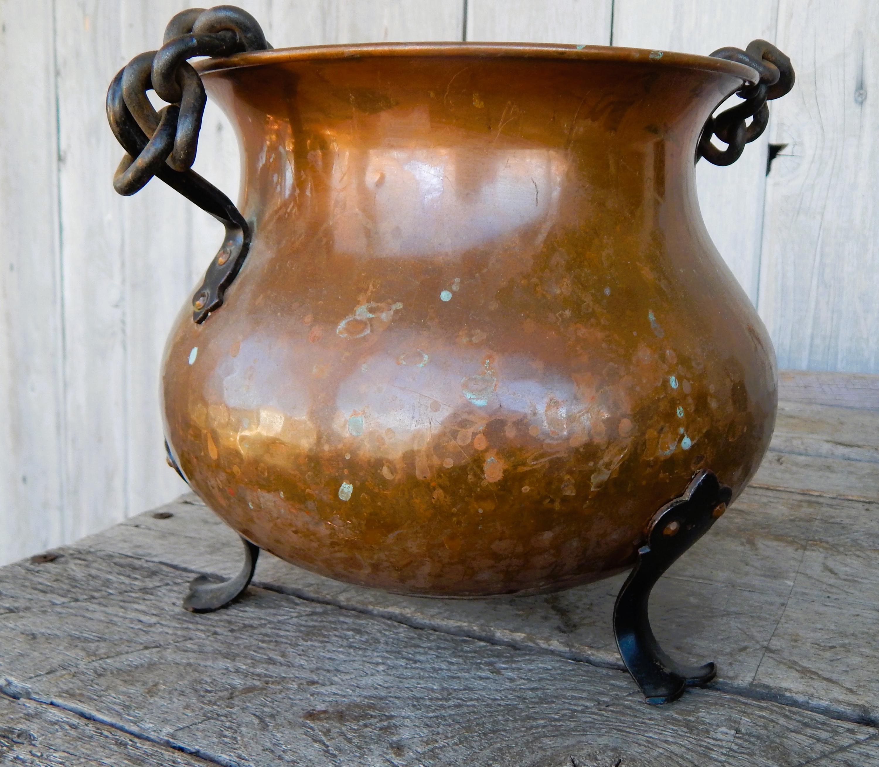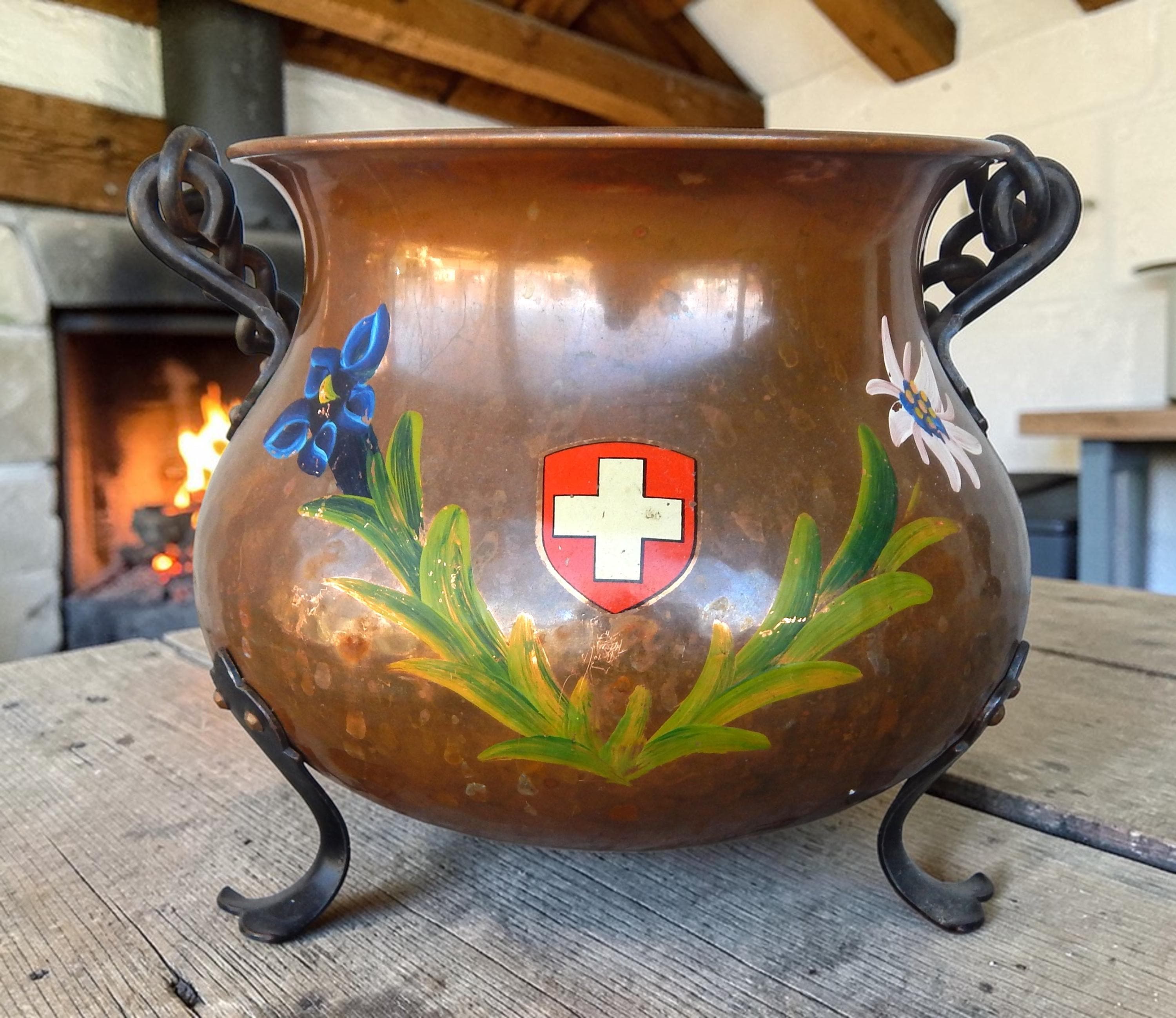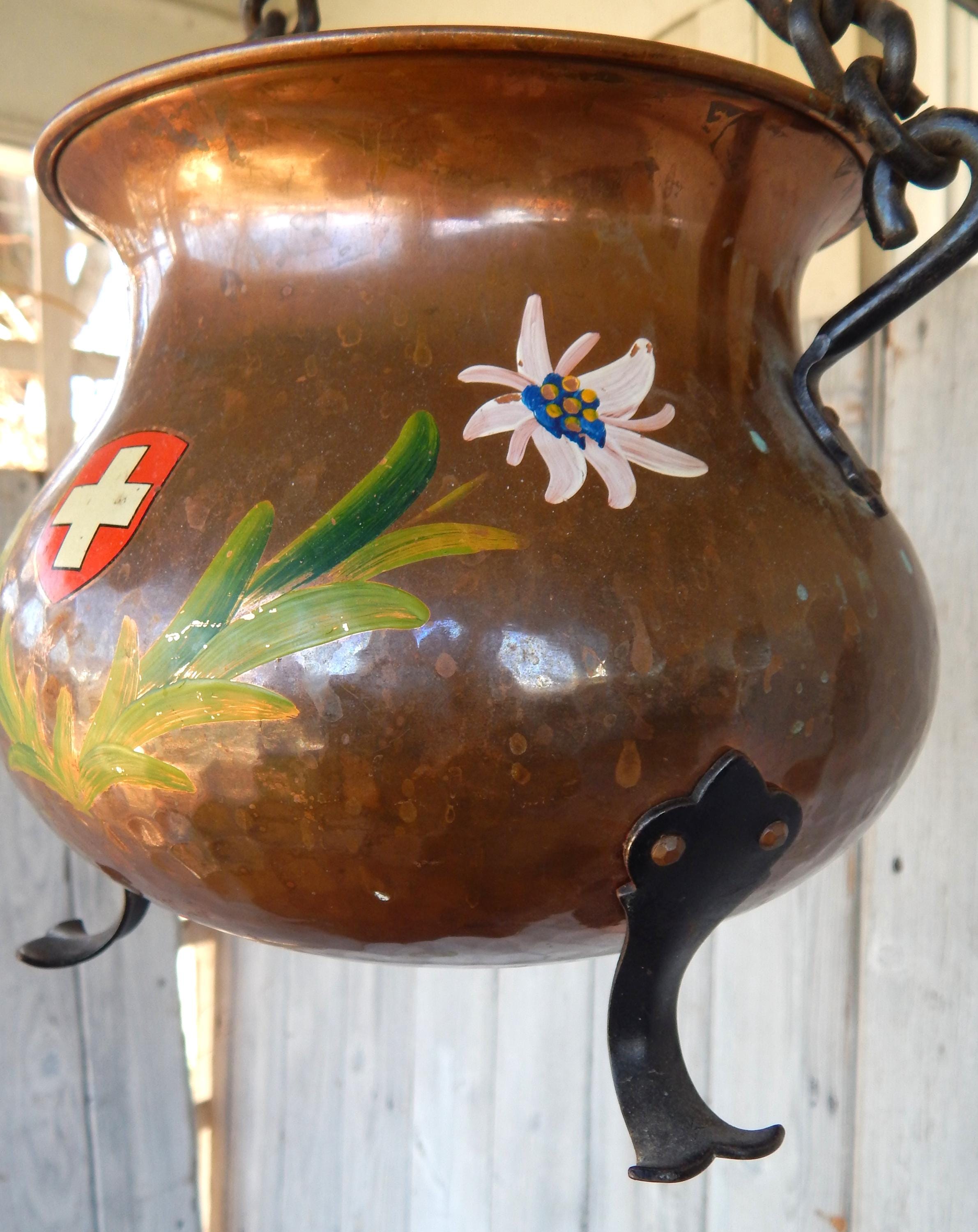 Really pretty cute. Mid 20th Century Swiss Hand Painted Hammered Hanging Footed Copper Pot. Likely from the 1950's - 1960's. Excellent condition with some minor tarnish as shown. (We always leave things as we find them). No splits or cracks. Paint is clear and bold. Measures approx. 10" at its widest.