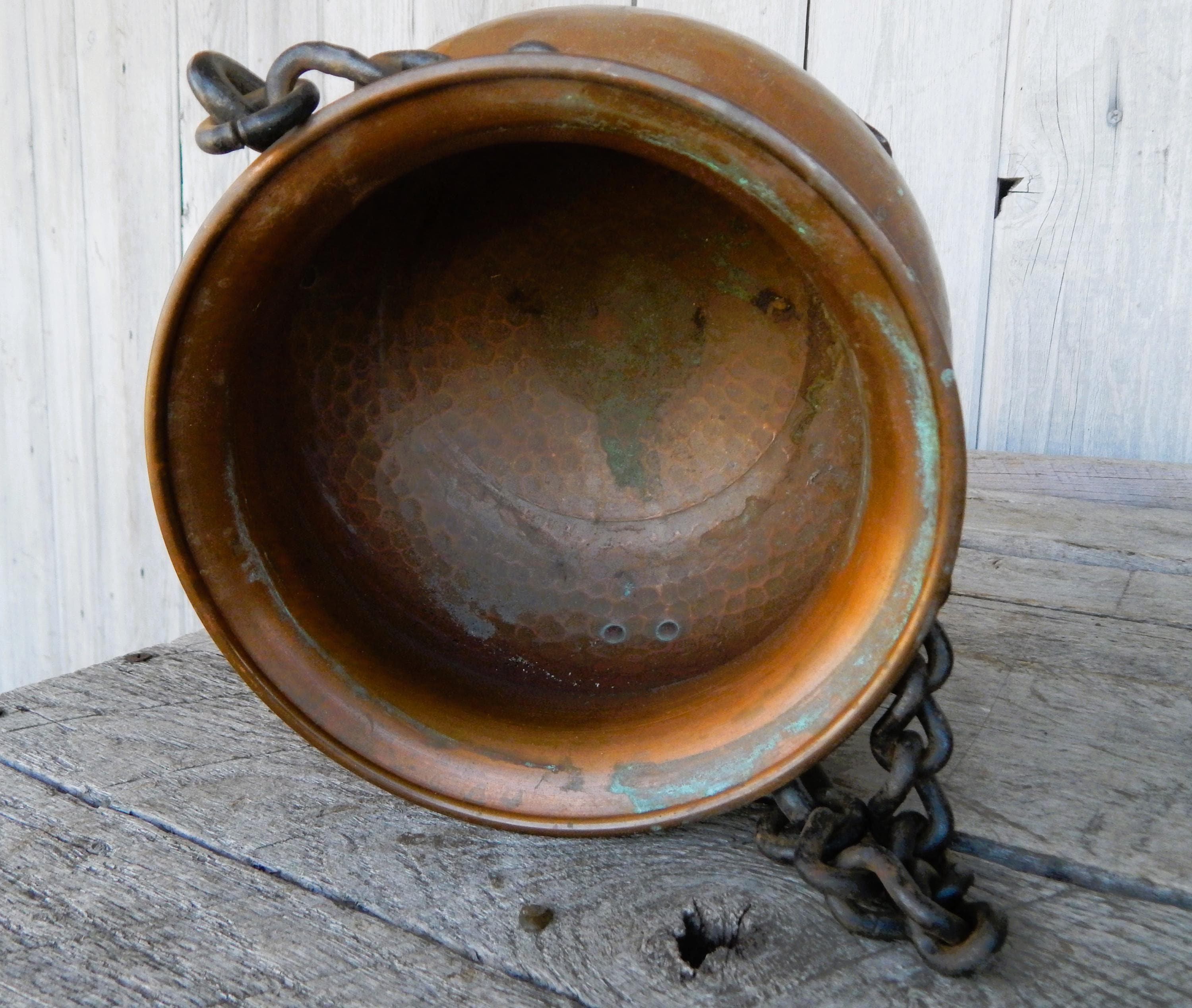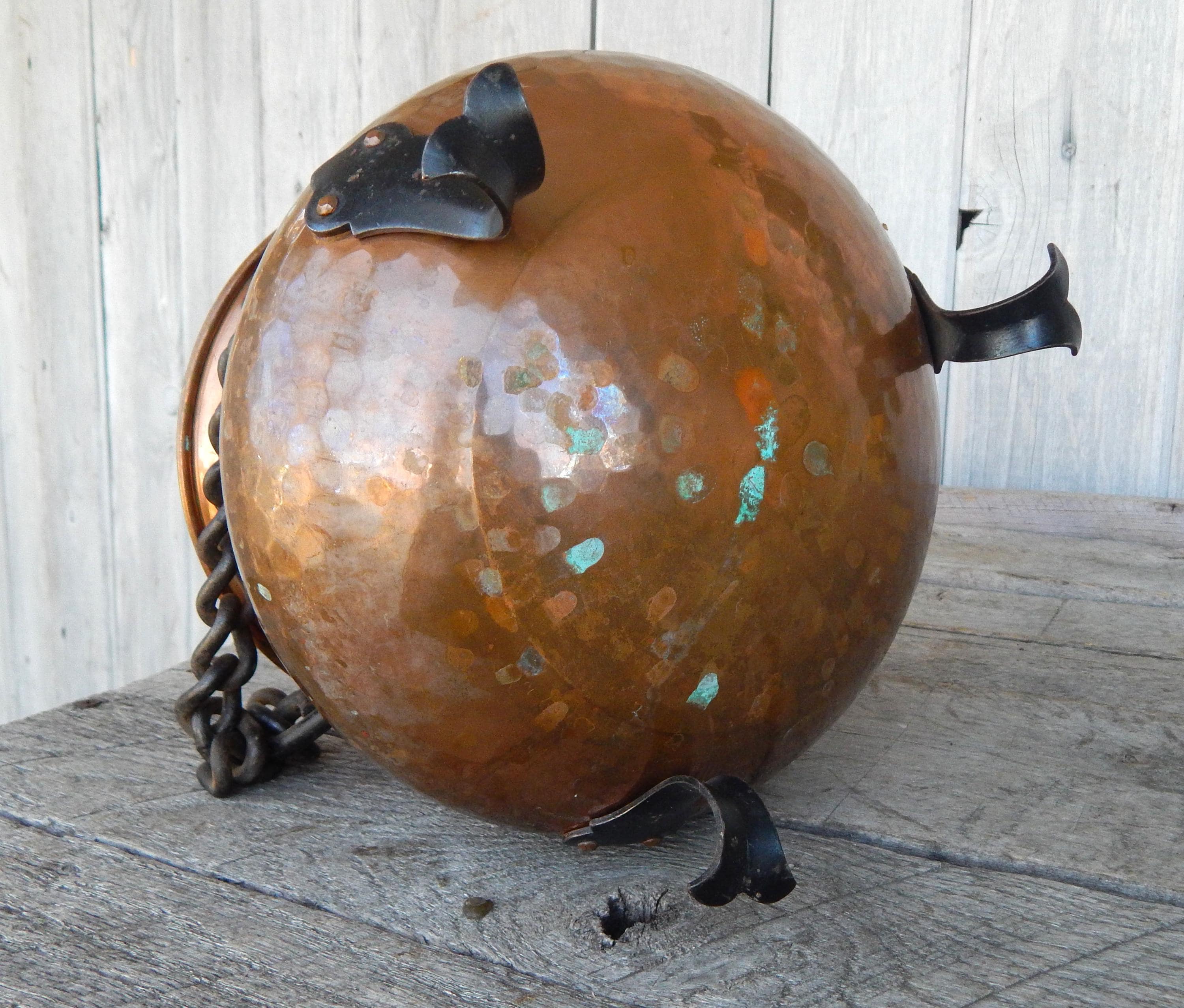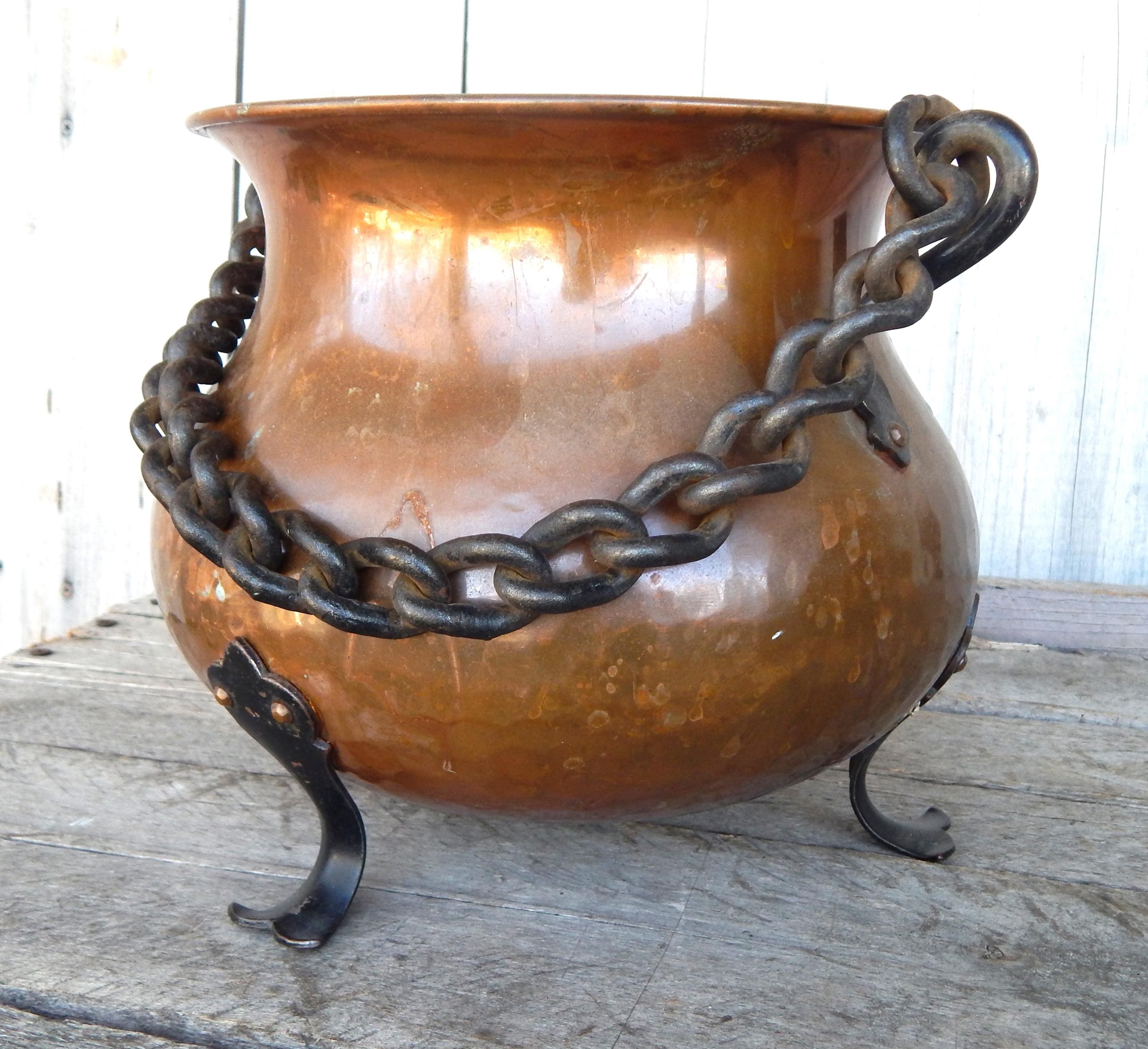 Really pretty cute. Mid 20th Century Swiss Hand Painted Hammered Hanging Footed Copper Pot. Likely from the 1950's - 1960's. Excellent condition with some minor tarnish as shown. (We always leave things as we find them). No splits or cracks. Paint is clear and bold. Measures approx. 10" at its widest.