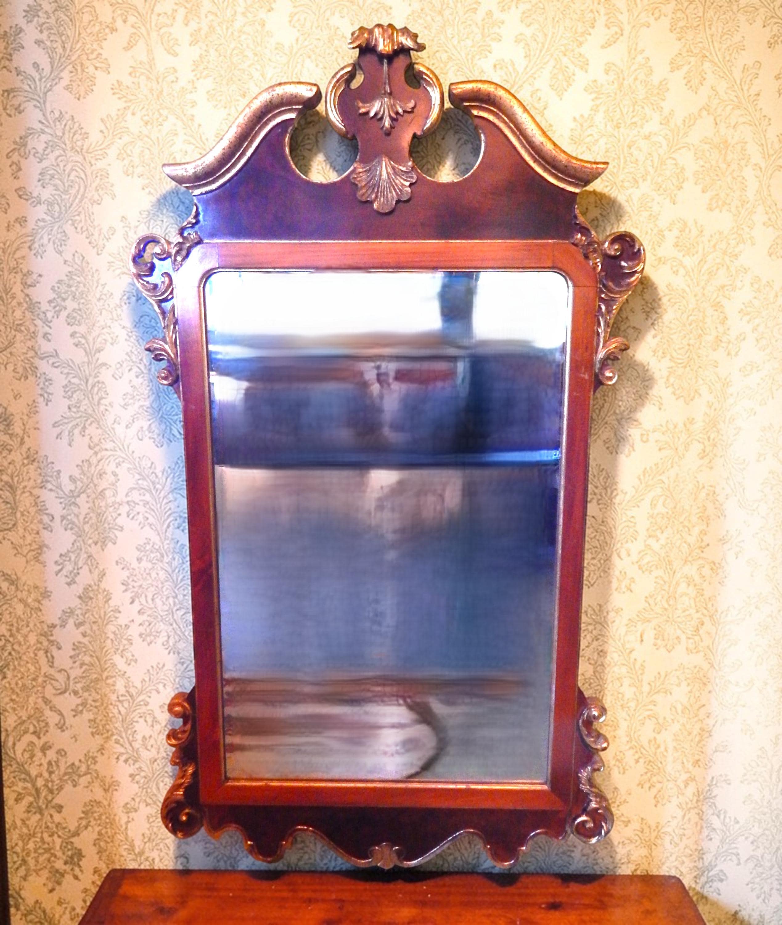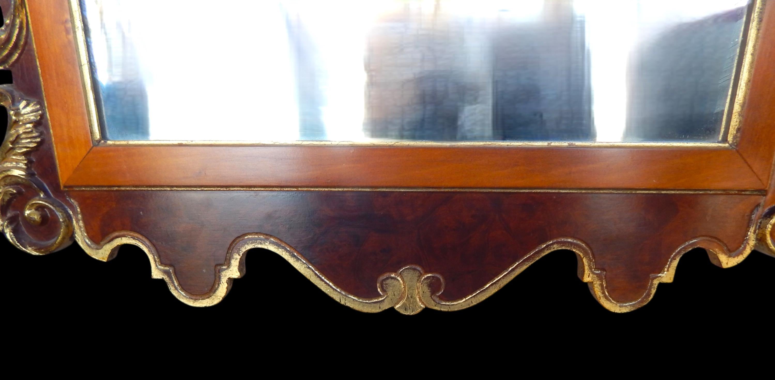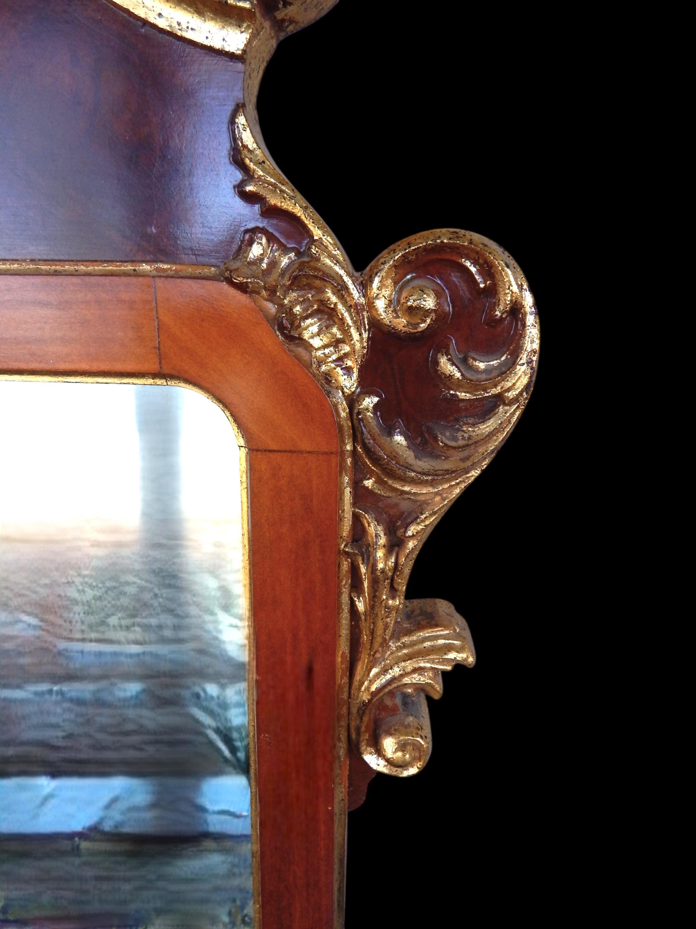 Elegant 4ft gilt mahogany scrollwork mirror. In very good condition. Gilding a little bit thin in places (see photos). No splits, cracks, missing pieces, etc. Mirroring is excellent. Dates to the 1960's or 70's. Measures 49" high x 28" wide x 2" deep. Fairly heavy at around 20lbs.