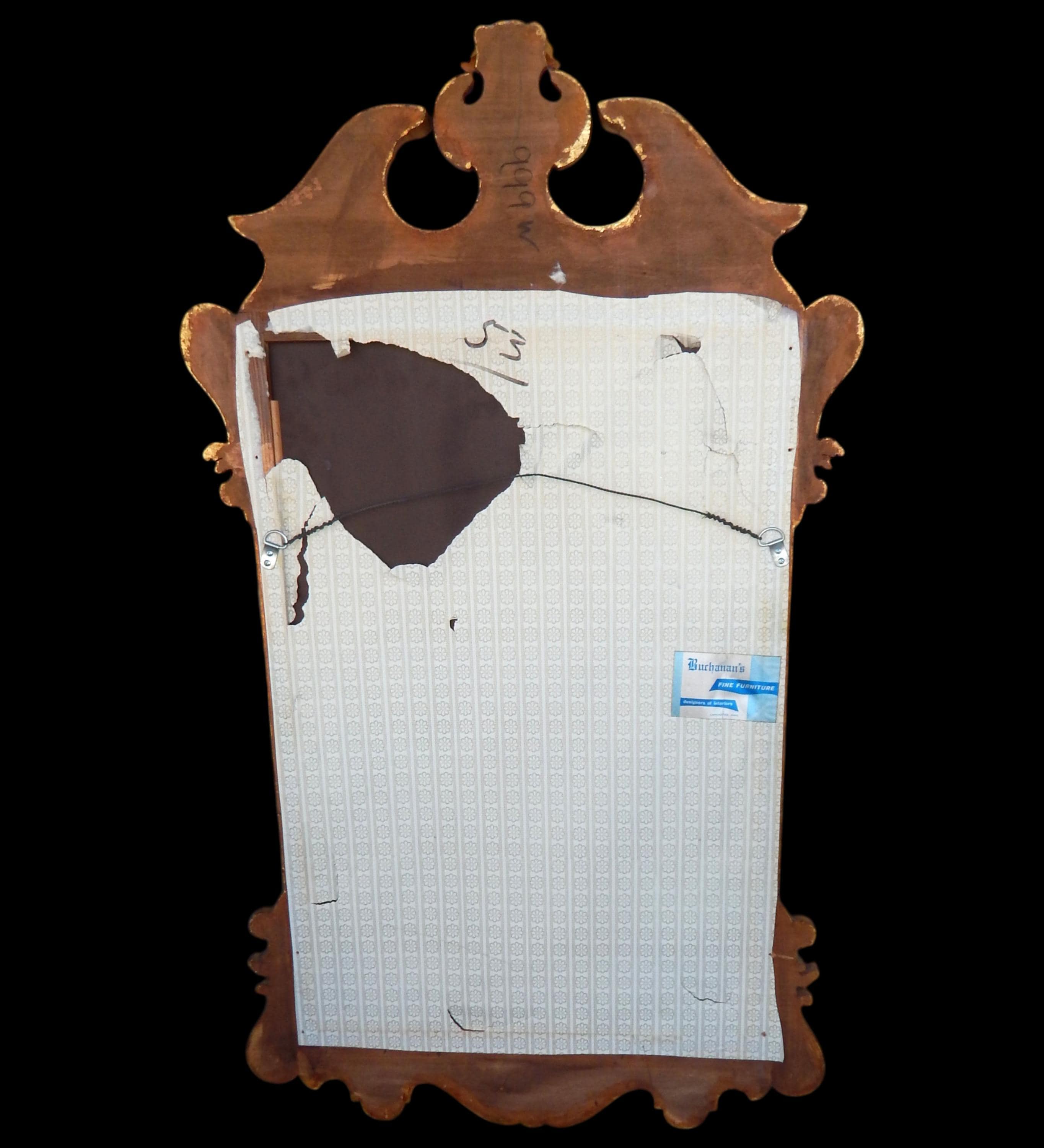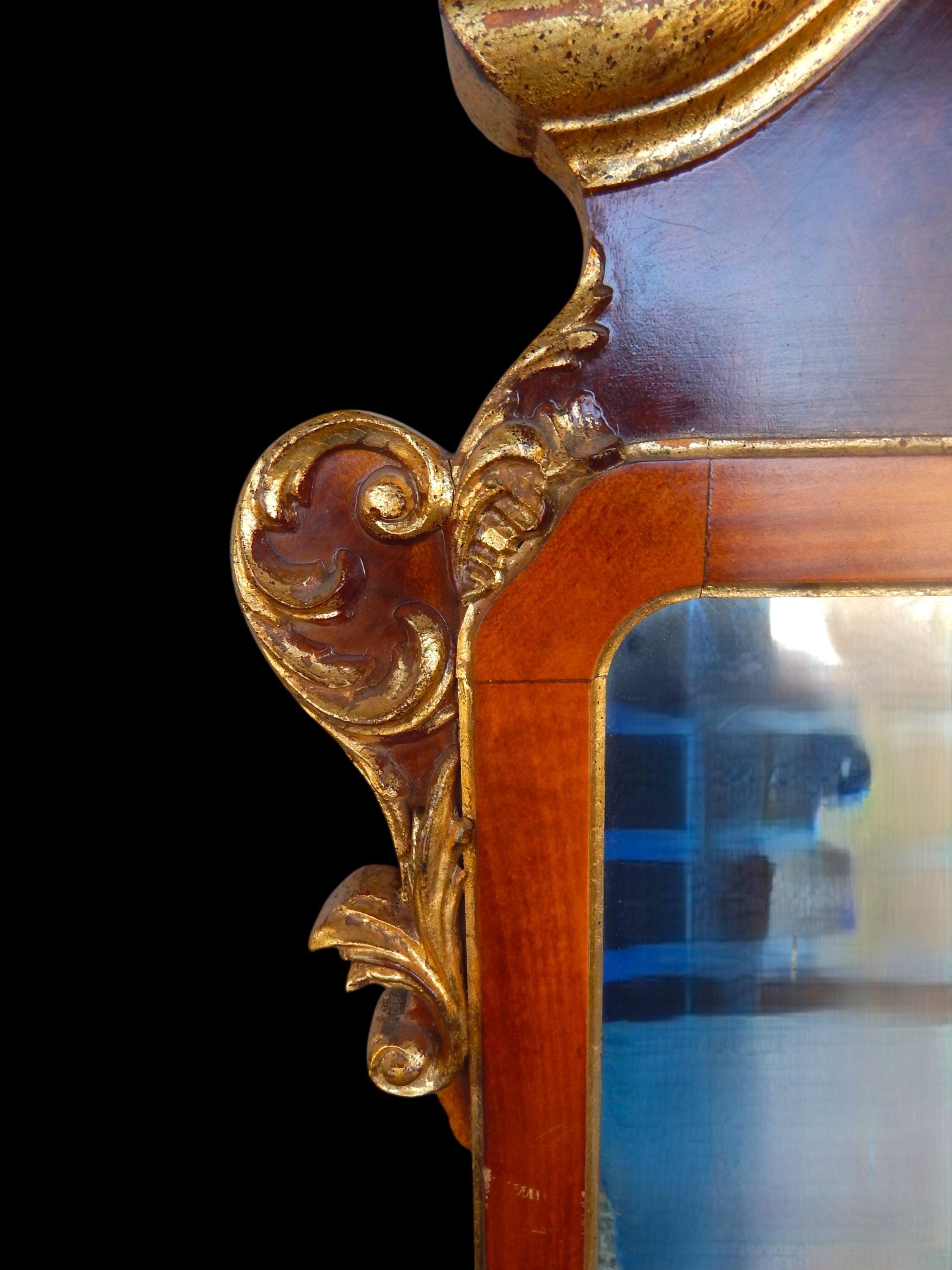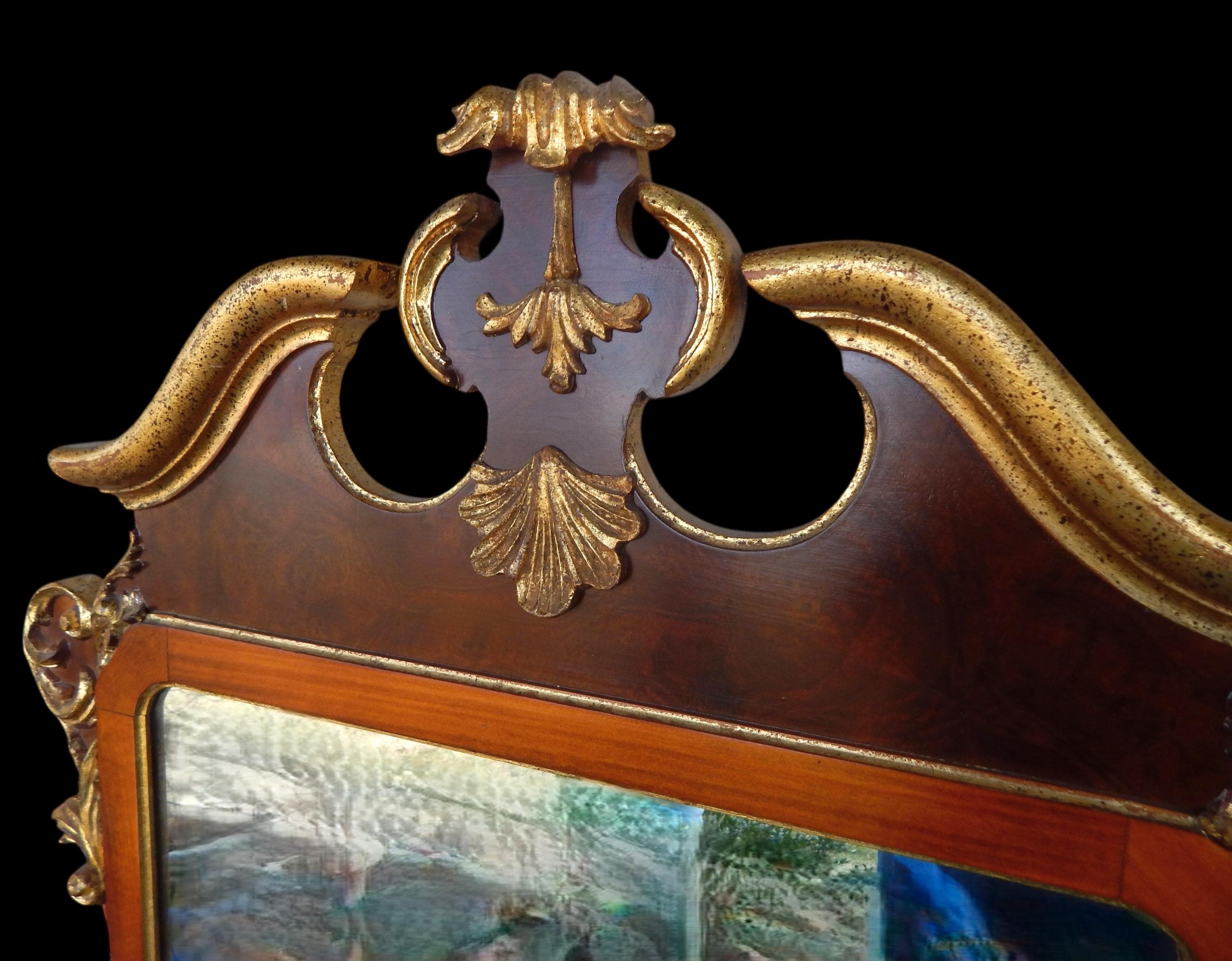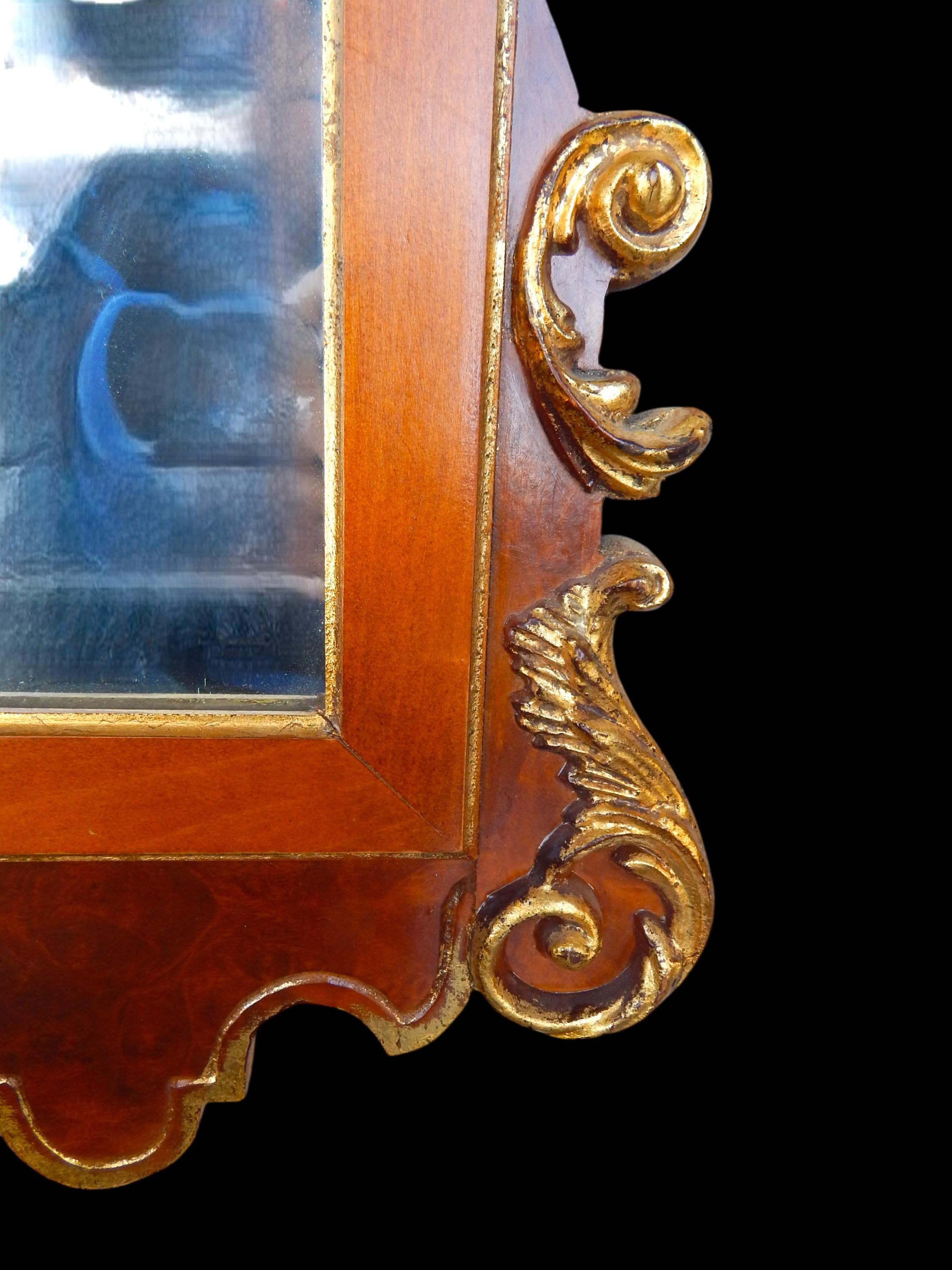 Elegant 4ft gilt mahogany scrollwork mirror. In very good condition. Gilding a little bit thin in places (see photos). No splits, cracks, missing pieces, etc. Mirroring is excellent. Dates to the 1960's or 70's. Measures 49" high x 28" wide x 2" deep. Fairly heavy at around 20lbs.
