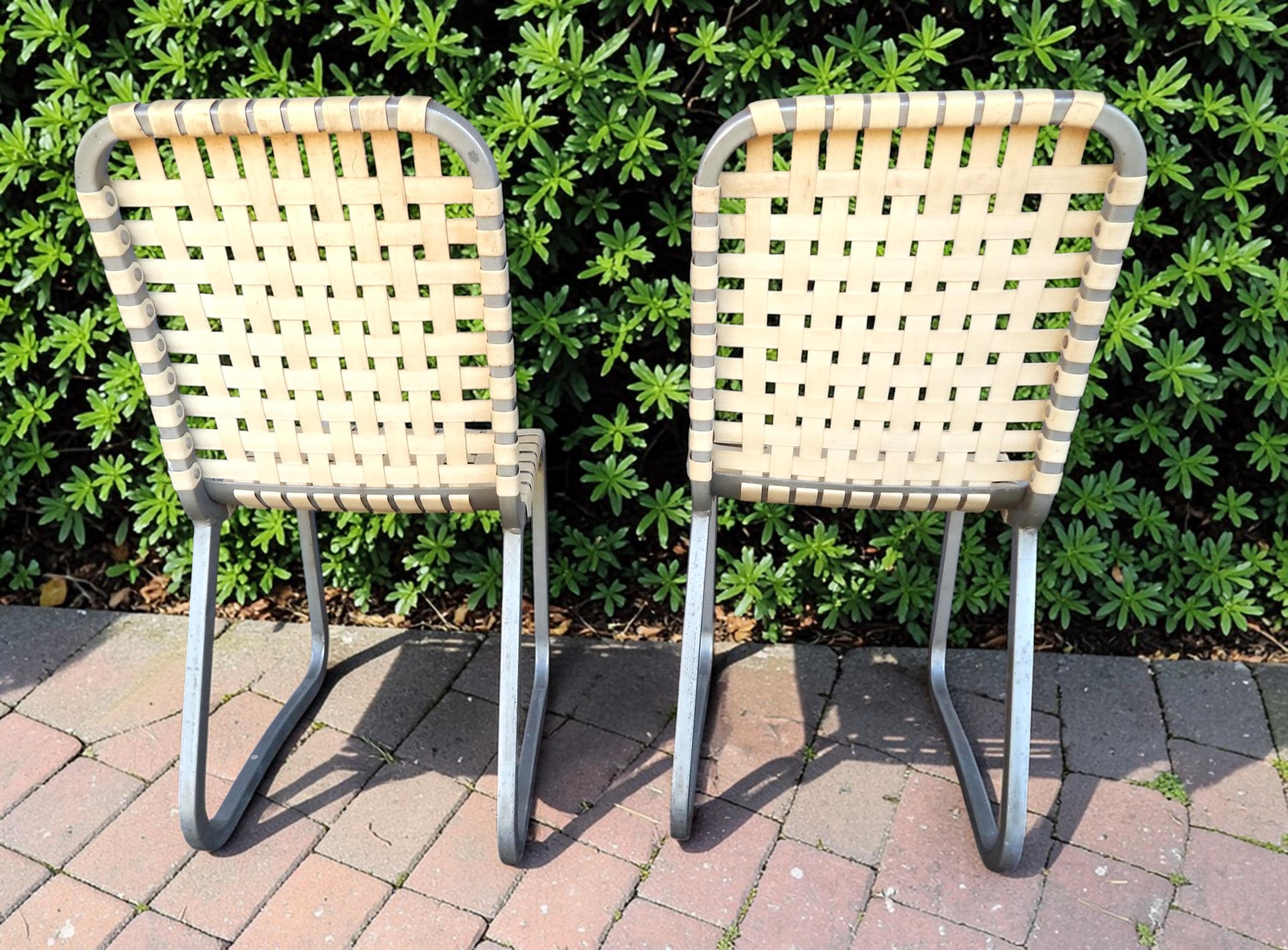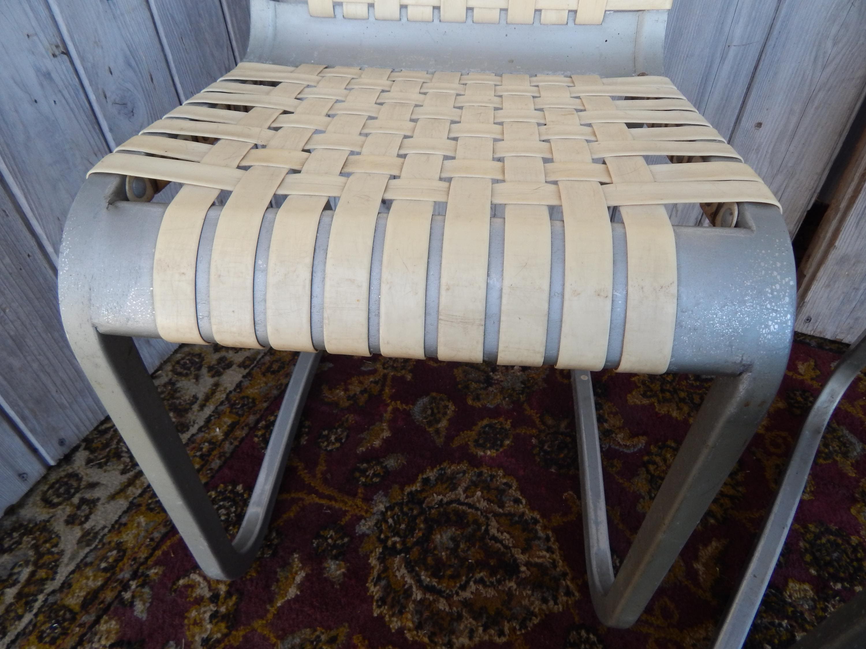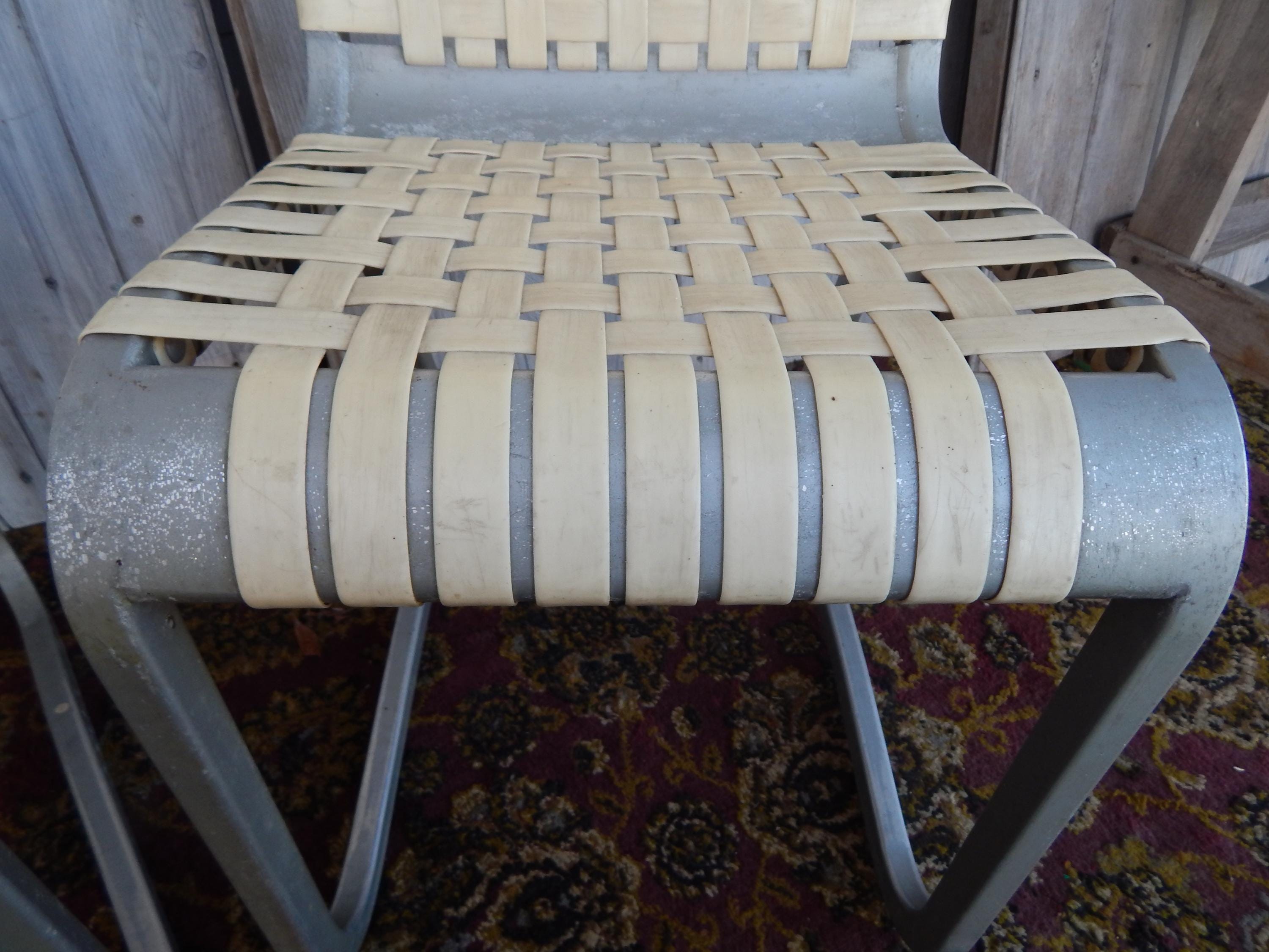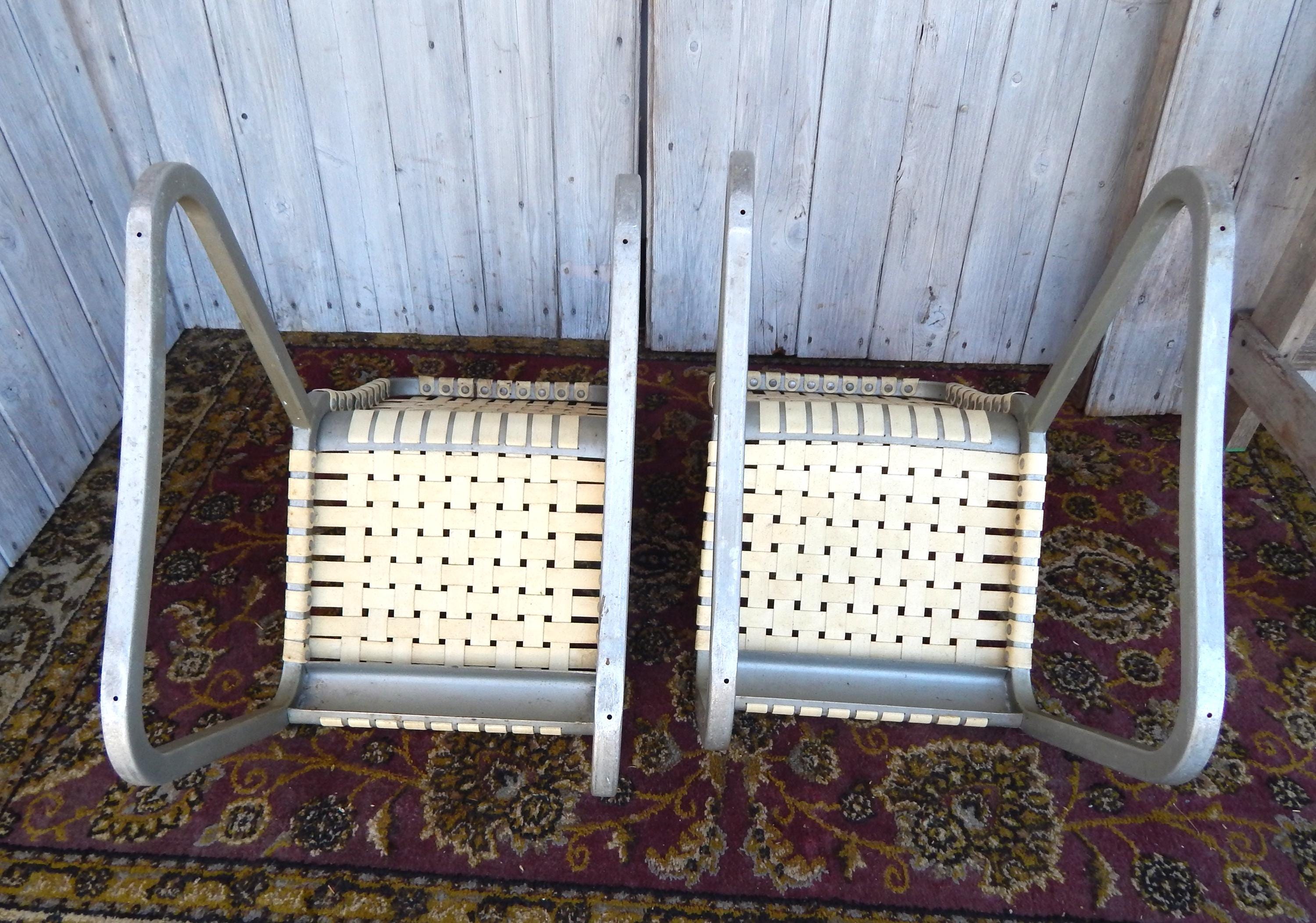 Very seldom seen and even more seldomly available are this pair of MCM aluminum frame strap chairs from the Pittsburgh Range Company in McKees Rocks, PA. (just up the Ohio river from downtown). Frames in excellent condition showing only the expected aging. No splits, cracks. Nothing bent or broken. Webbing is all present, with no splits or tears. A few straps show staining as seen in photos. I've seen ONE of these in 20 years and it had been redone in dark blue strapping. Very stunning. Each measures 34" at the back, are 16" wide with a seat height of 17.5". Price is for both.