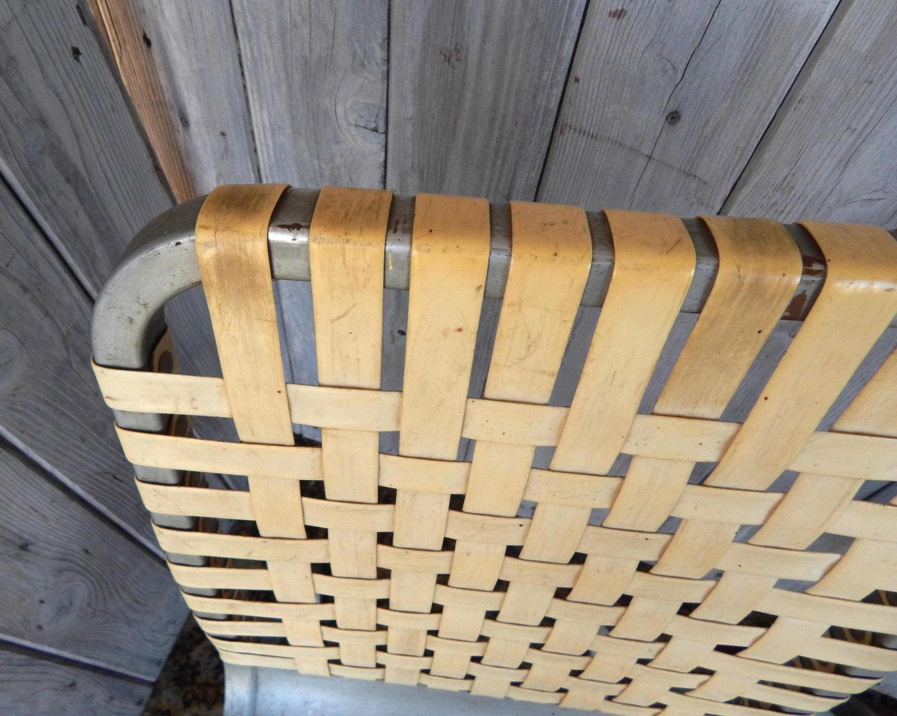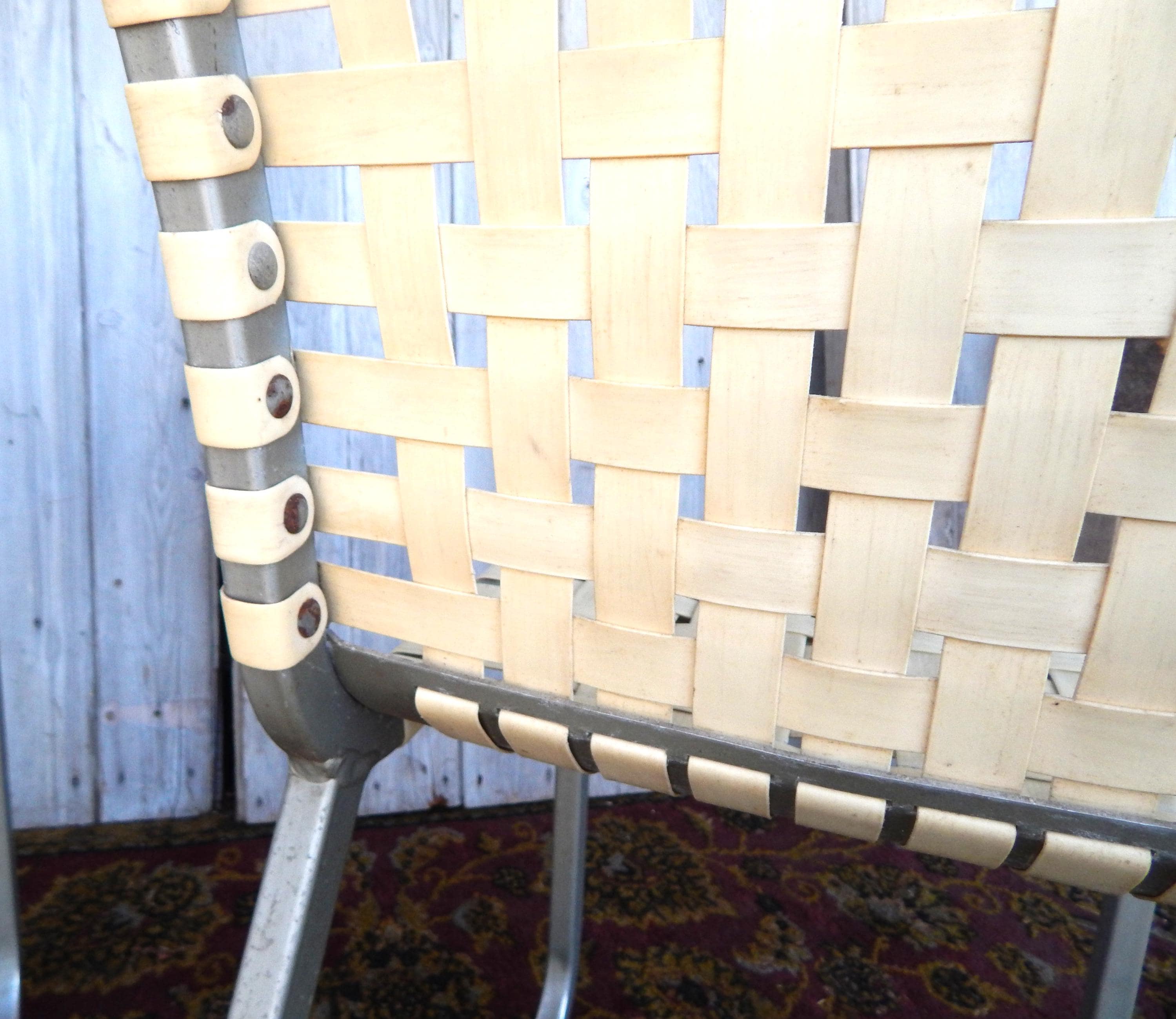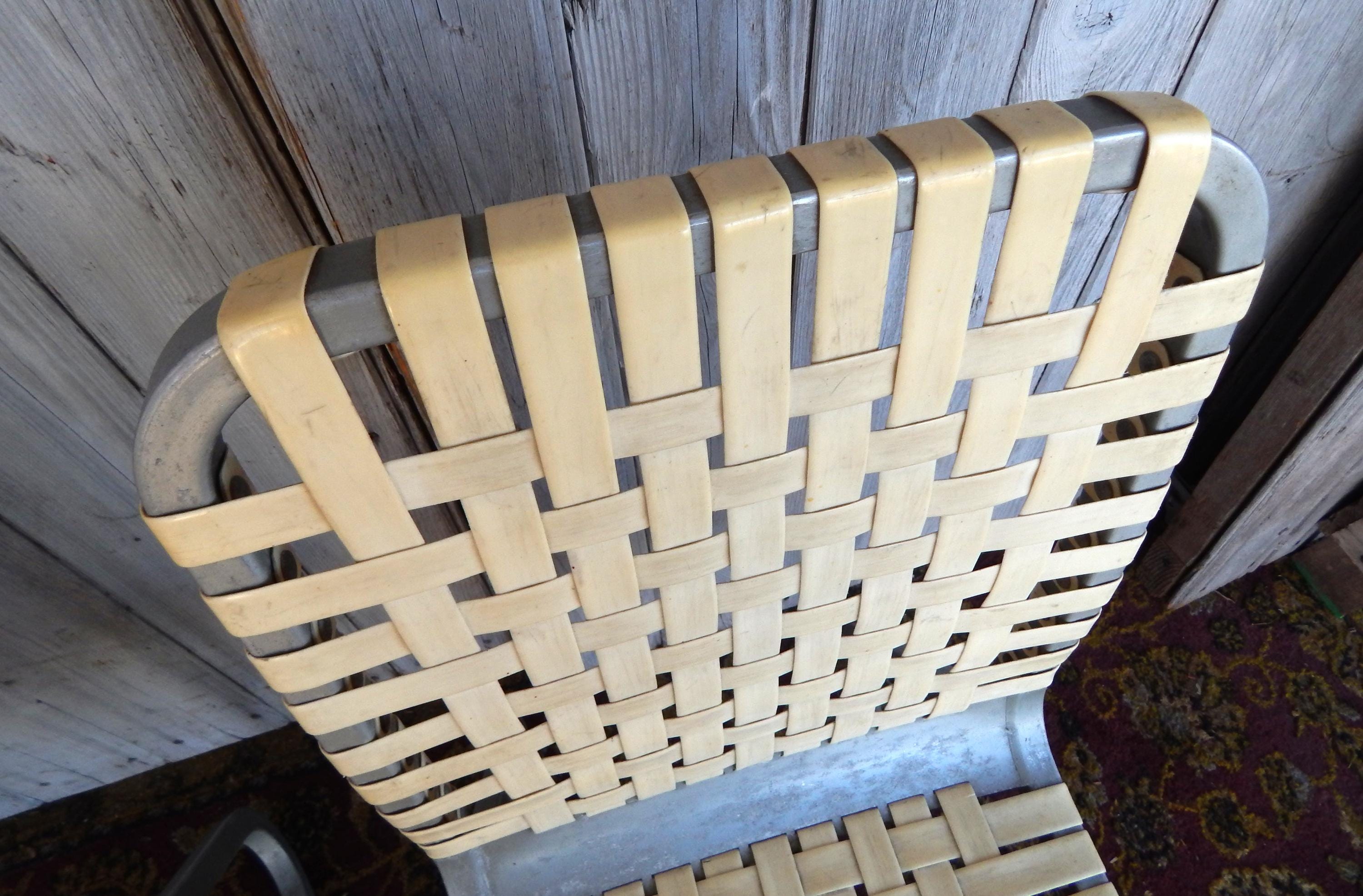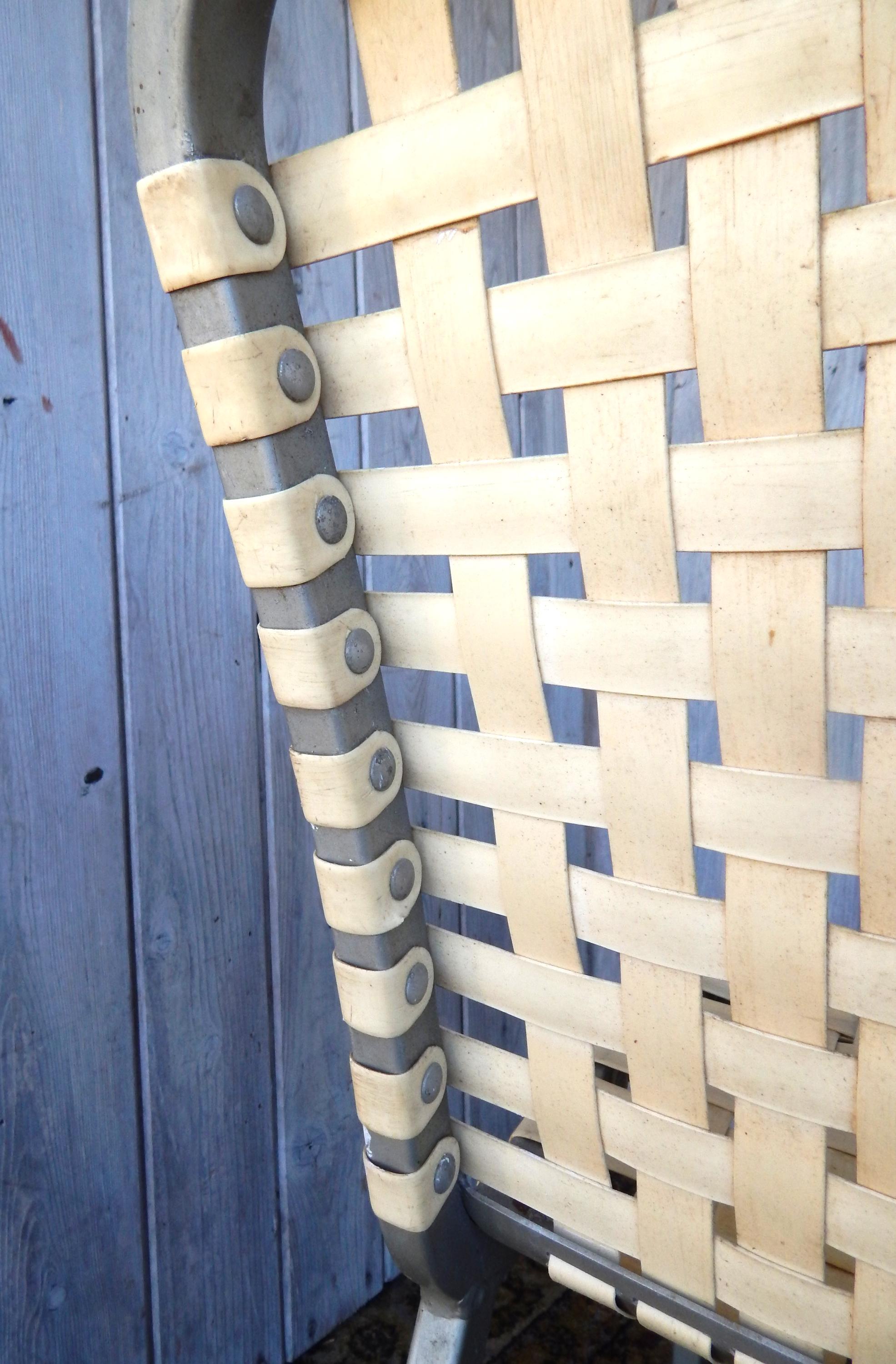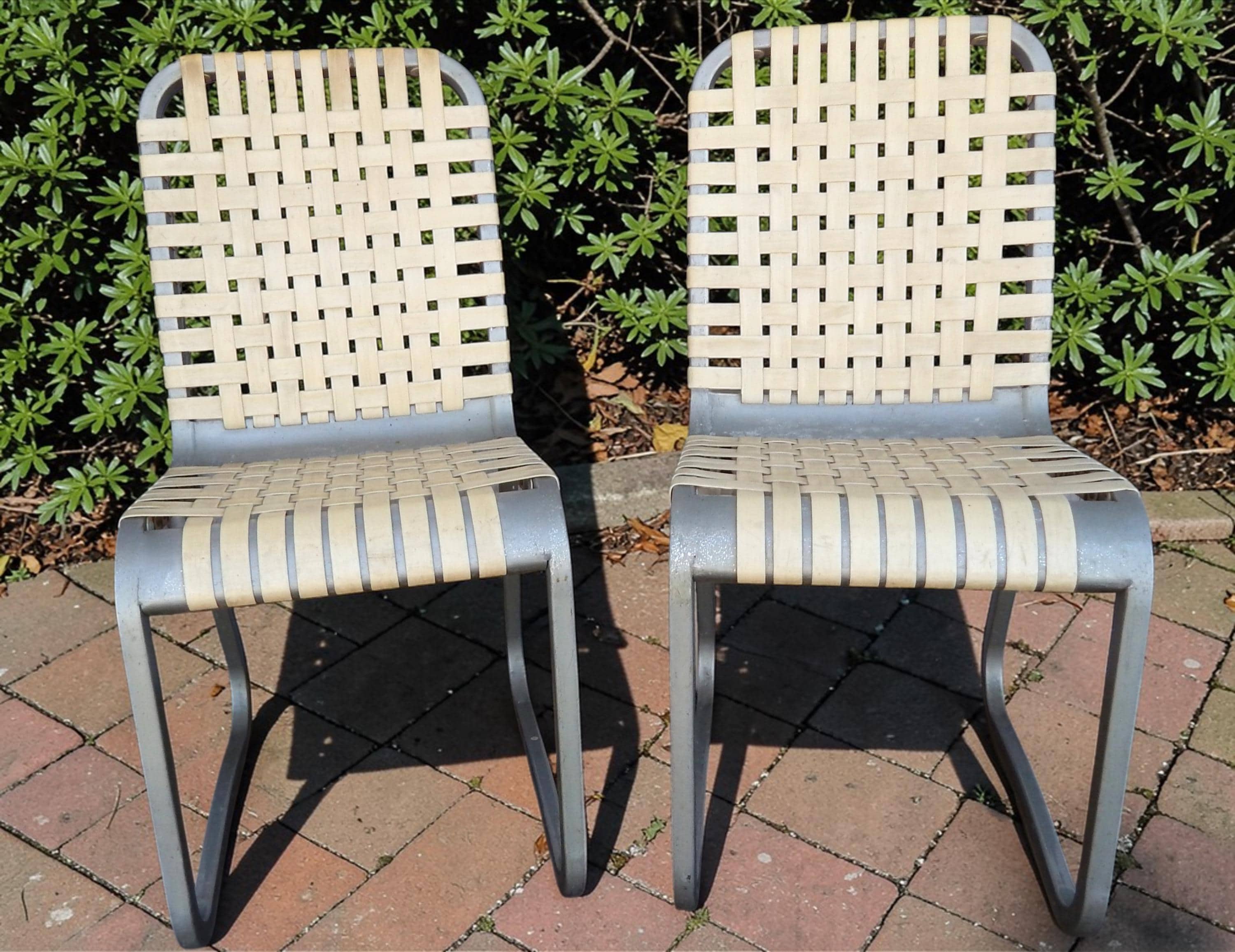 Very seldom seen and even more seldomly available are this pair of MCM aluminum frame strap chairs from the Pittsburgh Range Company in McKees Rocks, PA. (just up the Ohio river from downtown). Frames in excellent condition showing only the expected aging. No splits, cracks. Nothing bent or broken. Webbing is all present, with no splits or tears. A few straps show staining as seen in photos. I've seen ONE of these in 20 years and it had been redone in dark blue strapping. Very stunning. Each measures 34" at the back, are 16" wide with a seat height of 17.5". Price is for both.