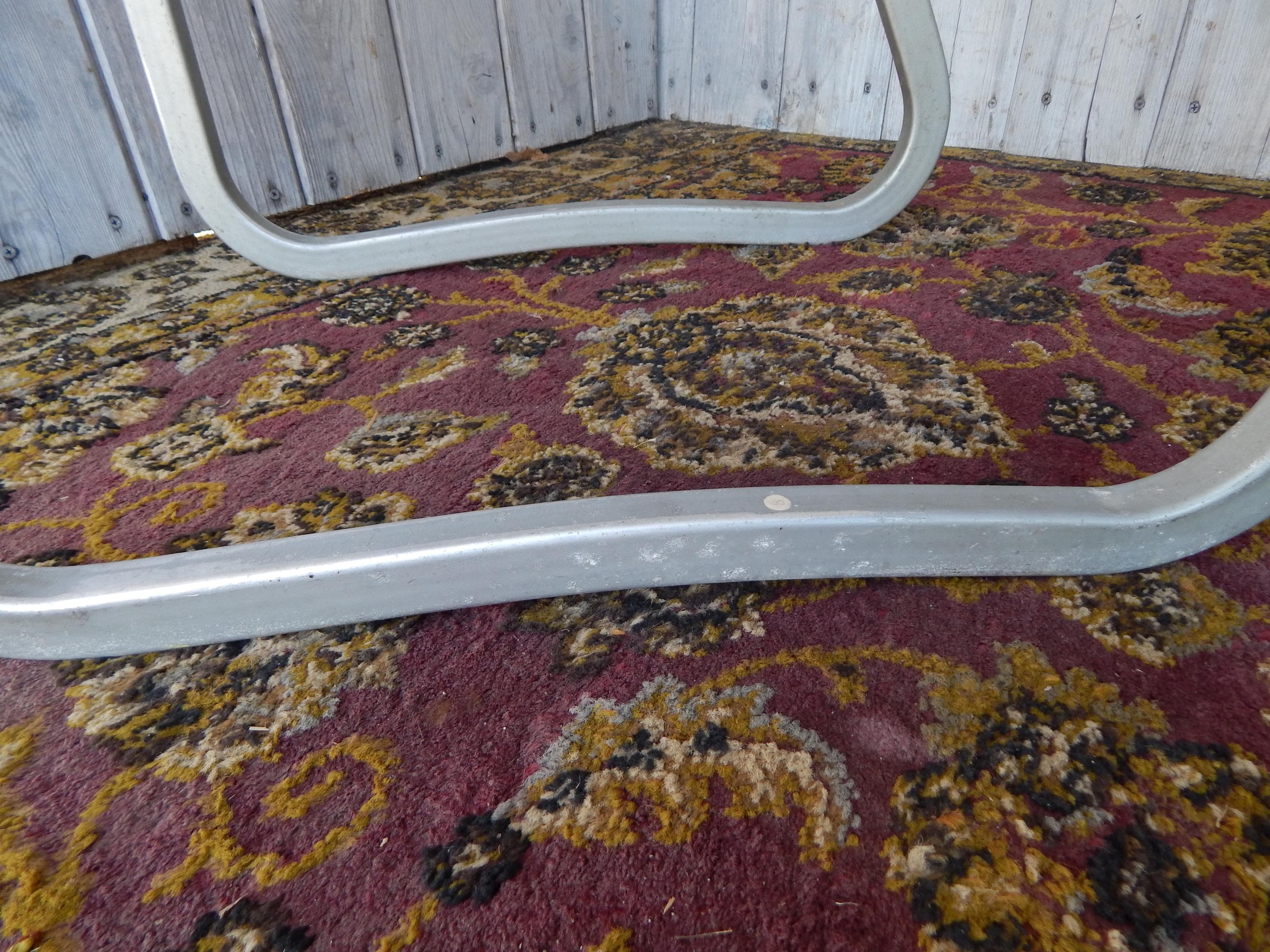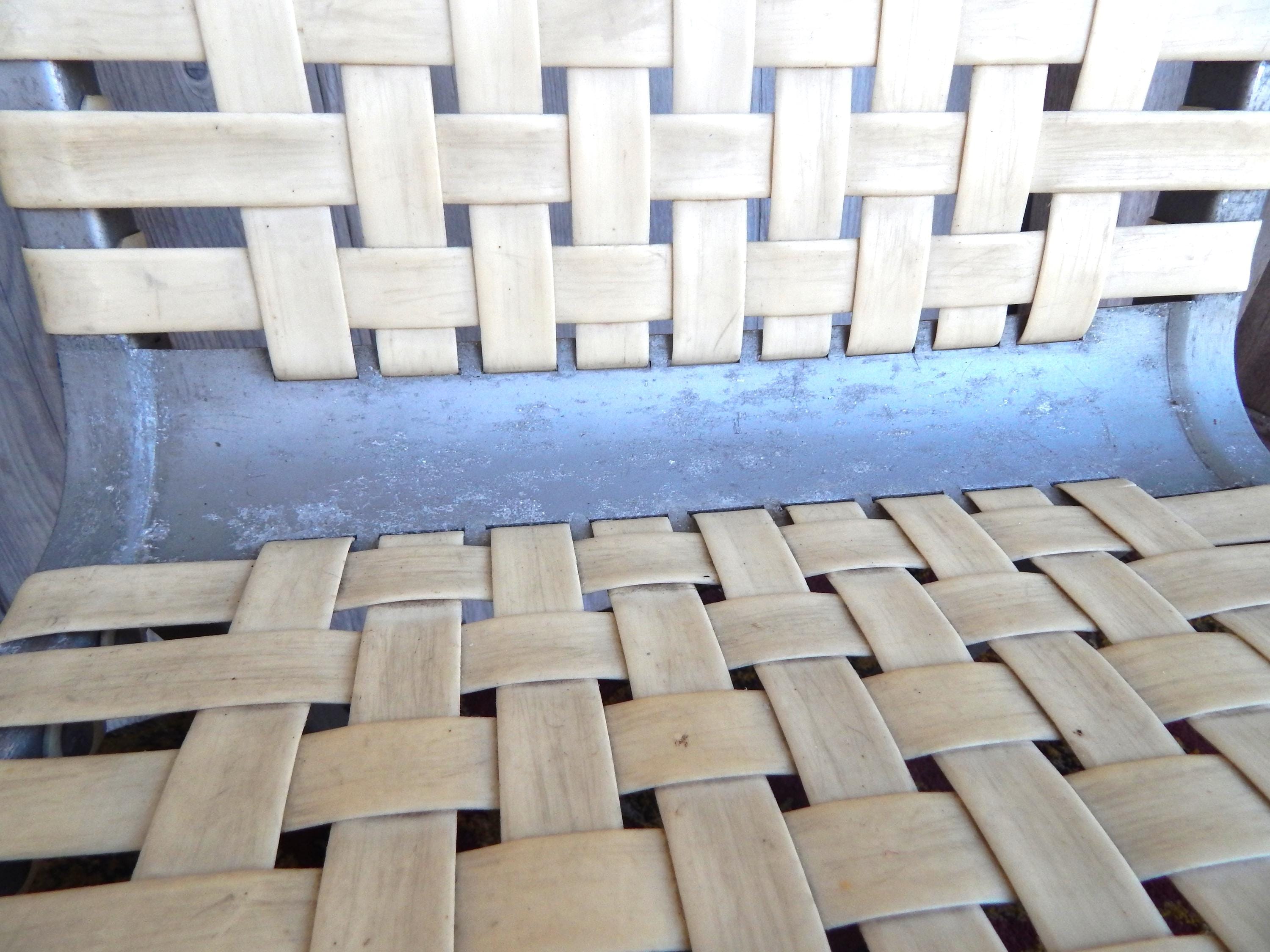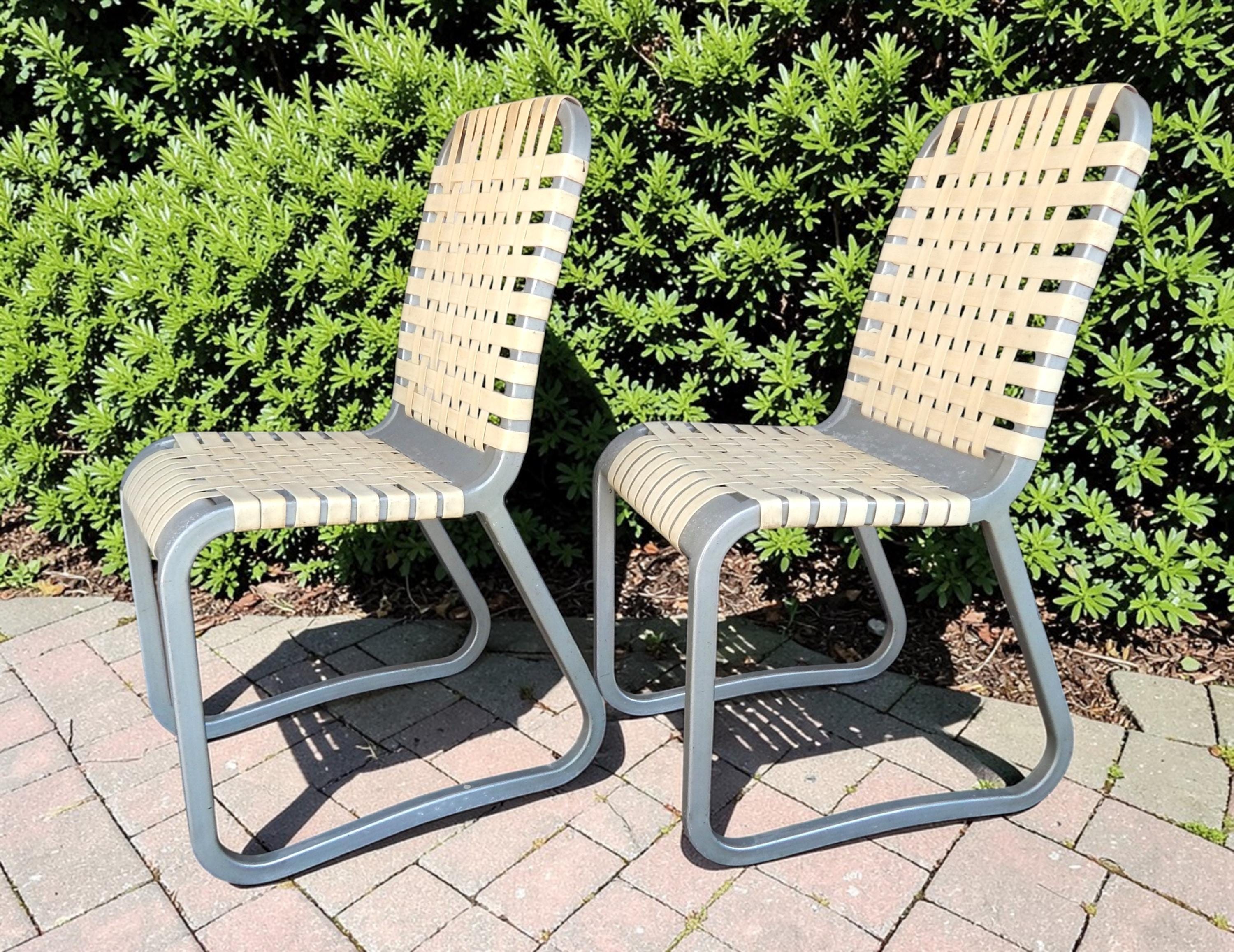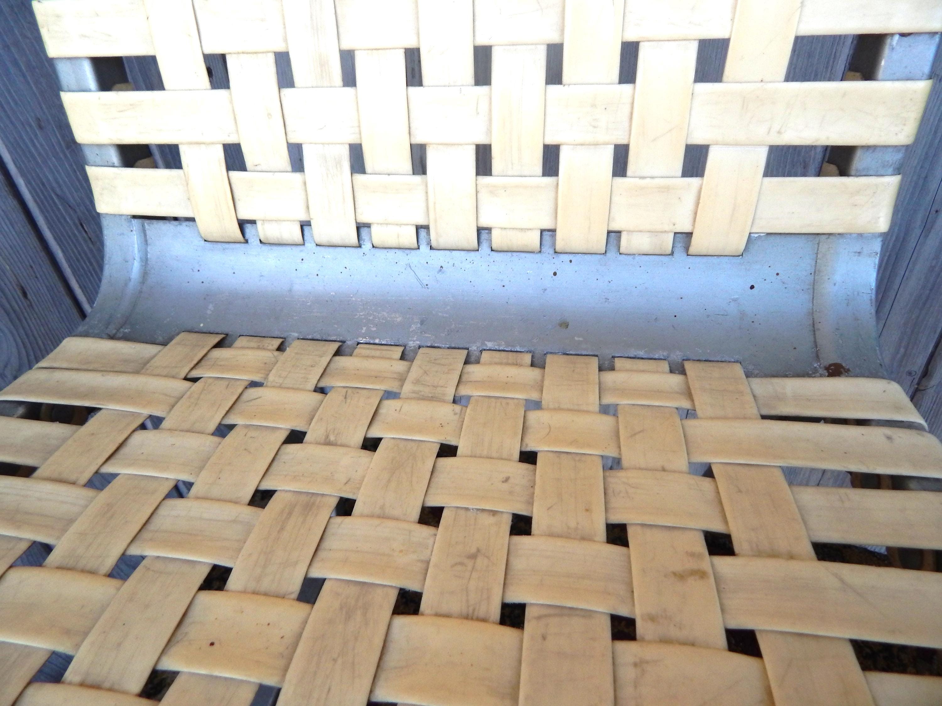 Very seldom seen and even more seldomly available are this pair of MCM aluminum frame strap chairs from the Pittsburgh Range Company in McKees Rocks, PA. (just up the Ohio river from downtown). Frames in excellent condition showing only the expected aging. No splits, cracks. Nothing bent or broken. Webbing is all present, with no splits or tears. A few straps show staining as seen in photos. I've seen ONE of these in 20 years and it had been redone in dark blue strapping. Very stunning. Each measures 34" at the back, are 16" wide with a seat height of 17.5". Price is for both.