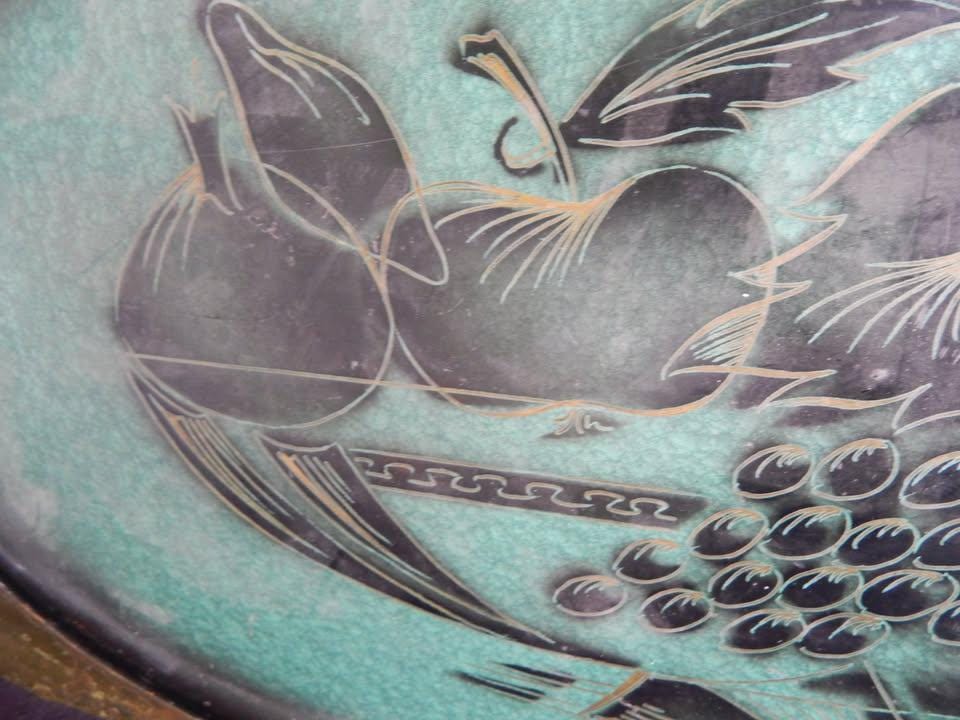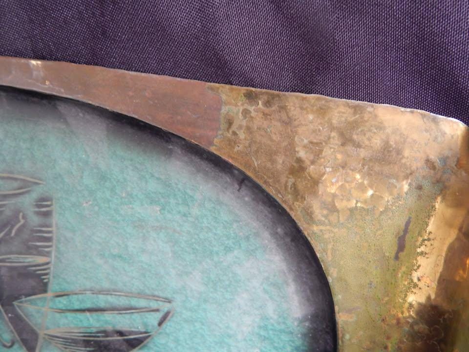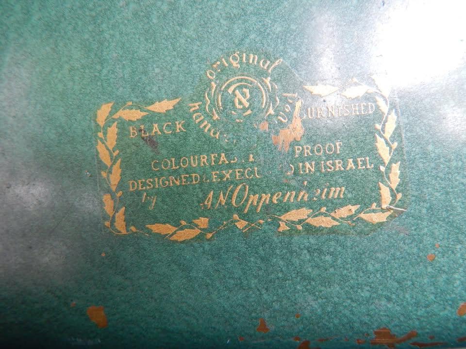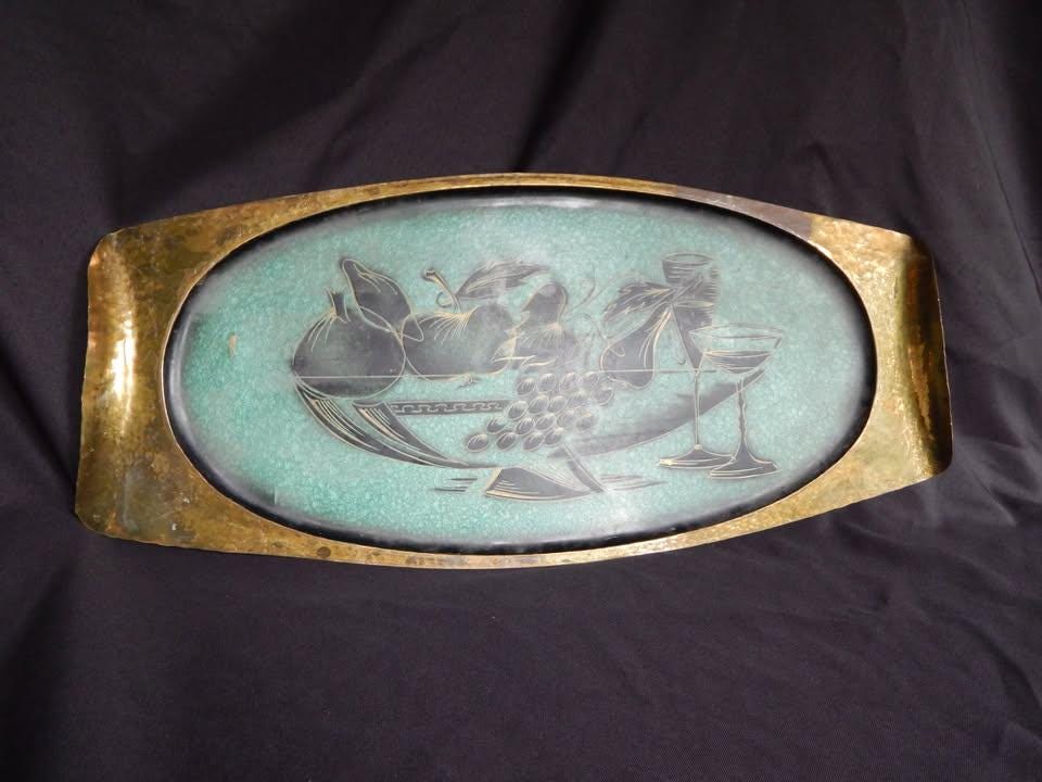 Vintage A.N. Oppenheim hand engraved, black burnished brass and enamel serving tray. Good over all condition. Some nicks, dings, etc. Measures 23 x 11.
