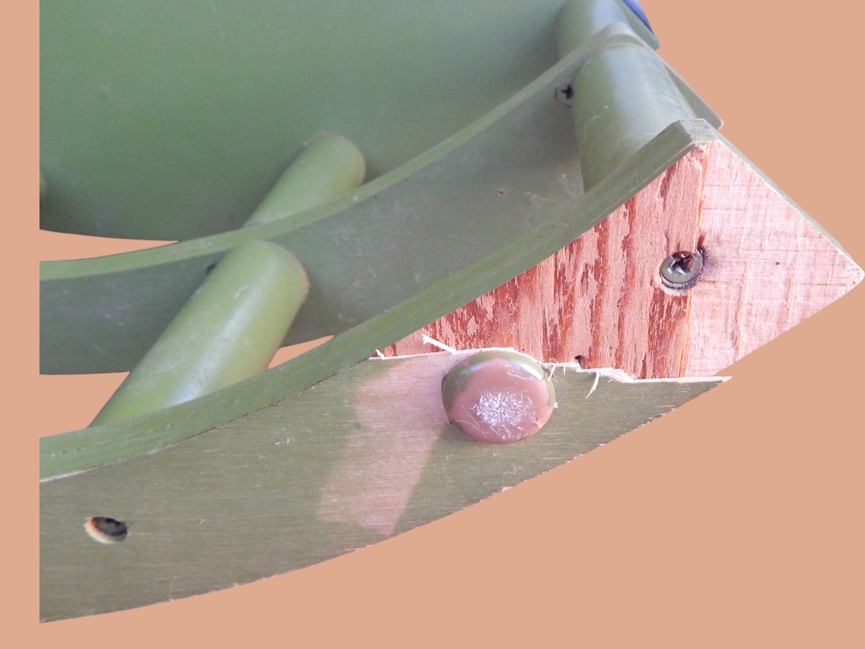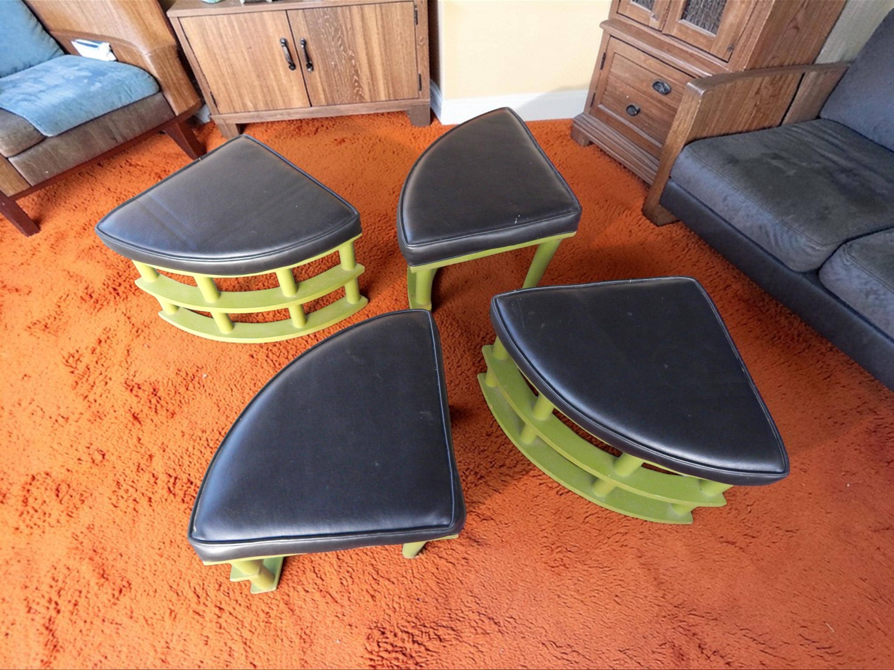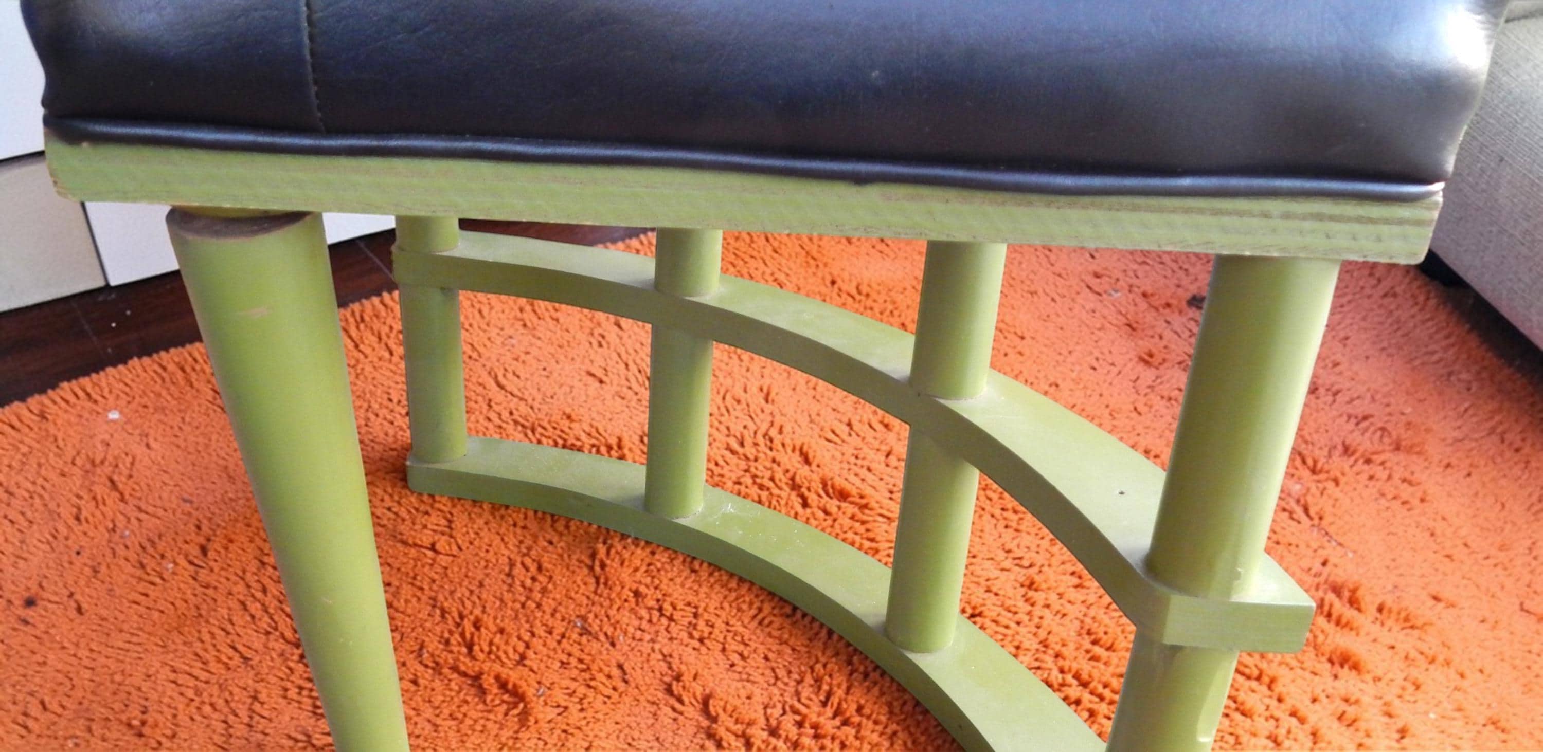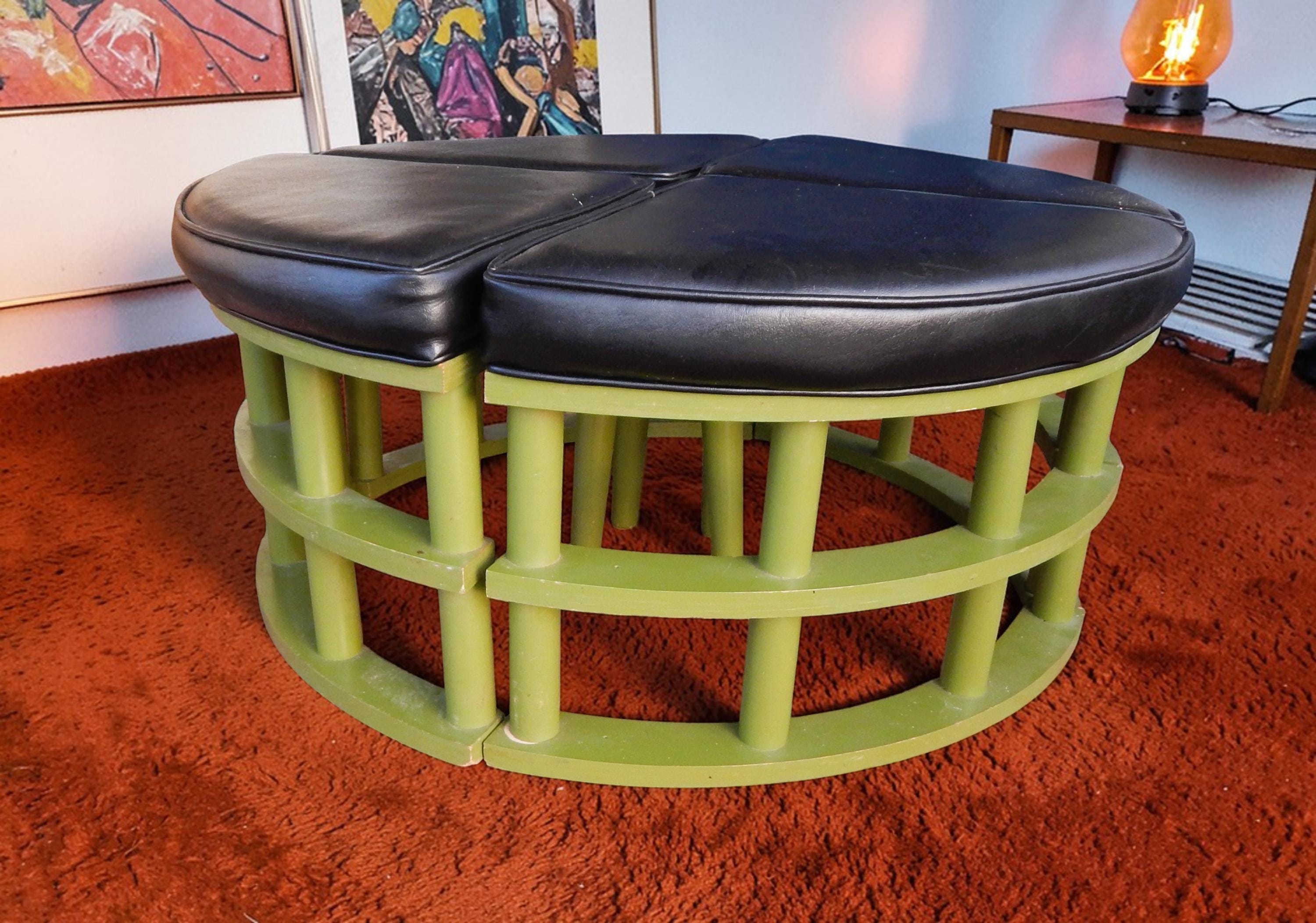 Veneered and painted wood with cushioned black vinyl seats. Note veneer loss under one section. Unseen and does not affect use or the way it sits on the floor. Very well built. No splits or cracks. Small flea bites from age and use. No tears or rips to the vinyl. Measures 32" in diameter and is 14" high. No maker mark found.